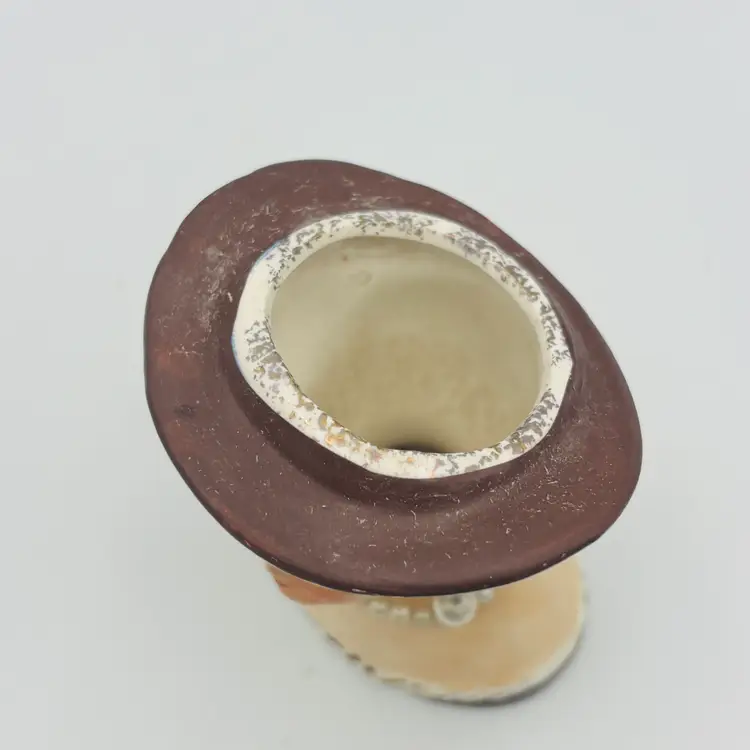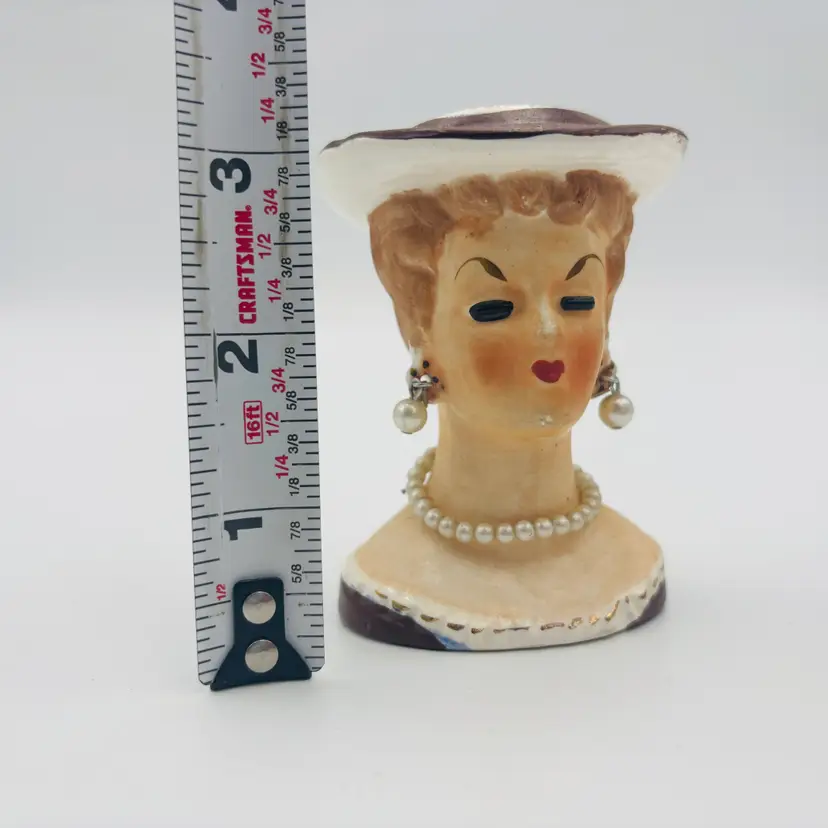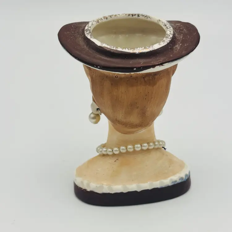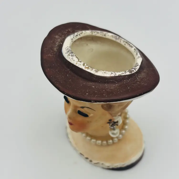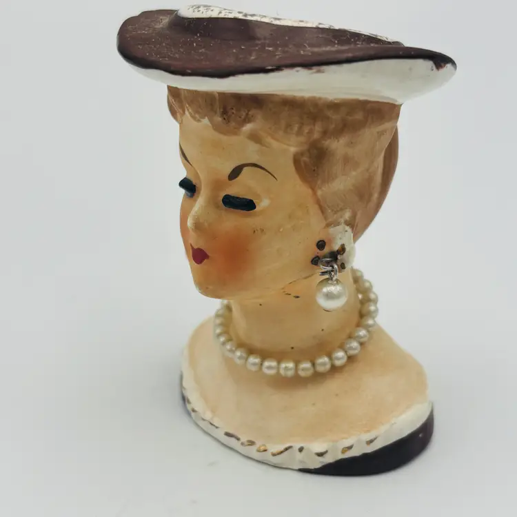 Details: Vintage ceramic lady head vase Blonde hair, black eyelashes Brown hat, Pearl-style dangle earrings and necklace Hand-painted features