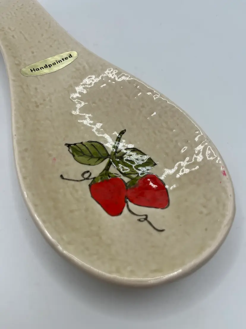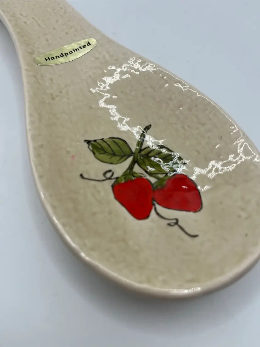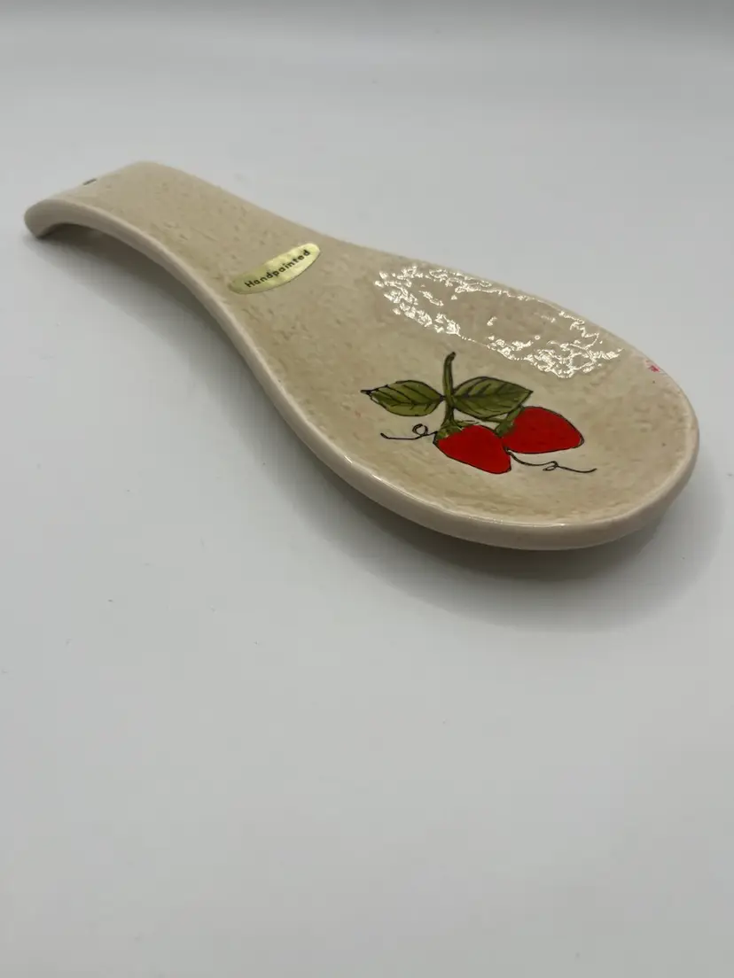 This vintage ceramic spoon rest is likely from the 1970s. The Hand-painted strawberries are adorable! Hang or rest on the counter/oven. Great condition, no chips or cracks 8” in length