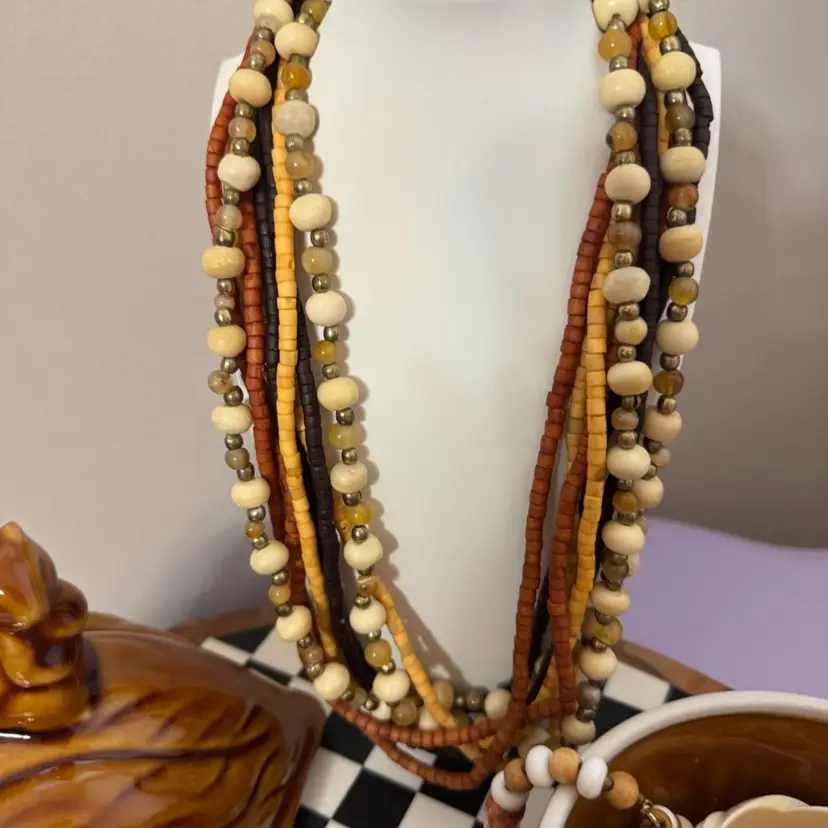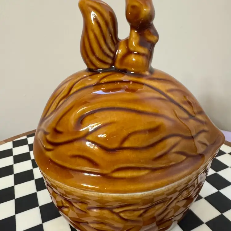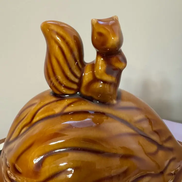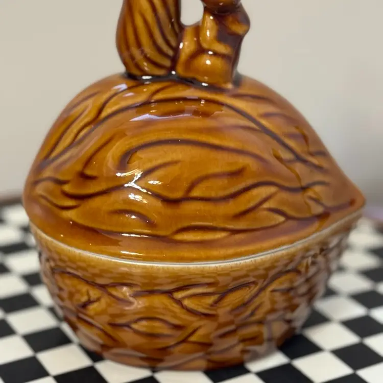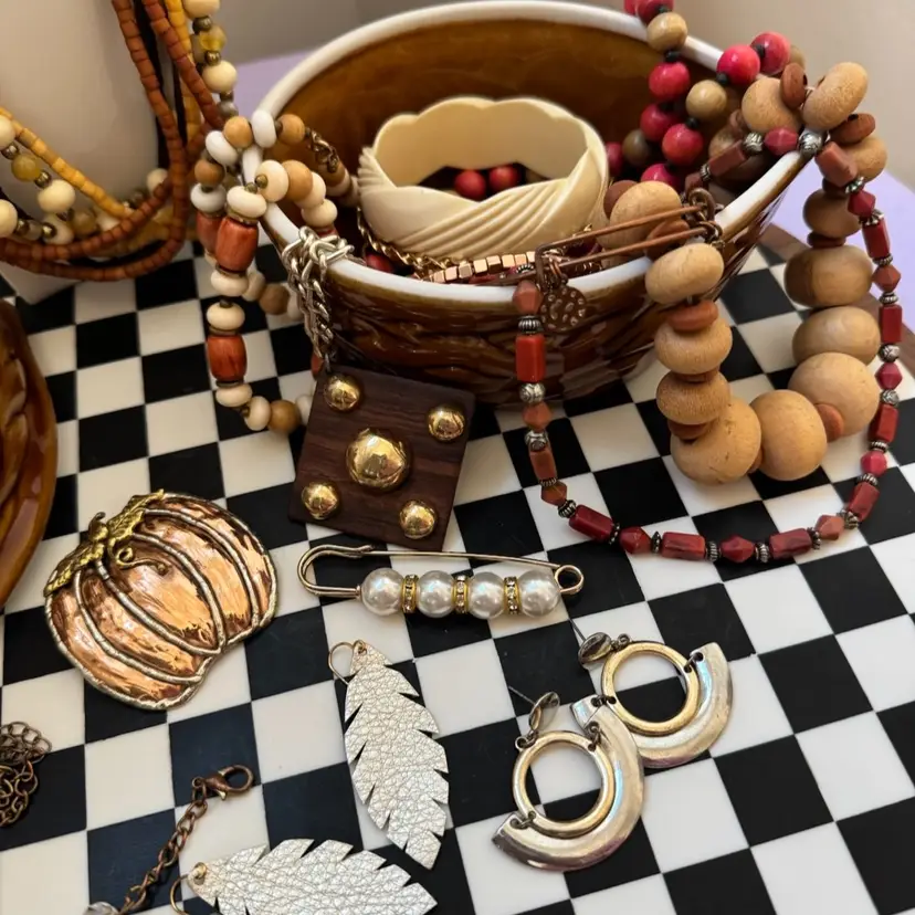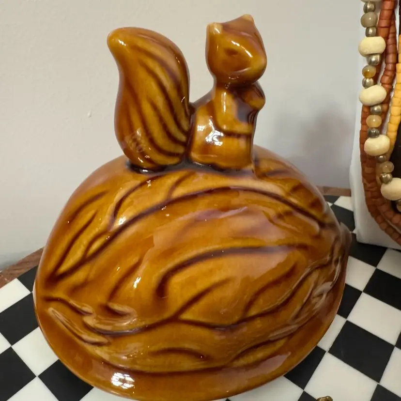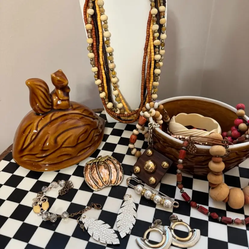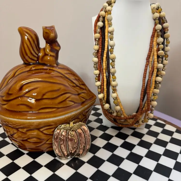 He’s just a squirrel trying to get a nut! A vintage squirrel trinket box filled with vintage and modern jewelry mix! Everything you need for fall! Nice assortment of wood, leather, and stone mix necklaces, earrings, and bracelets. Trinket box measures about 8“ x 7“.