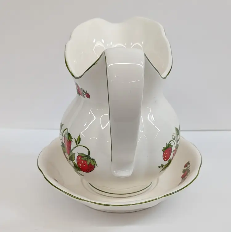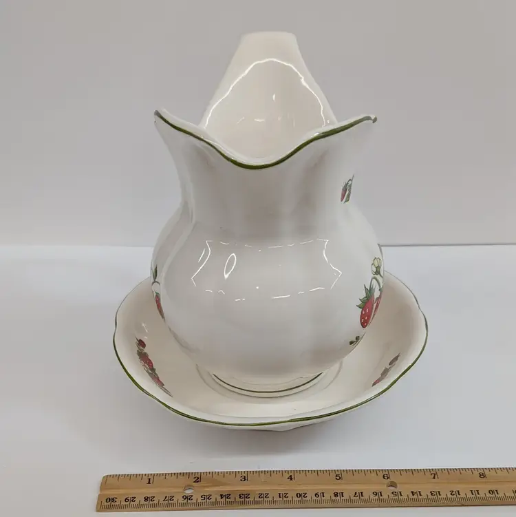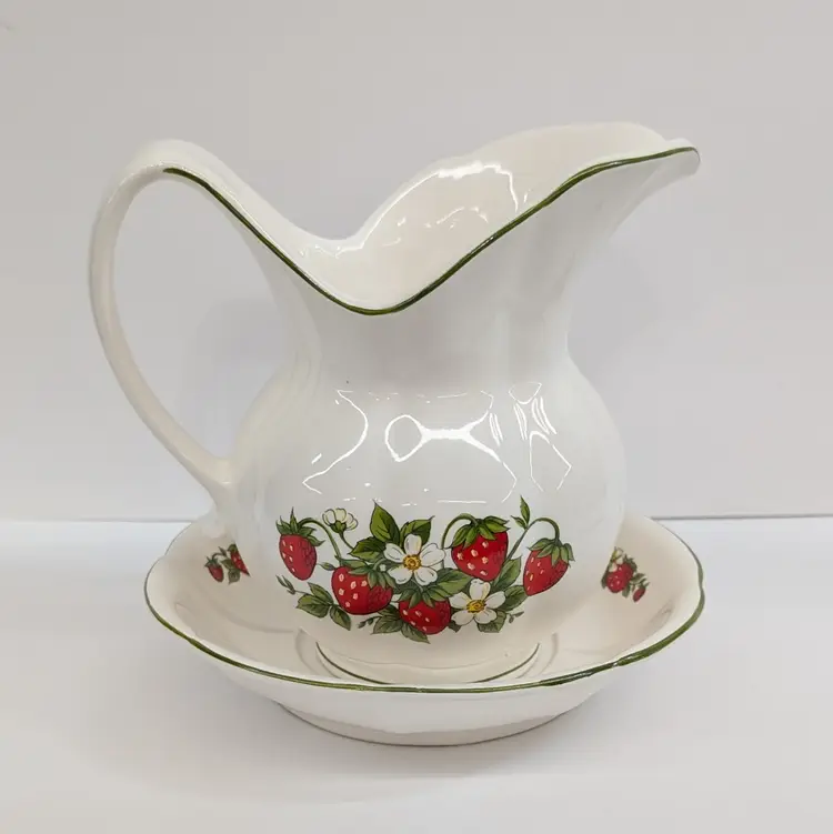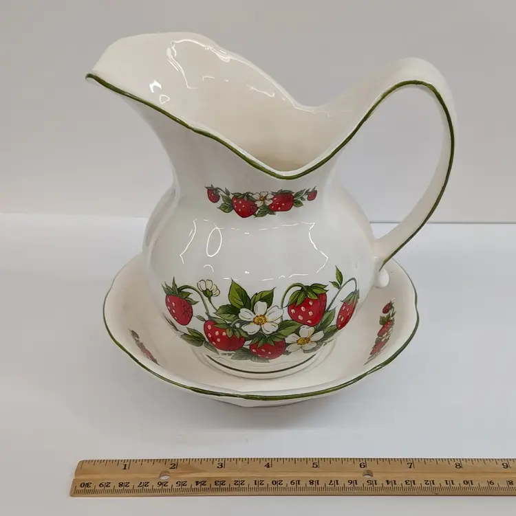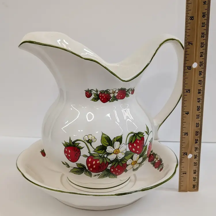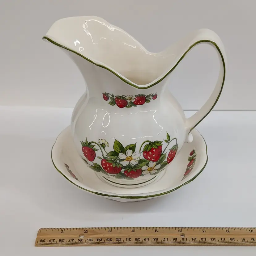 Cute, little water pitcher and basin/bowl with a strawberry and blossom pattern and green edging. Made in Japan and in nice, used condition with no chips or cracks. Measurements ~ 8 x 7 x 7.25"