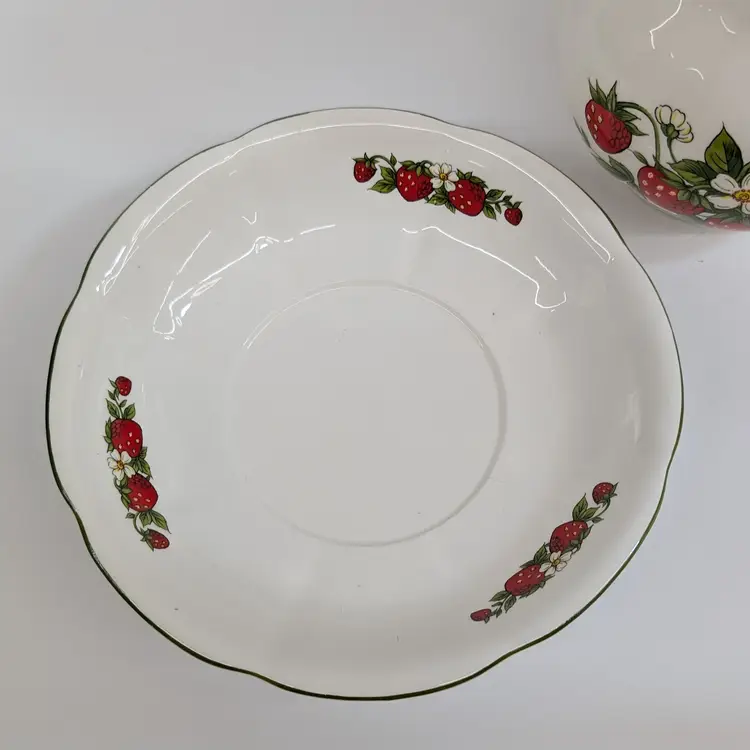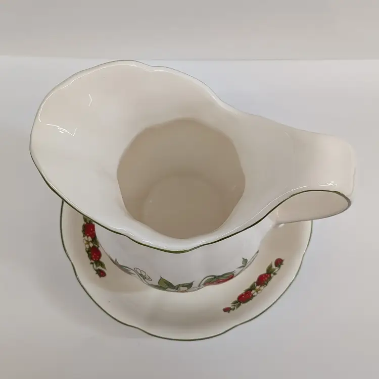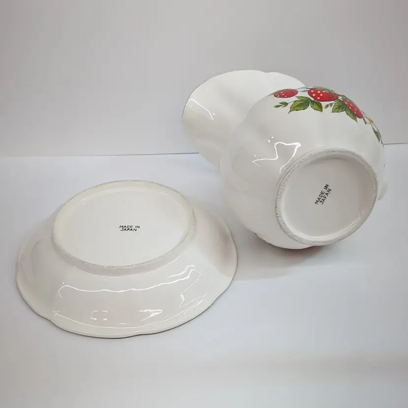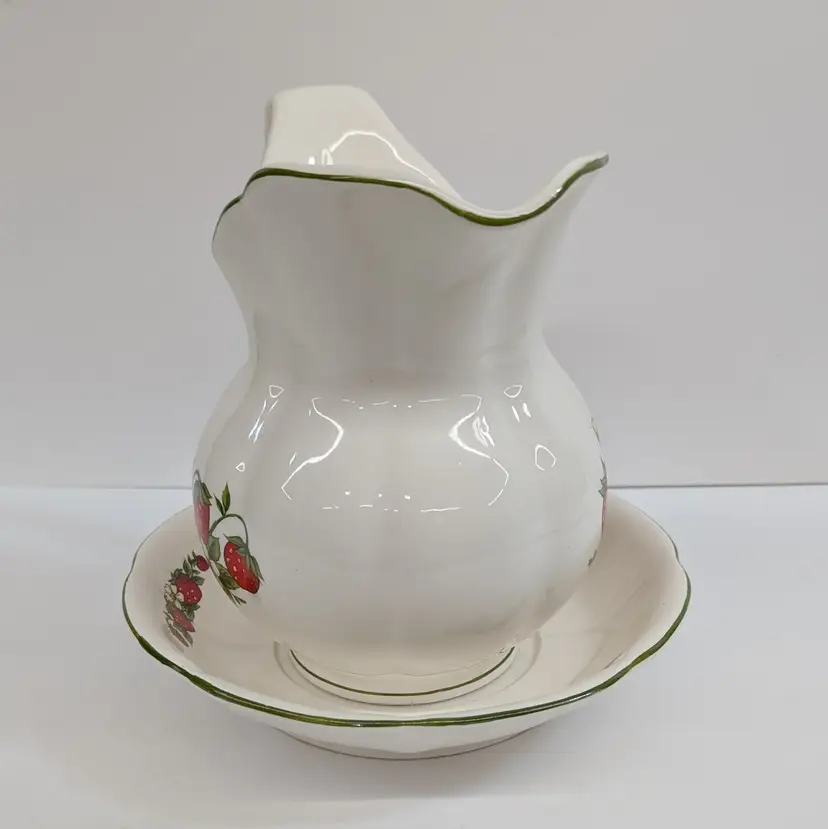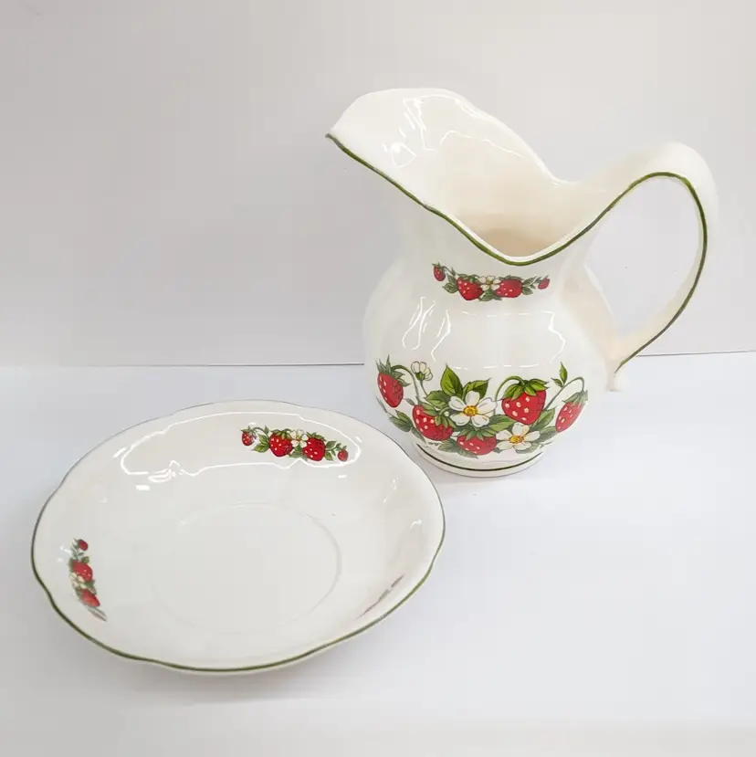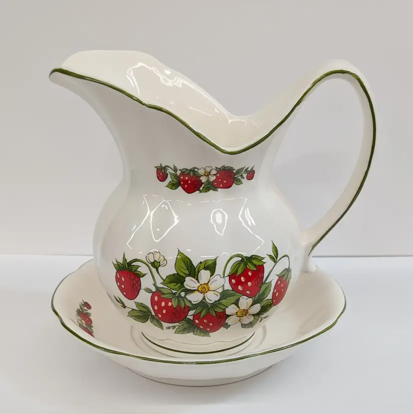 Cute, little water pitcher and basin/bowl with a strawberry and blossom pattern and green edging. Made in Japan and in nice, used condition with no chips or cracks. Measurements ~ 8 x 7 x 7.25"