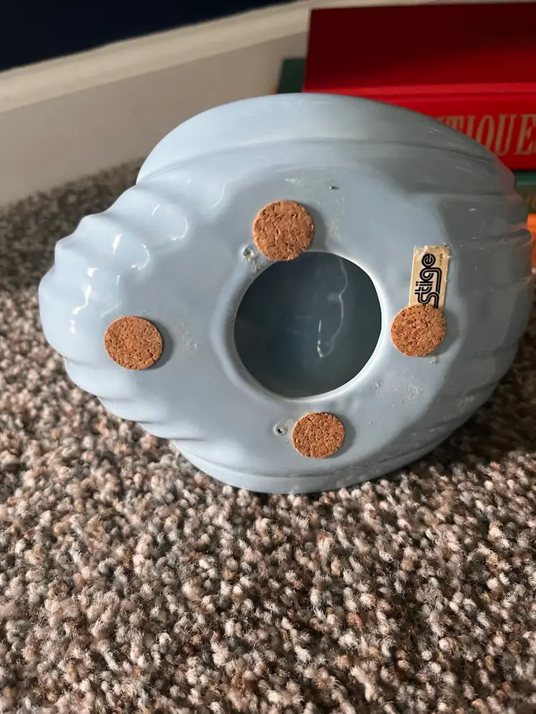 This swan is pale blue in color. The sticker on the bottom says stige Japan.