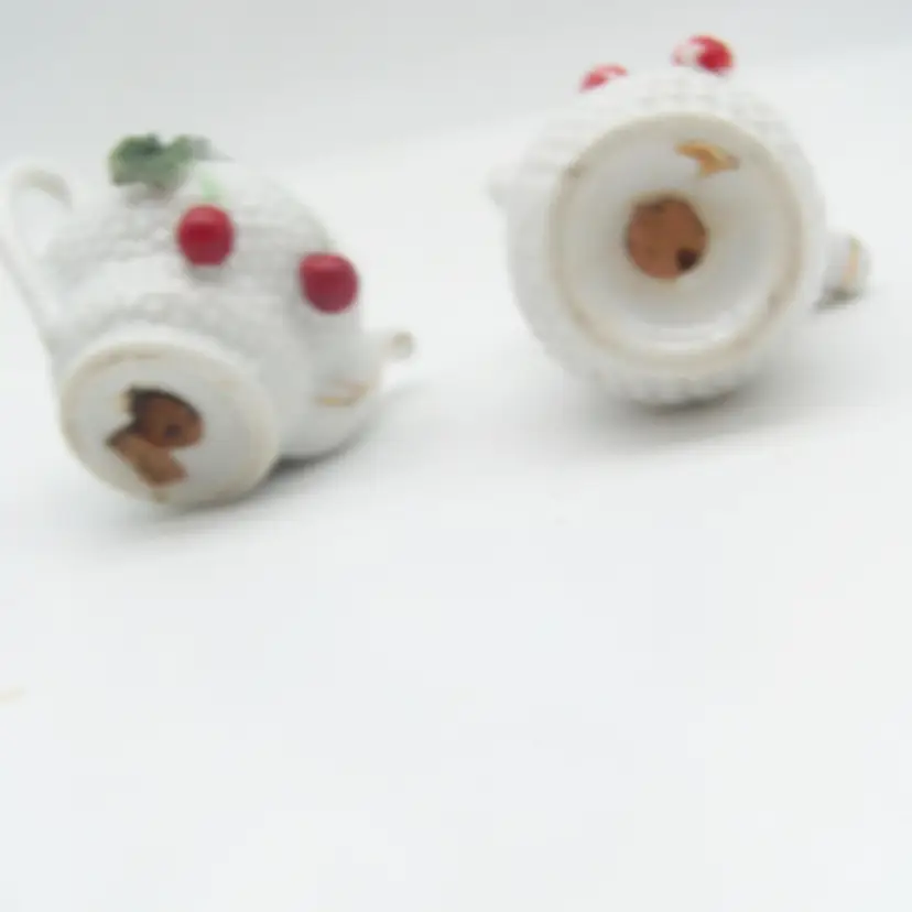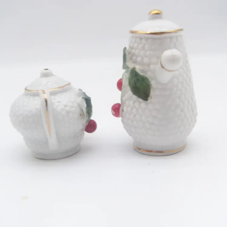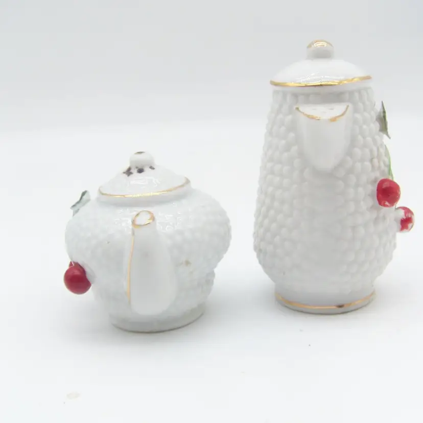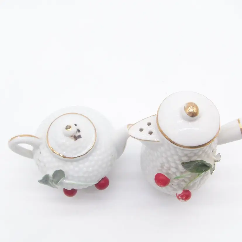 Vintage ceramic teapot and coffeepot salt and pepper shakers. The leaves on the teapot at chipped and on the coffeepot no chips but the cherries are missing paint as shown in the photos. They have the original cork stoppers. the coffeepot is 3.5" tall and the teapot is 2.25" tall.
