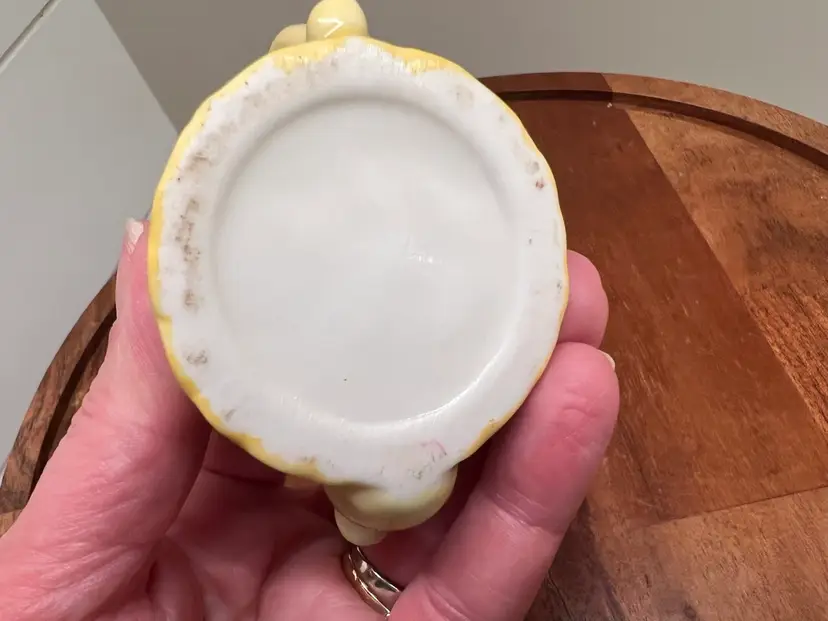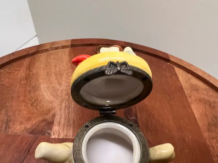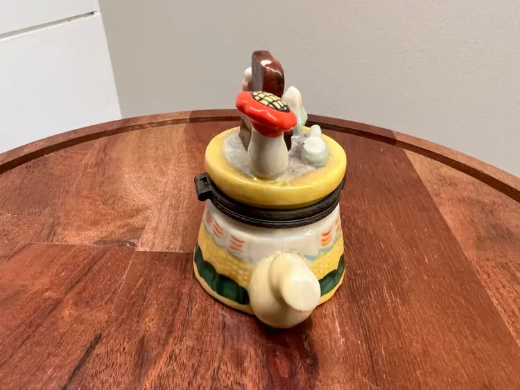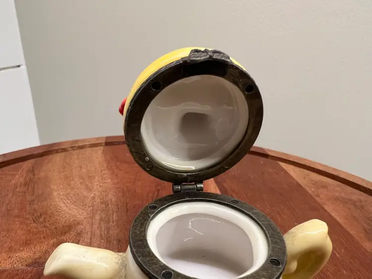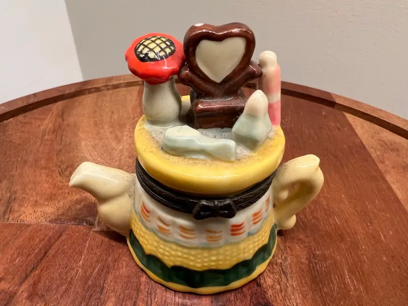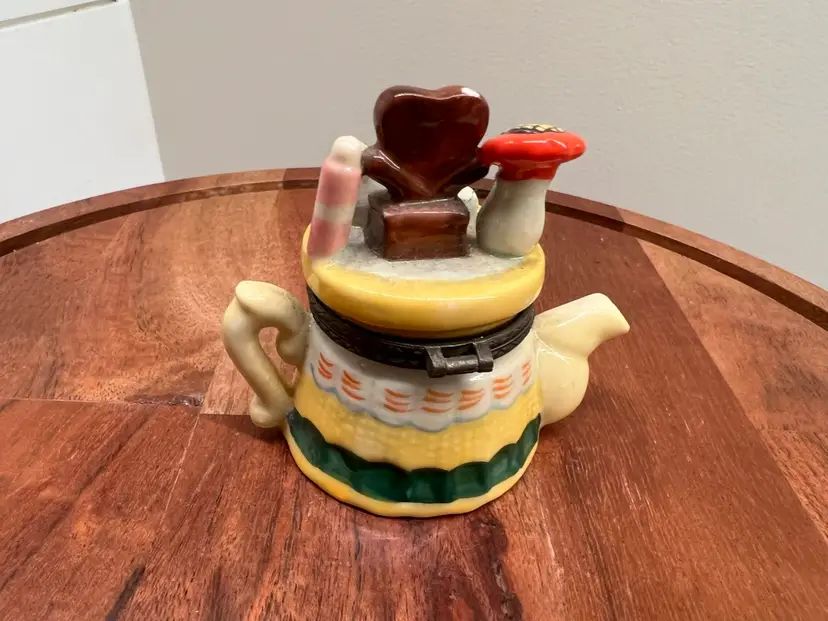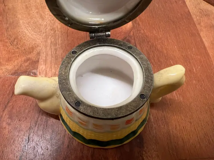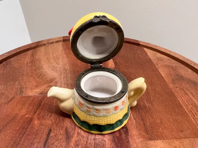 Adorable mini ceramic trinket box. Looks like a teapot on the outside and lid opens to the inside. Would be perfect for jewelry, medicine, etc.