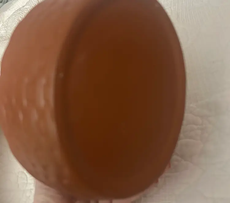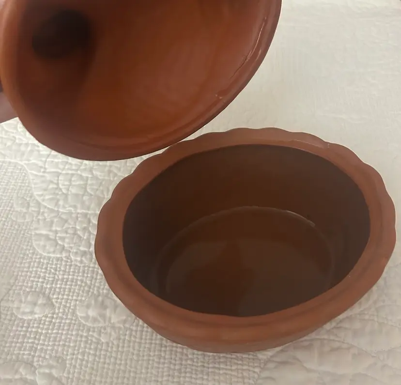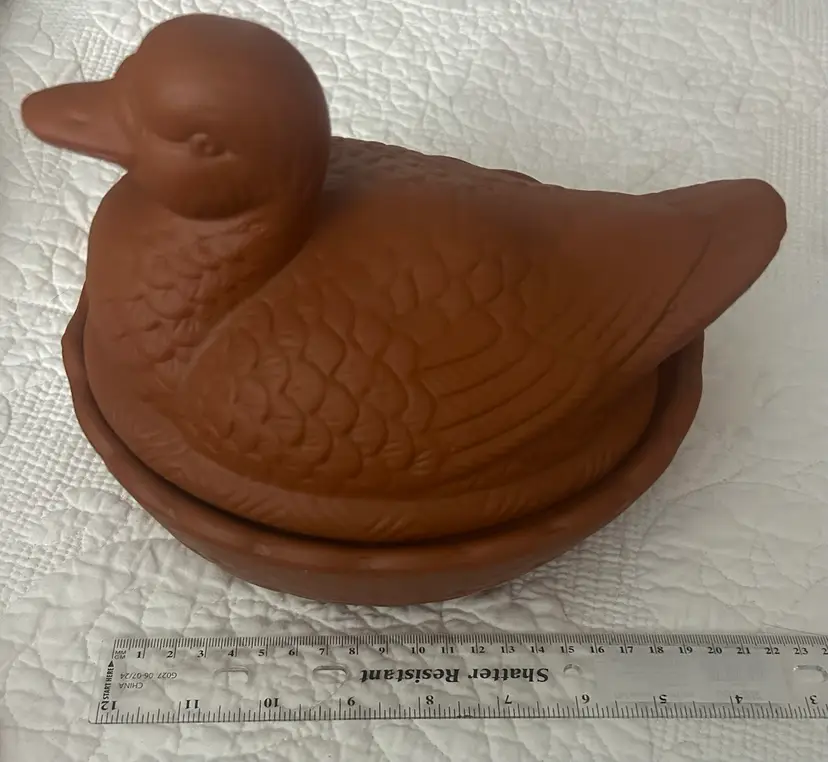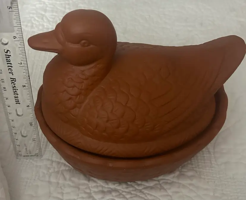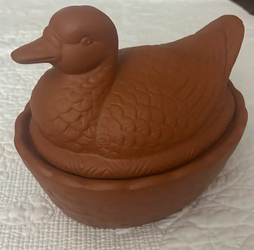 The product is a vintage terracotta duck figurine sitting on a nest, handcrafted from clay. This unique piece features a quaint duck design, perfect for collectors or those looking to add a touch of rustic charm to their home decor. The handmade craftsmanship adds to the authenticity and charm of this charming figurine, making it a special and one-of-a-kind addition to any space. Measures 7x7 approximately.