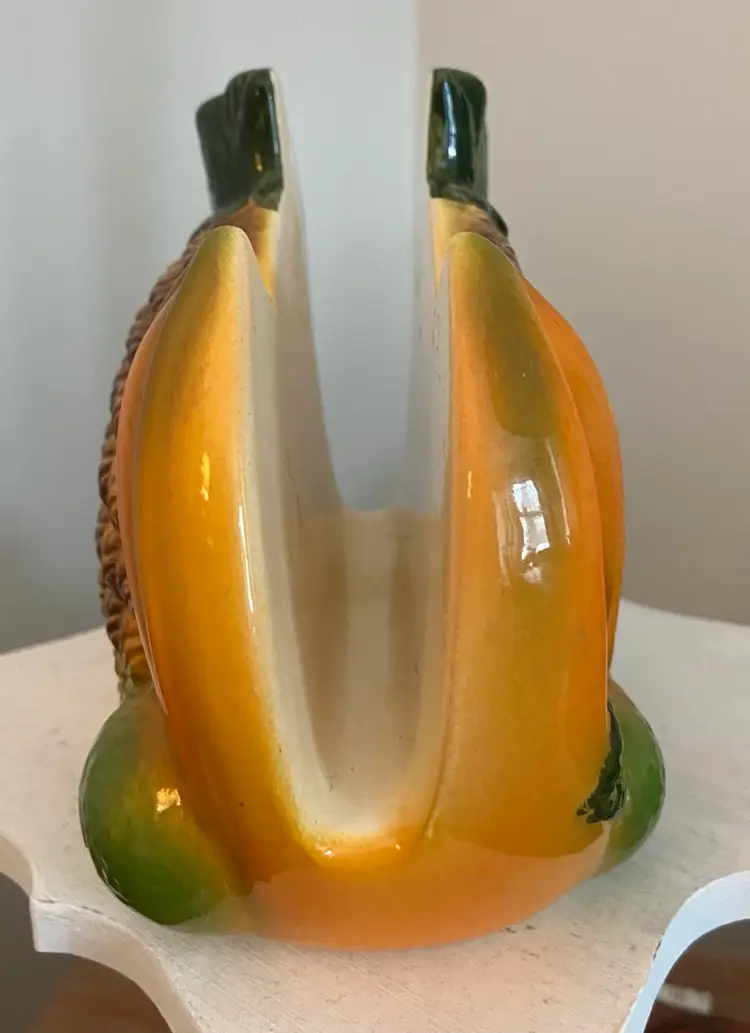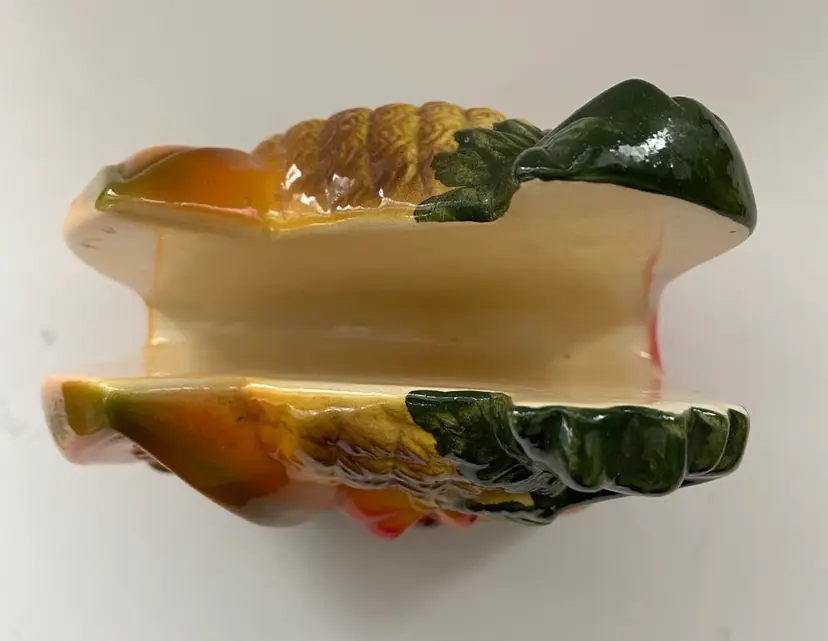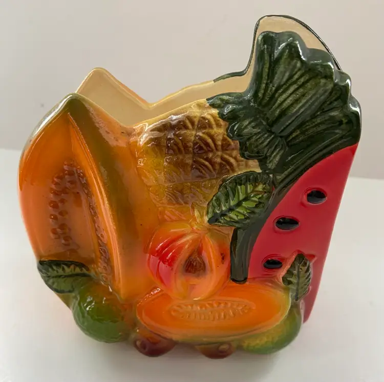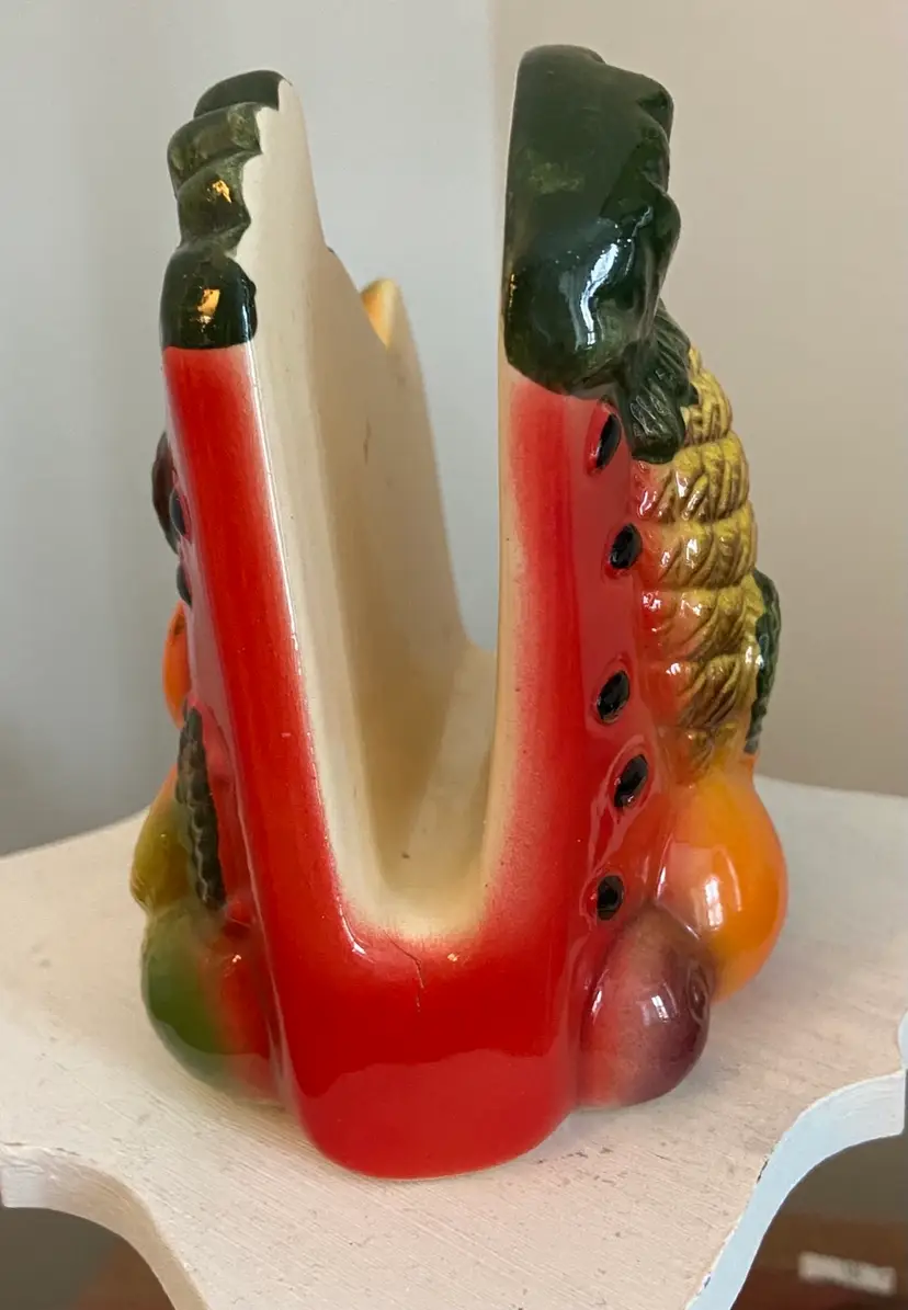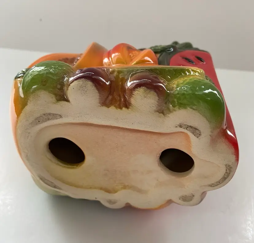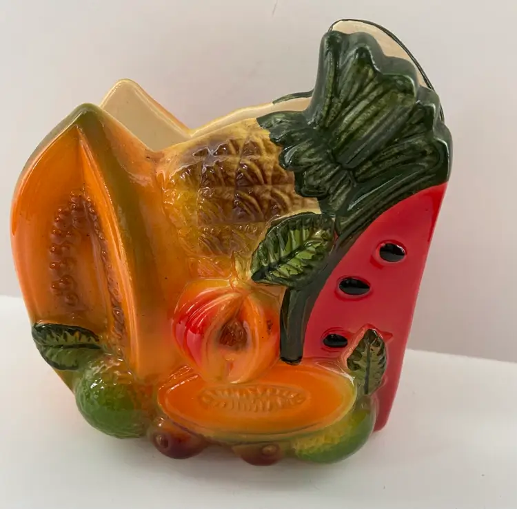 Cute ceramic napkin holder that is a colorful blend of tropical fruit. The paint is vibrant and the item has no condition issues. There is a faint marking on the bottom, but I am not able to read.