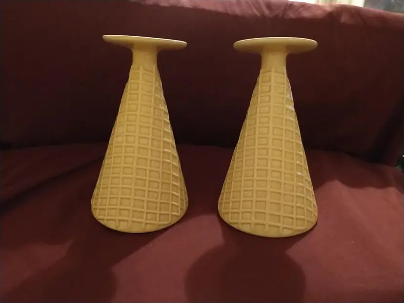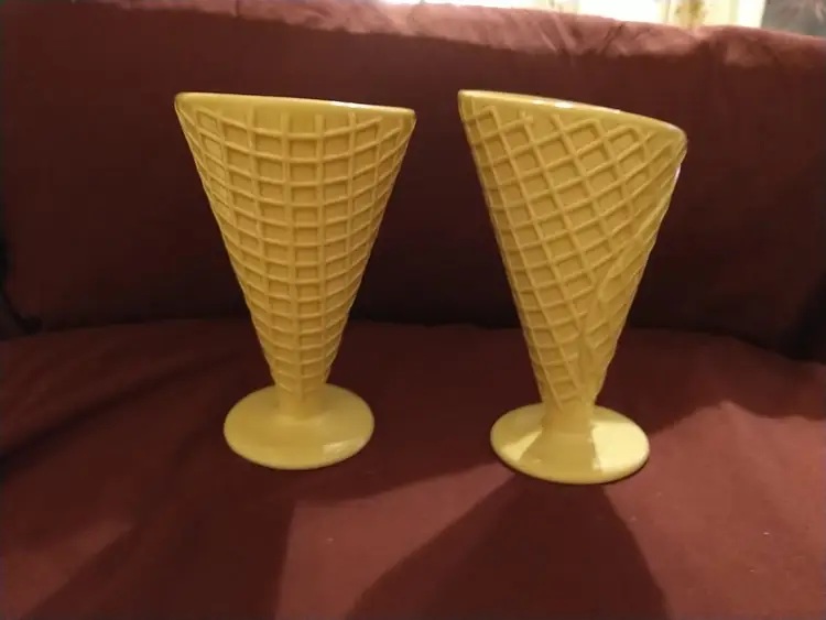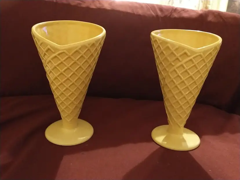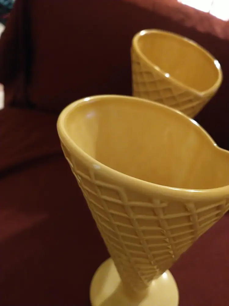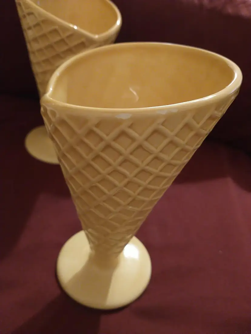 Indulge in a touch of nostalgia with these charming vintage ceramic ice cream cups, designed to mimic the classic waffle cone. Perfect for serving your favorite scoops or as a delightful addition to your collectibles. Each cup measures approximately 7 inches in height and 3 inches in diameter at the opening.There are a few tiny paint chips as seen in photos.No cracks or ceramic chipping.