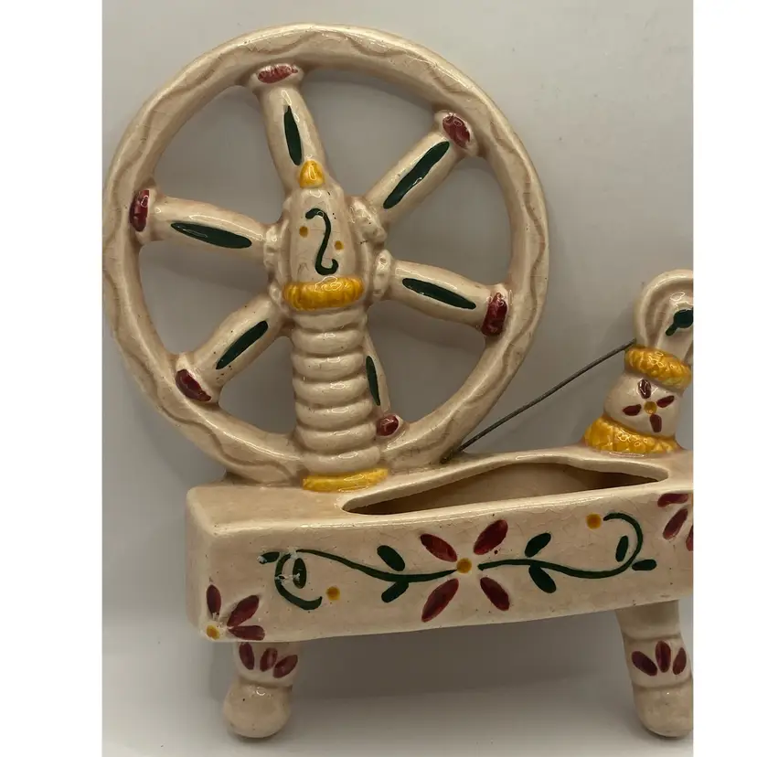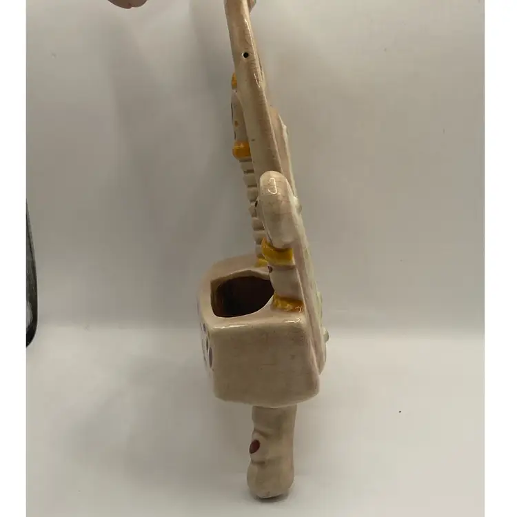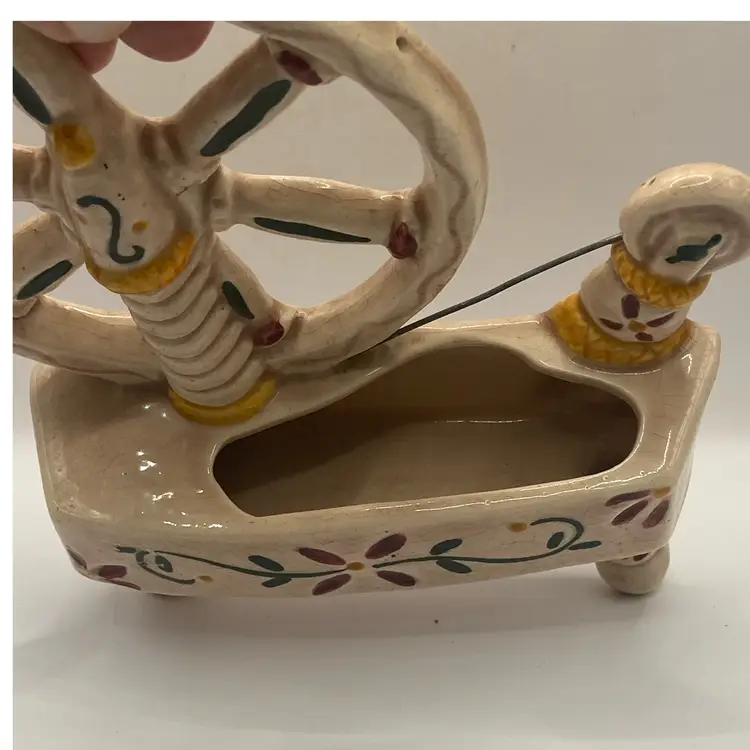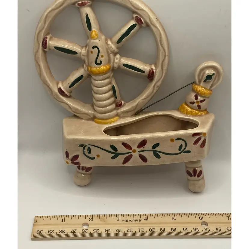 This cutie is 7 1/2” tall 6 1/2” long and 2 1/2” wide. It has California stamped on back. It is a wall pocket and will not stand alone. In good shape with some wear and discoloration that is expected with age.