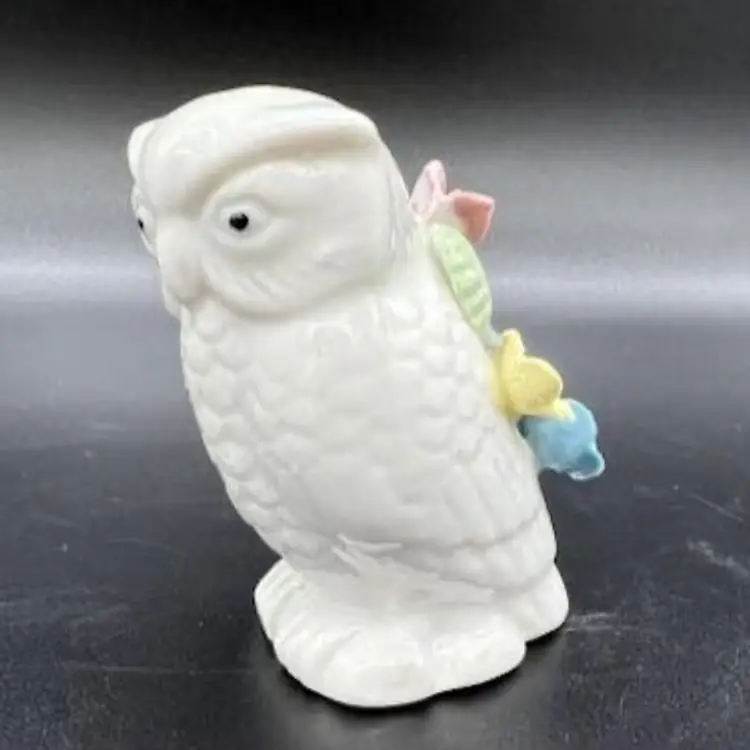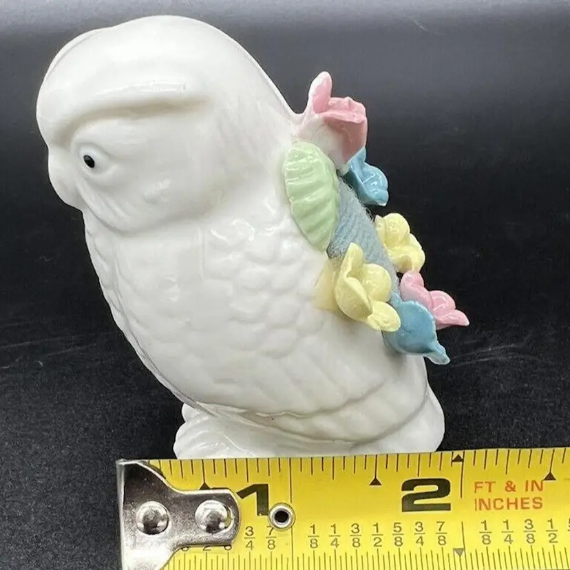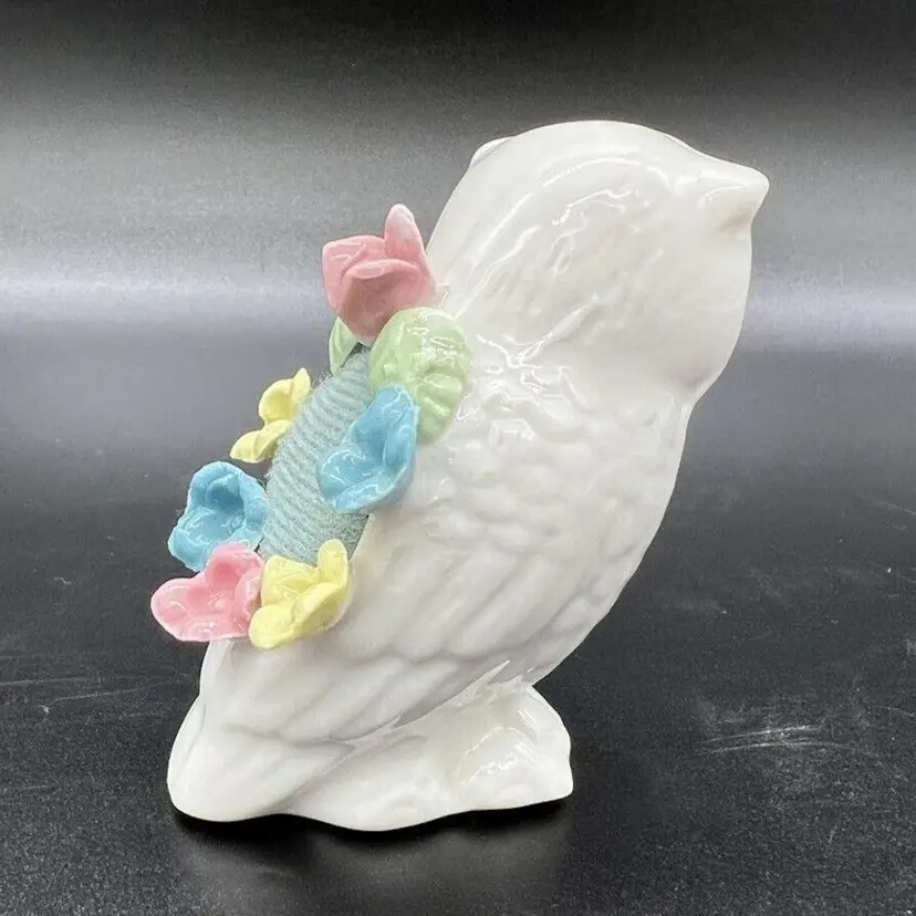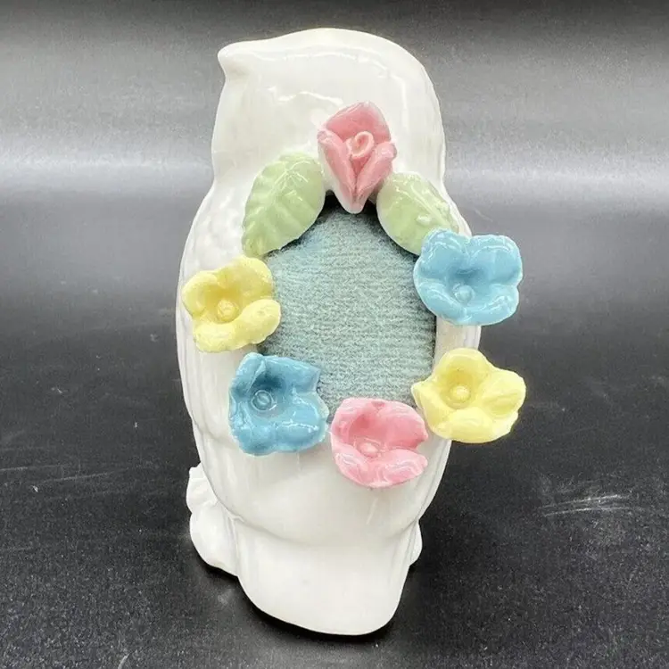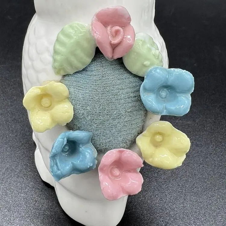 This vintage ceramic white owl pin cushion with applied flowers is a unique addition to any collection. The figural shape and intricate details make it a charming piece for display or use. Perfect for collectors of pin cushions or owl figurines. Excellent condition. No chips or cracks.