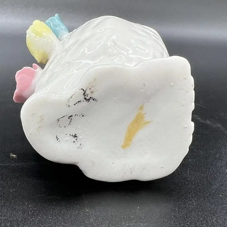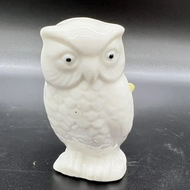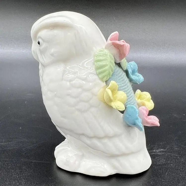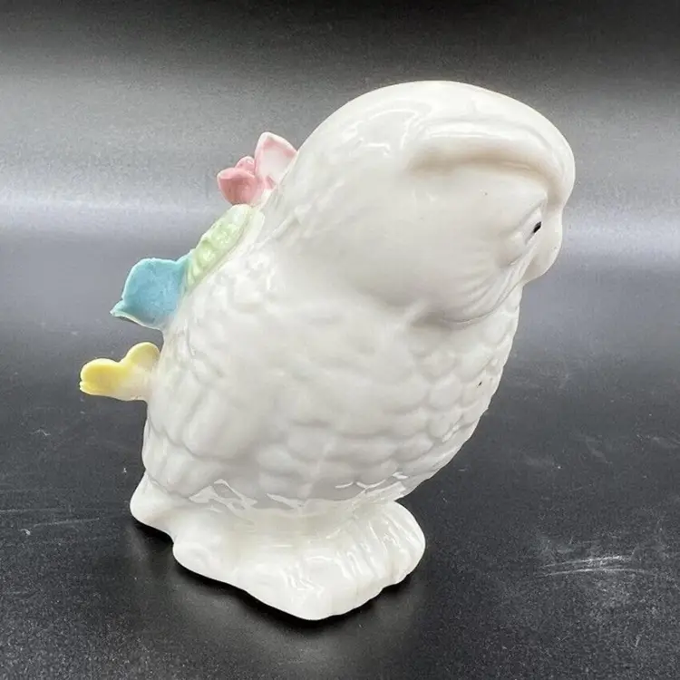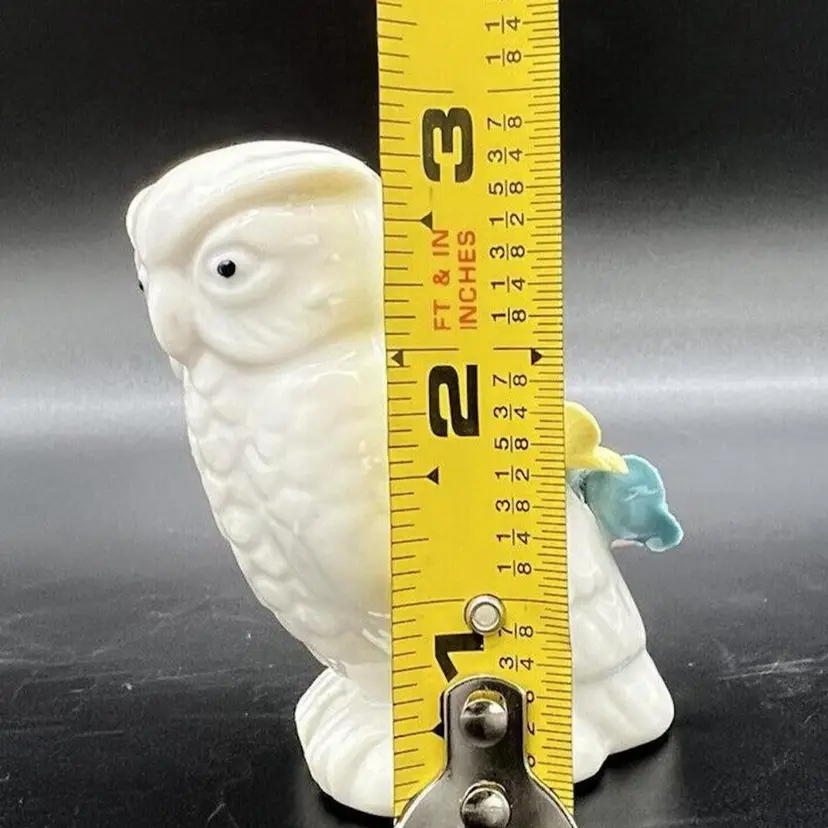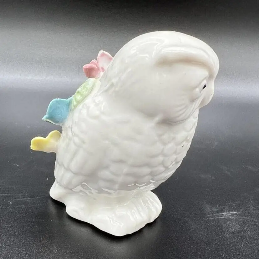 This vintage ceramic white owl pin cushion with applied flowers is a unique addition to any collection. The figural shape and intricate details make it a charming piece for display or use. Perfect for collectors of pin cushions or owl figurines. Excellent condition. No chips or cracks.