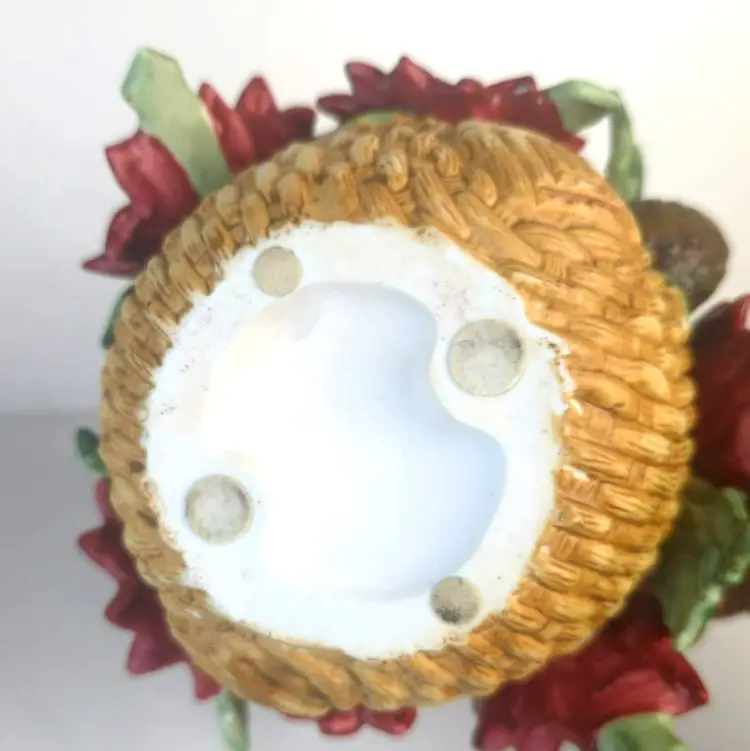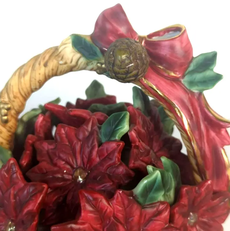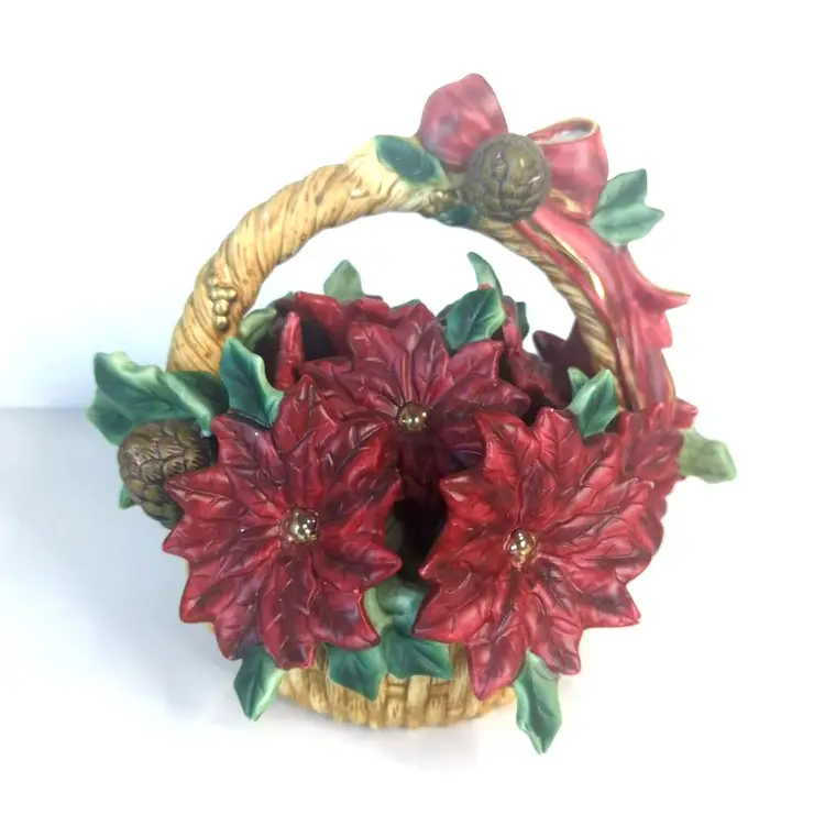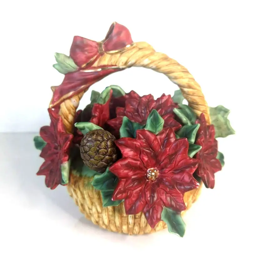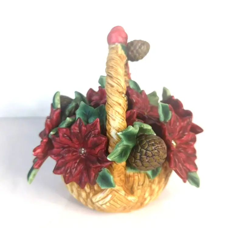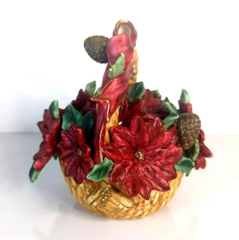 Vintage Ceramic Woven Basket of Poinsettias Pinecones Christmas Floral Decor. Dates around 1980s 1990s. Condition is preowned. Measures approximately 7 inches high and 7 inches wide.