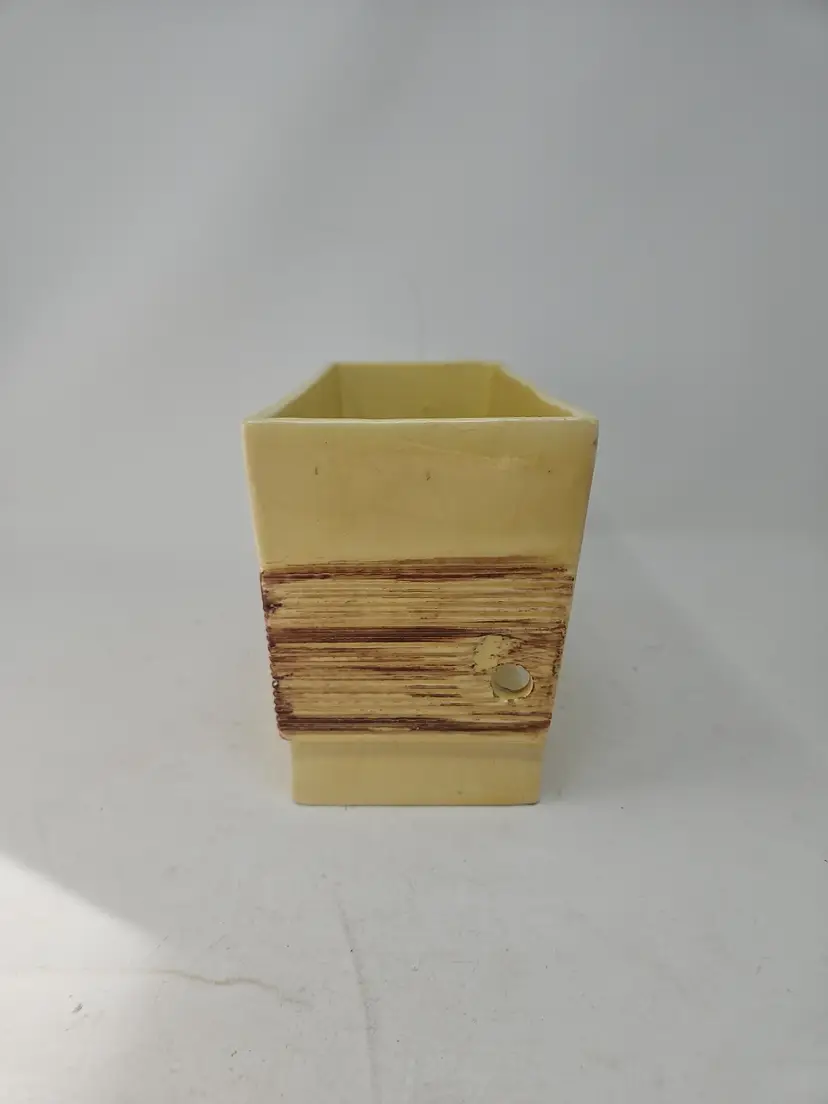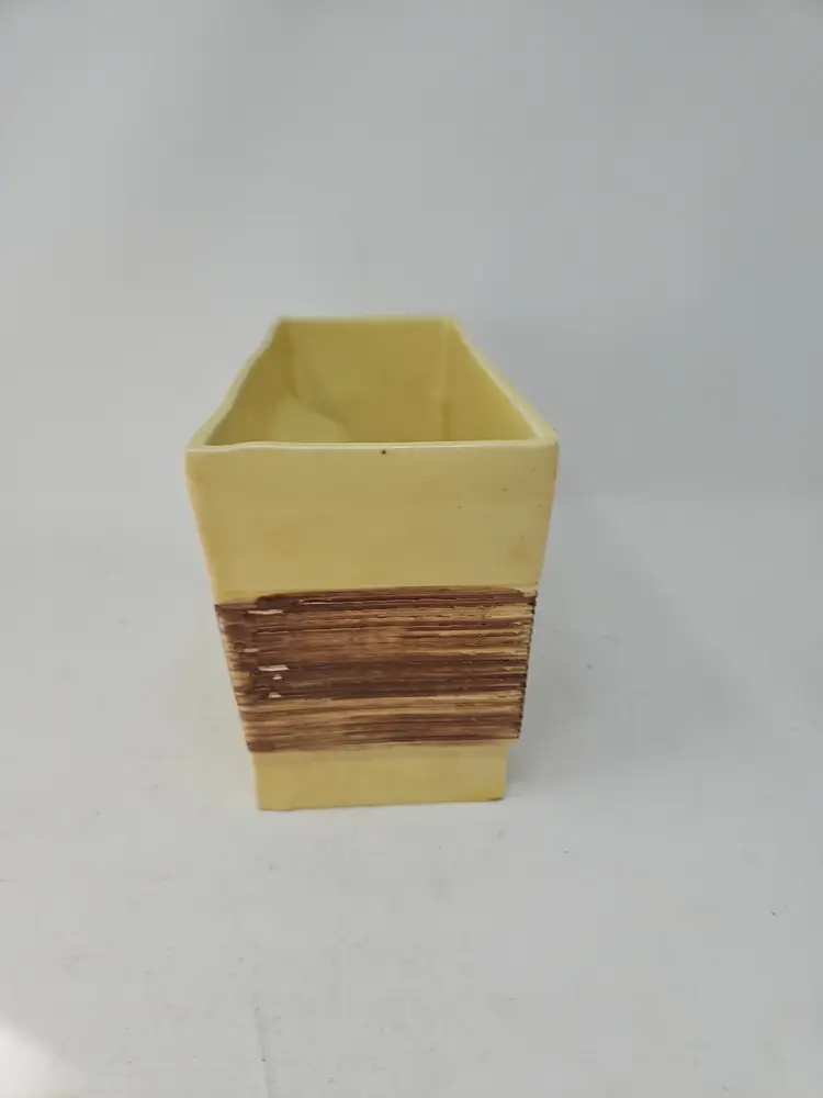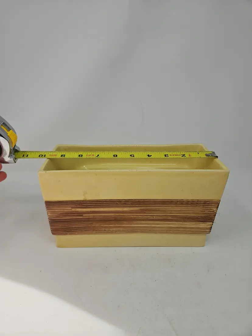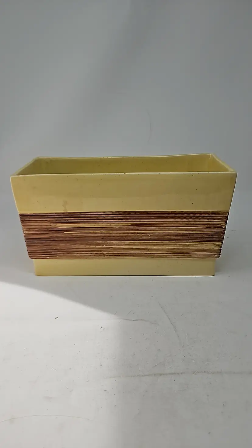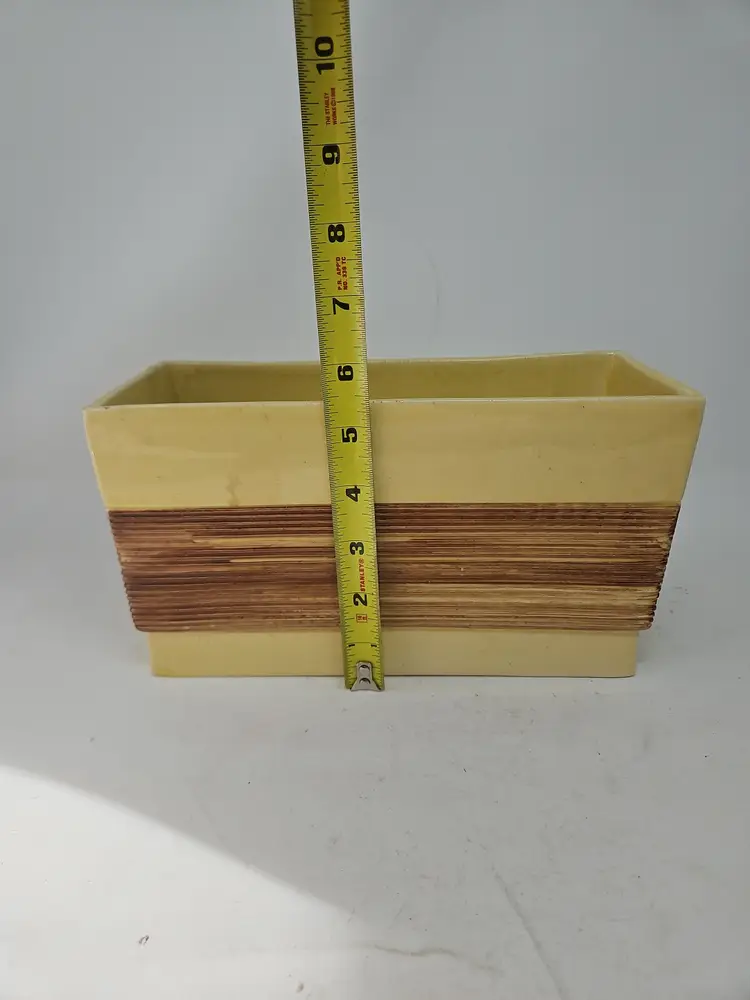 The vintage ceramic yellow rectangular planter with a faux wood grain design is a unique and charming decorative collectible. Standing at 5 1/2" tall, 9.75" long, and 4" wide, this planter is the perfect size for showcasing your favorite plants or flowers. The vibrant yellow color and intricate wood grain pattern add a touch of retro charm to any space, making it a stylish addition to your collection. Made of ceramic, this planter exudes a Mid-Century Modern aesthetic, perfect for those who appreciate vintage decor.