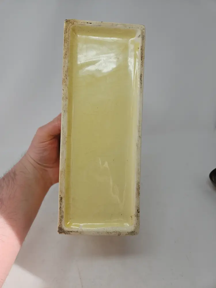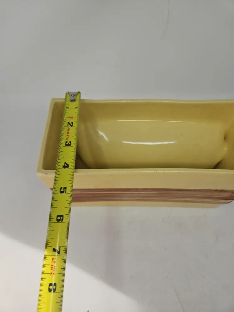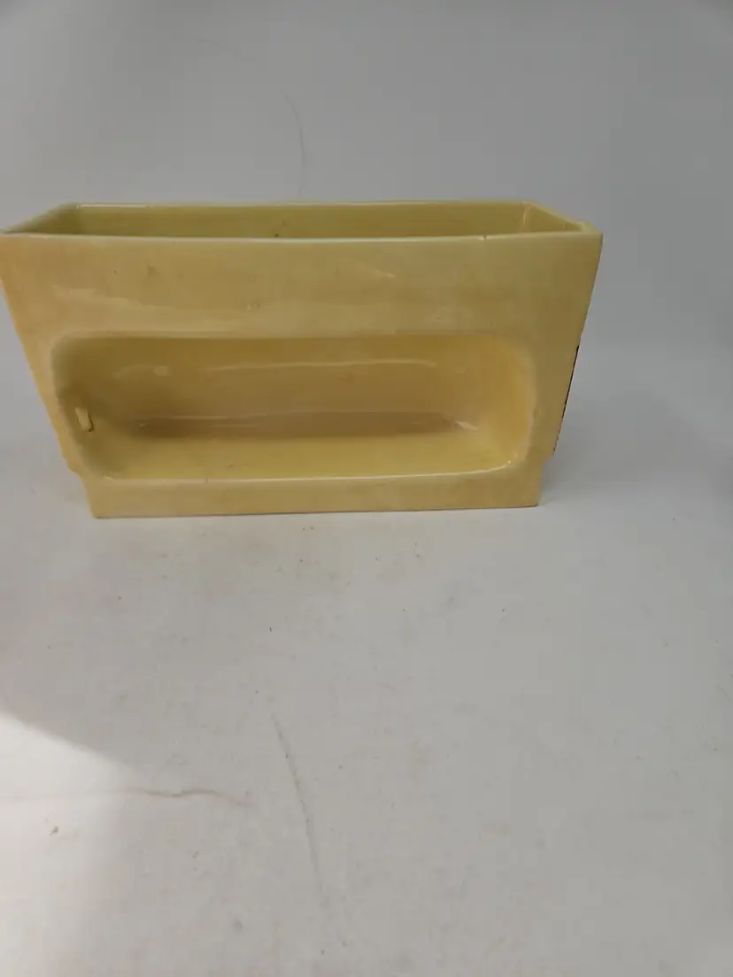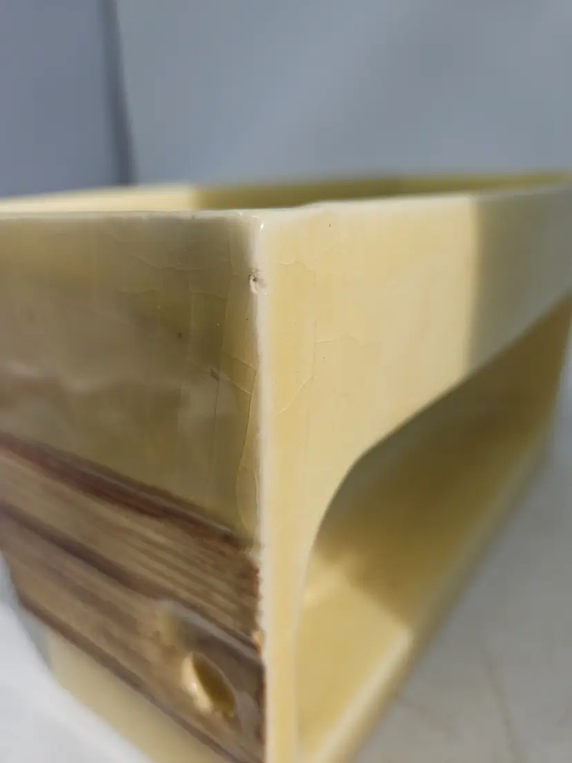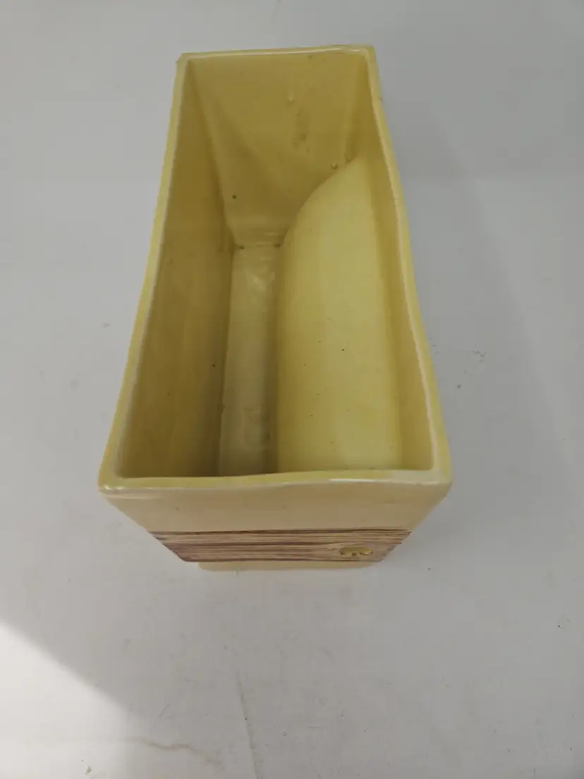 The vintage ceramic yellow rectangular planter with a faux wood grain design is a unique and charming decorative collectible. Standing at 5 1/2" tall, 9.75" long, and 4" wide, this planter is the perfect size for showcasing your favorite plants or flowers. The vibrant yellow color and intricate wood grain pattern add a touch of retro charm to any space, making it a stylish addition to your collection. Made of ceramic, this planter exudes a Mid-Century Modern aesthetic, perfect for those who appreciate vintage decor.
