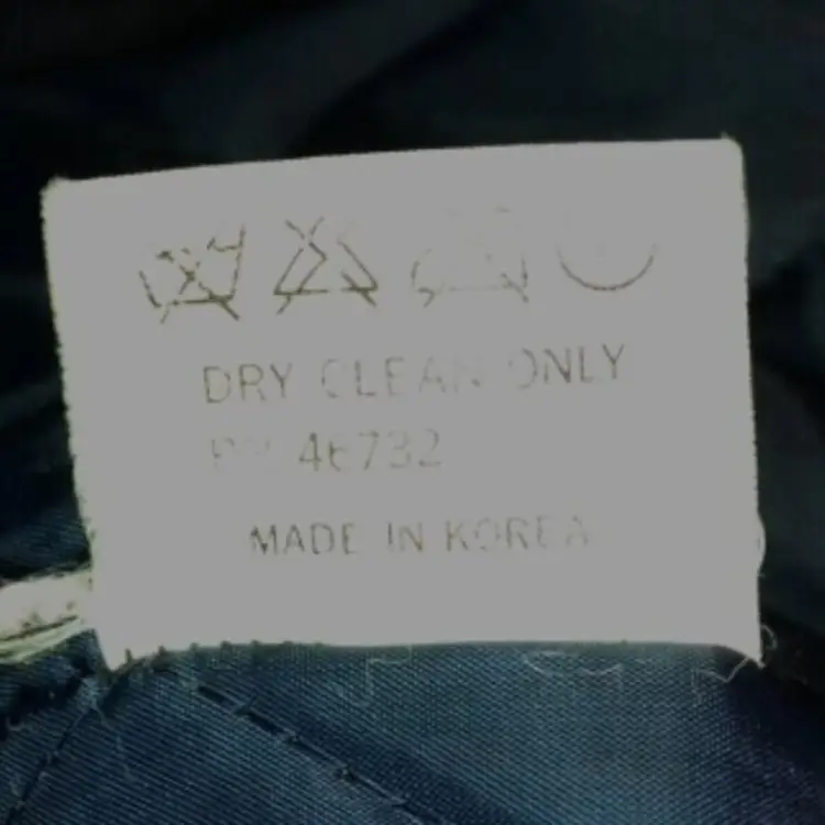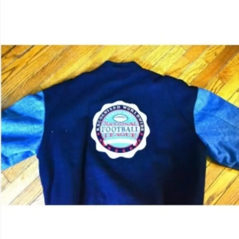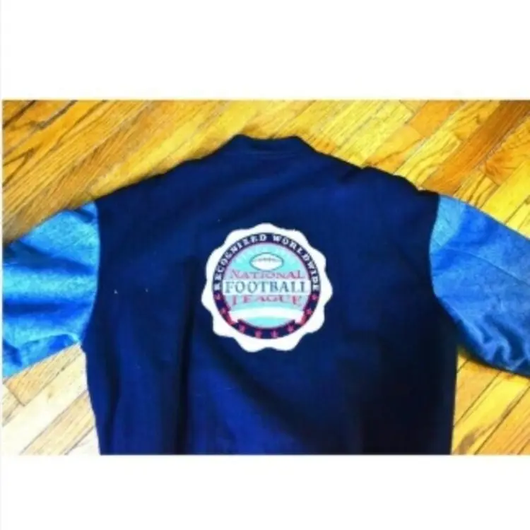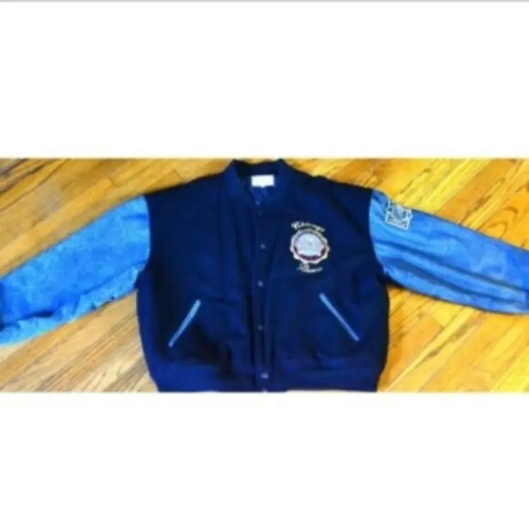 Features a black body with denim like sleeves and high quality embroidered patches. The outer part is 70% wool and 30% other material, the inner liner is 100% nylon. All patches do show some minor edge fraying but are securely sew on, no lifting.