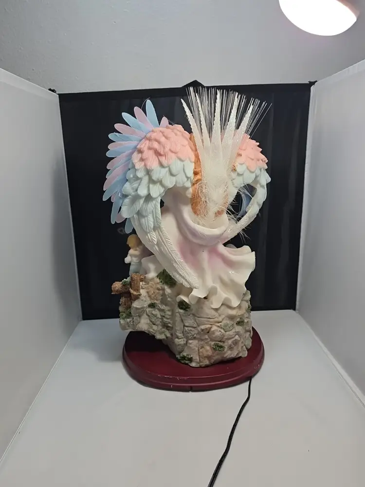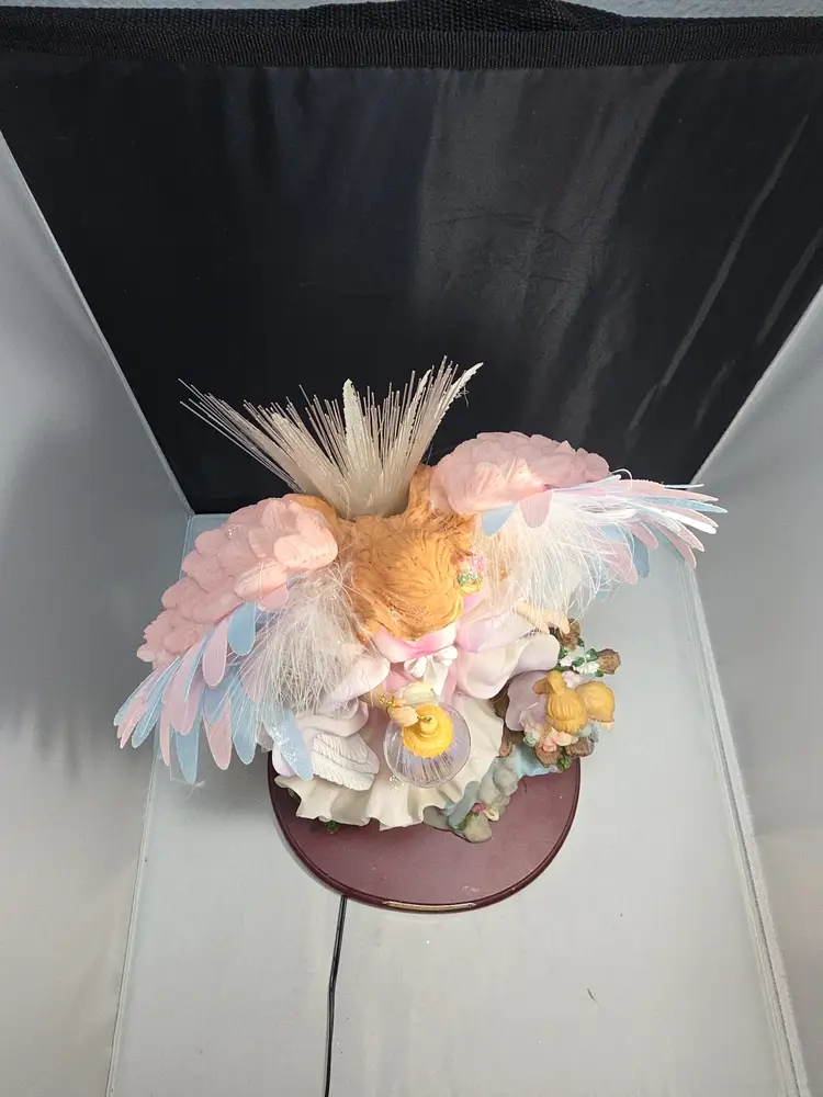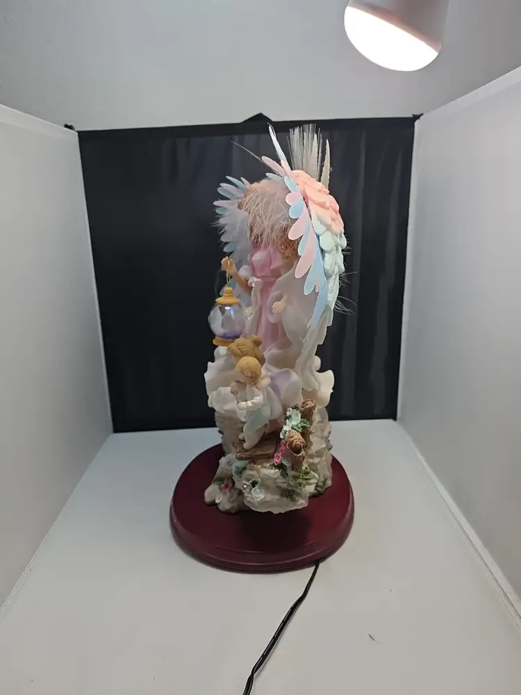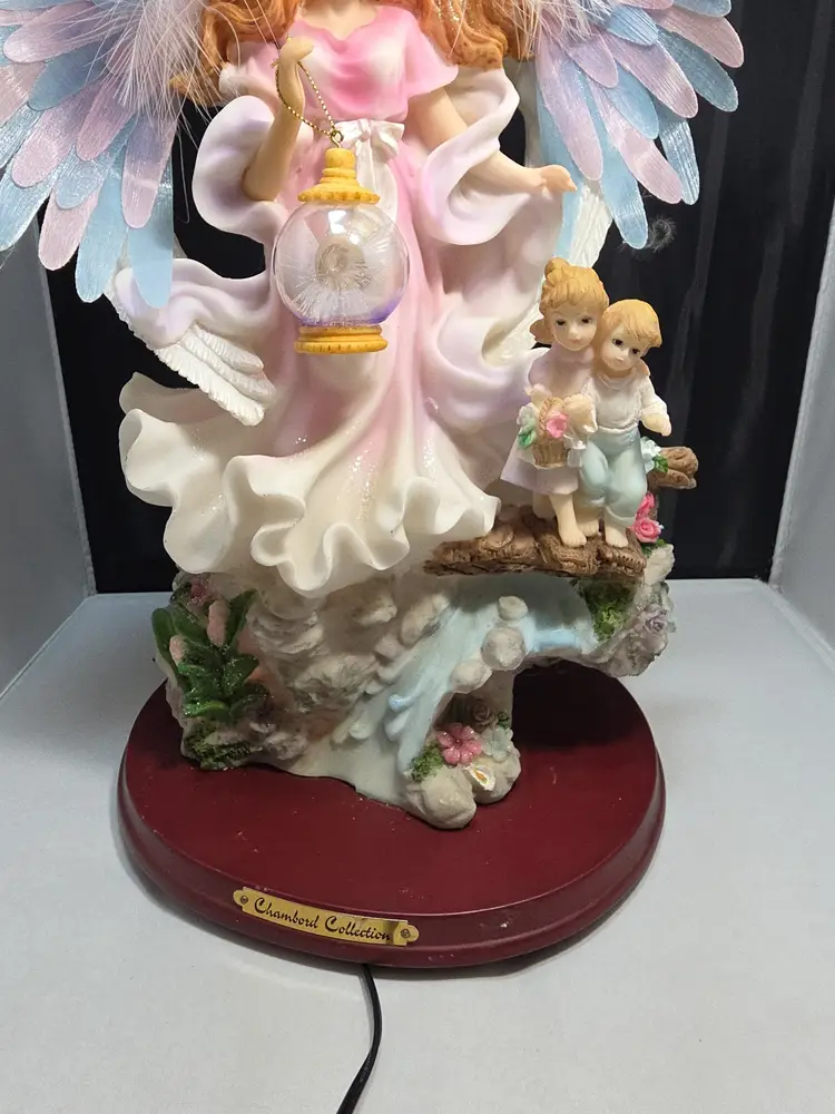 Description Vintage Chambord Collection fairy figurine with fiber optic lighted display. Features a pink gown, pastel wings, lantern, and two children on a woodland style base. Tested and works.