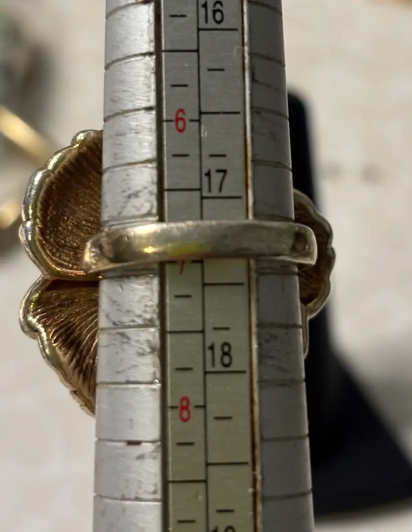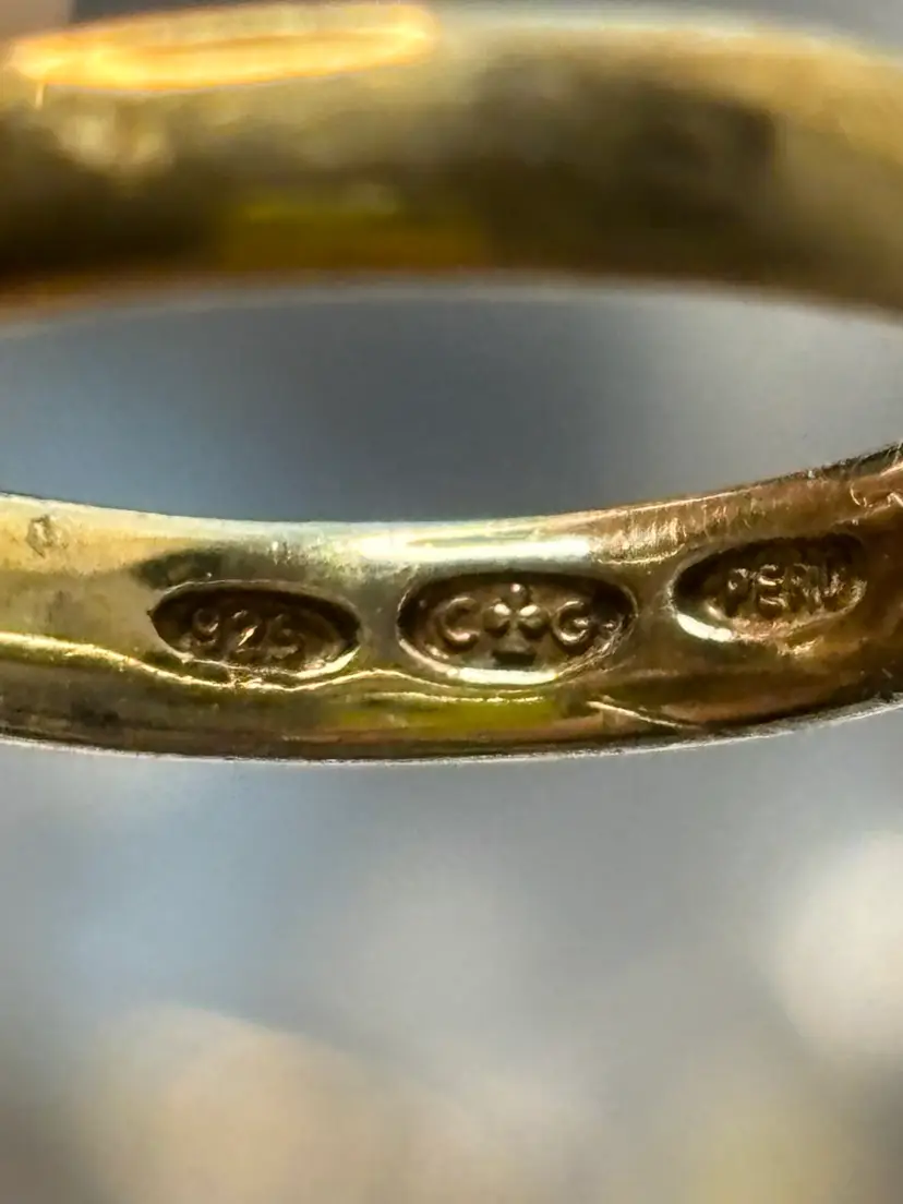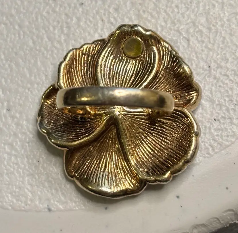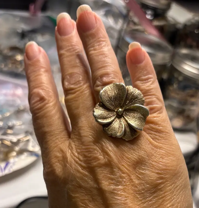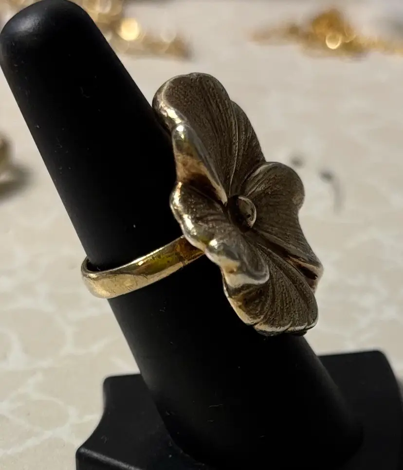 Large flower ring made by designer Charles Garnier. Sterling vermeil in a sz 7. Hallmarks stamped inside, 925, the designer’s hallmark with initials, and Peru. There’s some tone loss of the gold at the bottom of the band, and light tone loss at the tips of the petals.