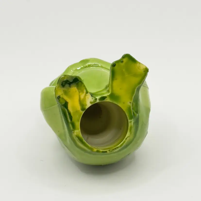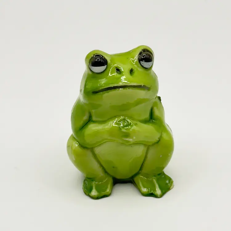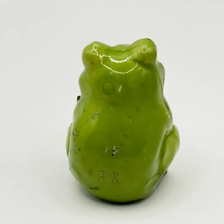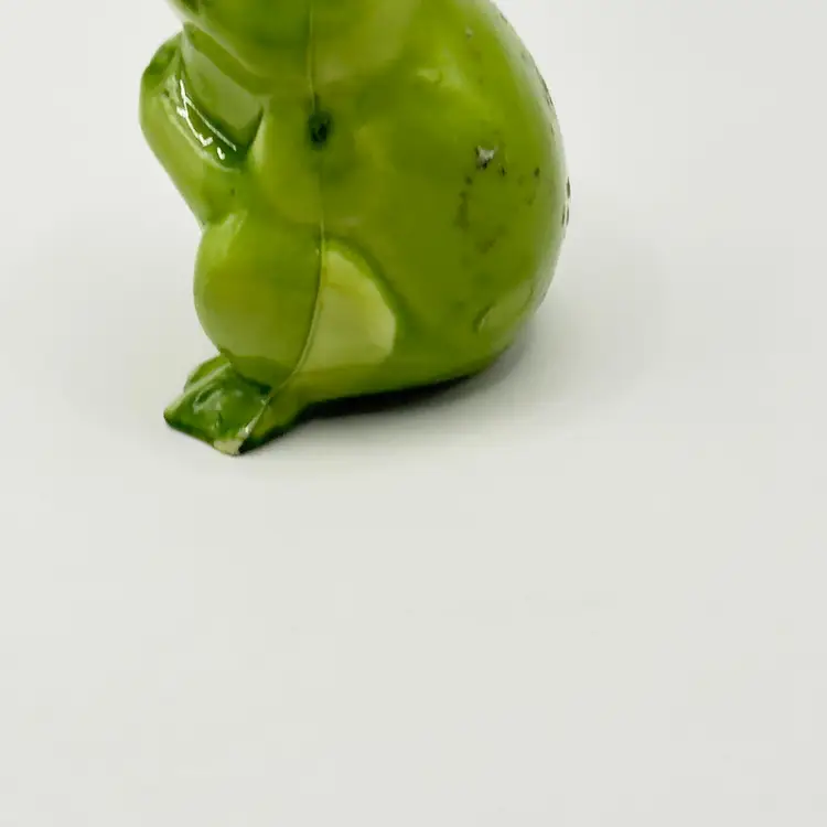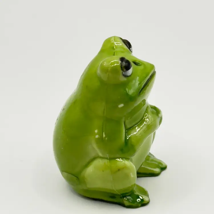 Add a touch of whimsy to your space with this charming green frog figurine. Crafted from glossy ceramic, this delightful piece is perfect for frog lovers and collectors alike. Its playful design makes it a fun accent for any room. Excellent condition with no chips or cracks. Measures 1x1.5x1 inches. Weighs 4oz.