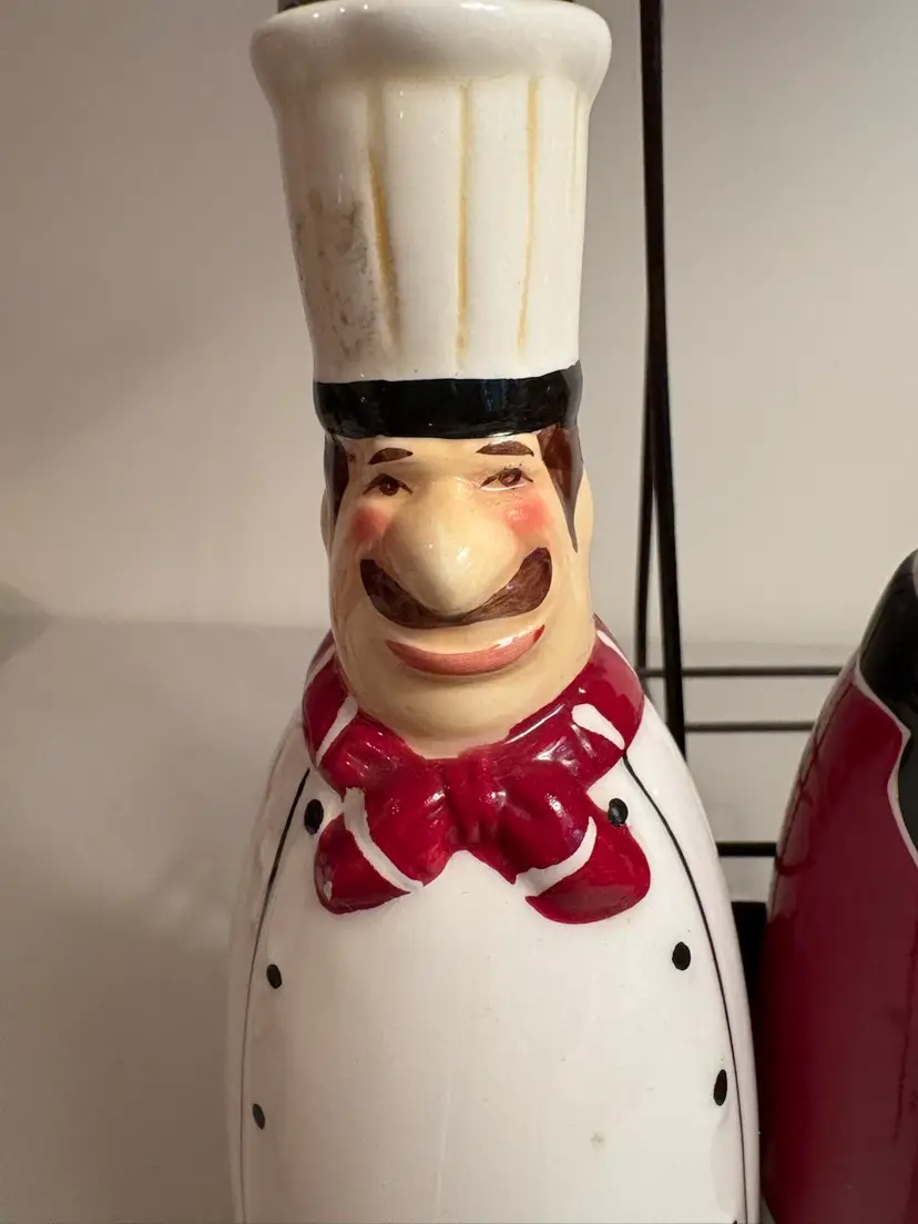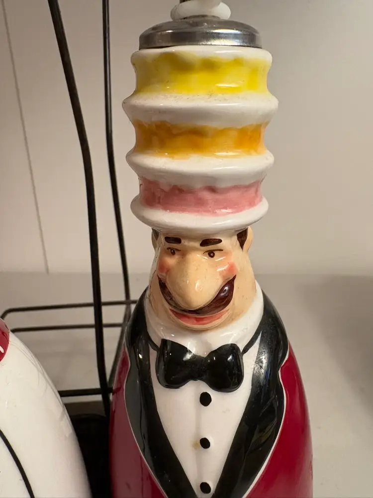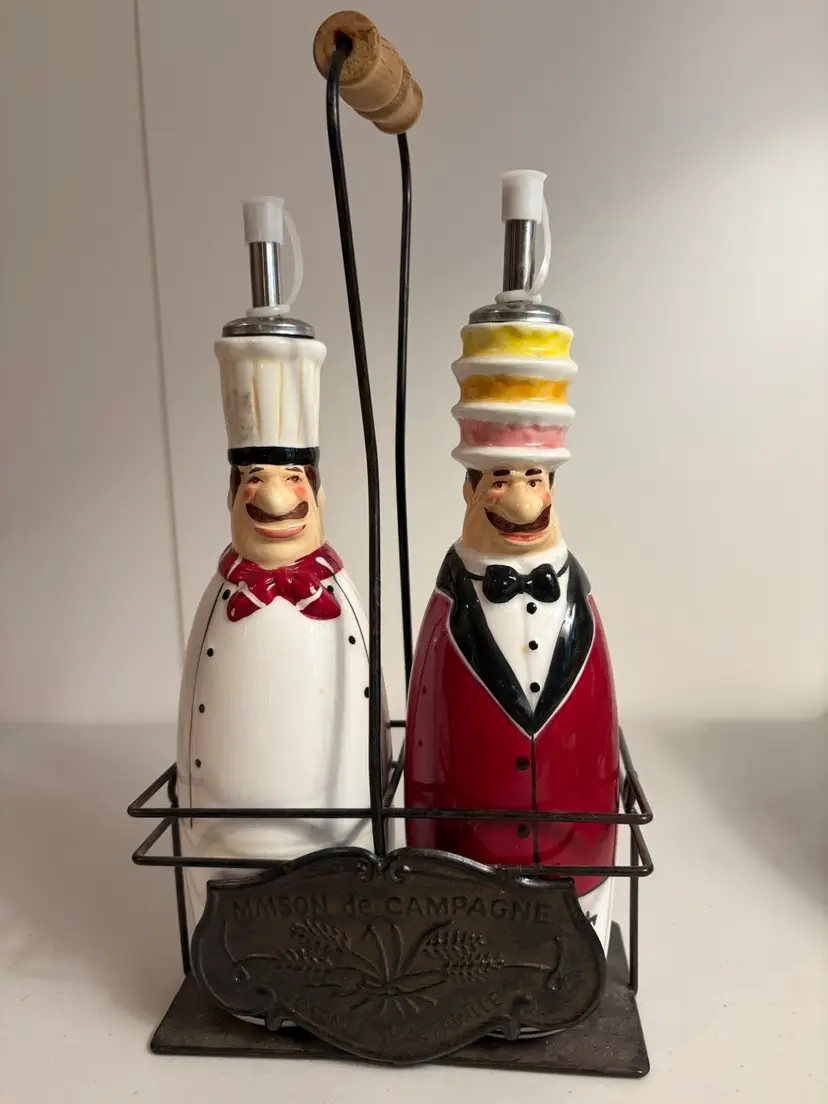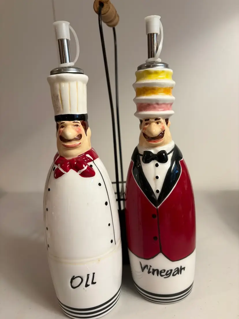 Vintage Chefs Oil & Vinegar Dispenser Bottles" Maison de Campagne Metal Holder Very cute chef oil and vinegar set in metal tray Excellent condition with no chips or cracks. Handpainted ceramic with metal tray that has a wood handle Bottles stand 9.5" tall Metal Caddy holder is 11.25" tall Beautiful in an Italian kitchen or any kitchen