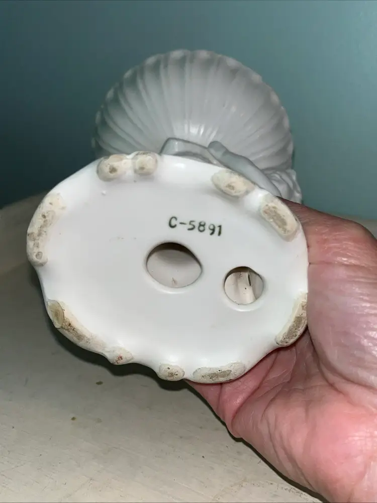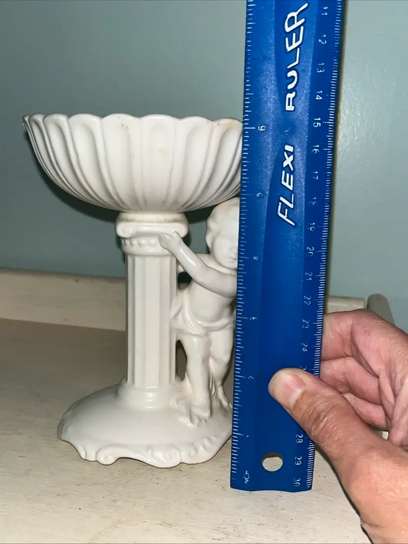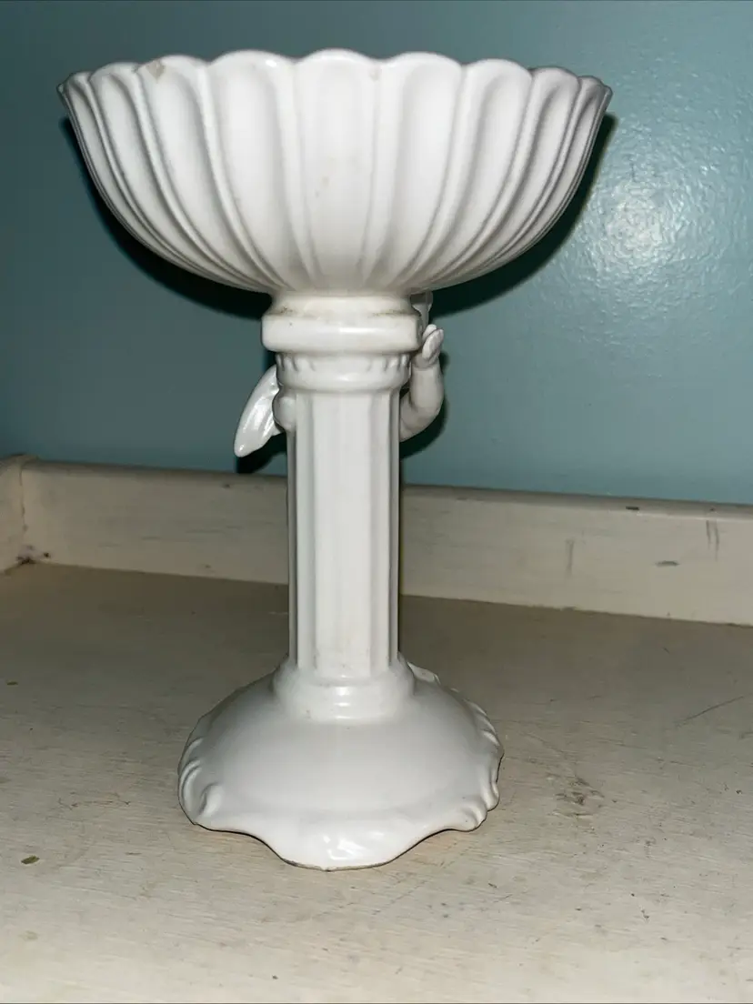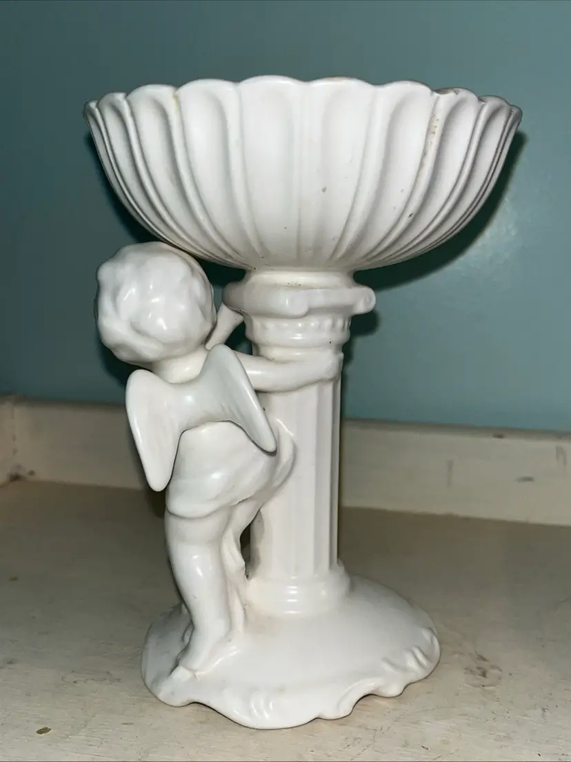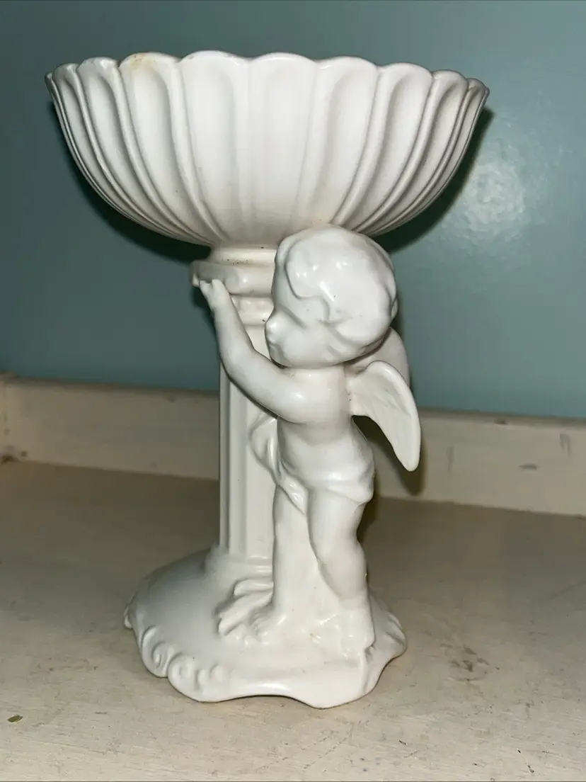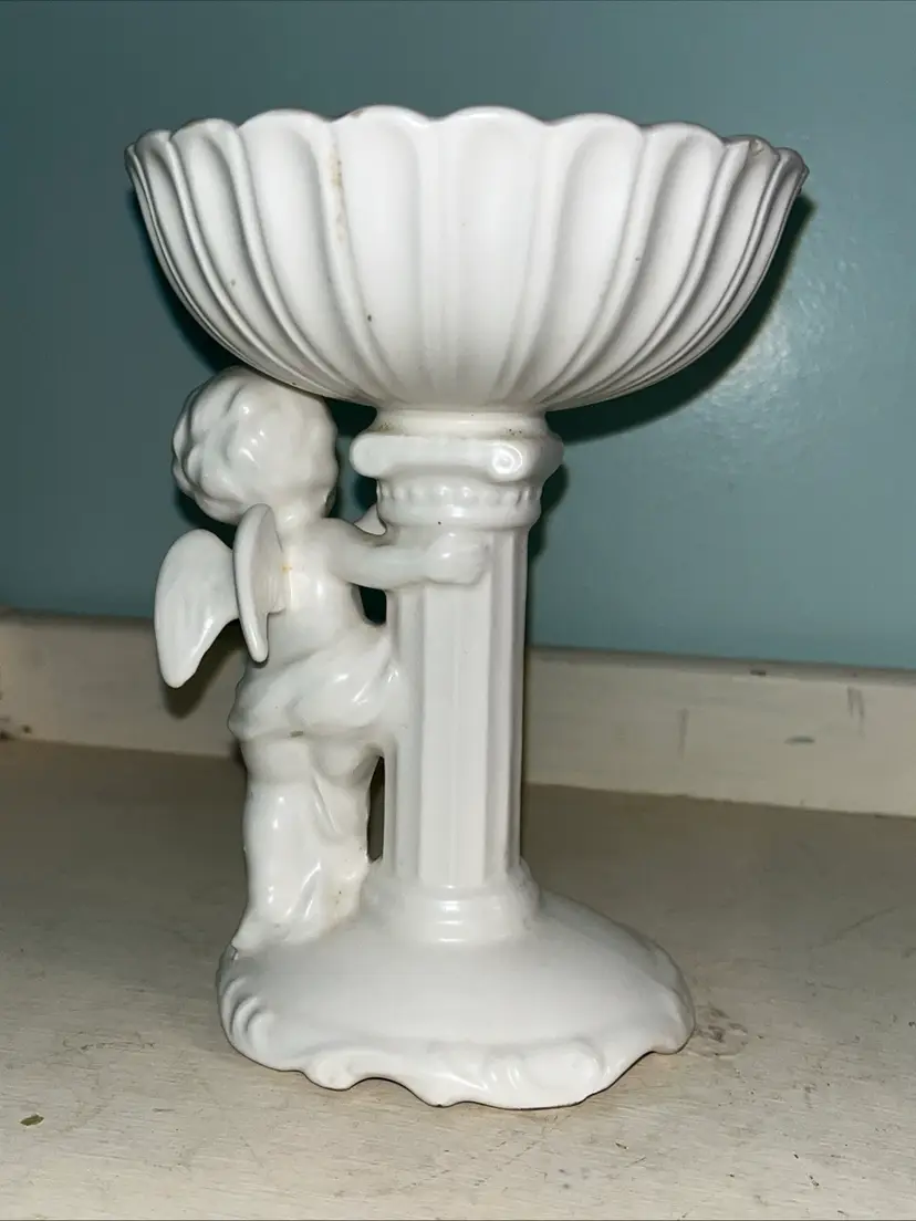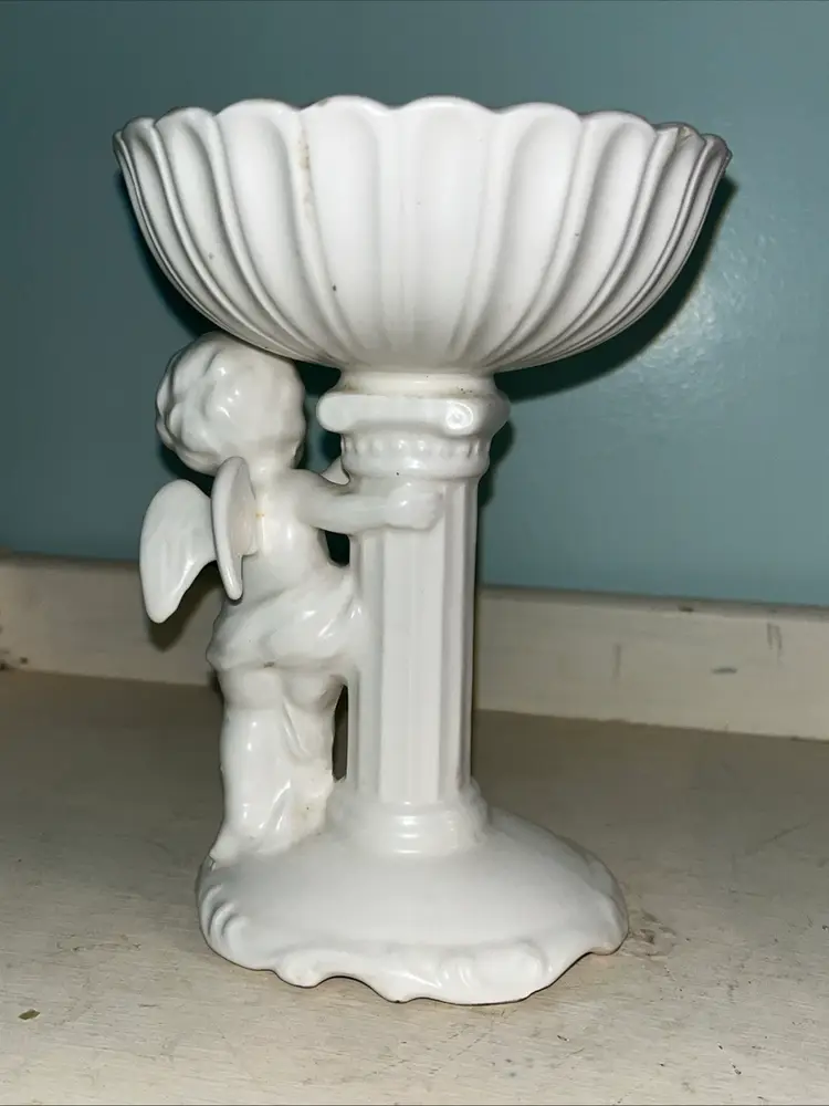 Vintage Cherub Angel white porcelain pedestal dish figurine C-5891. Also cute for a soap or trinket dish. I used it to display beach glass. Approximately 6" tall. Pre-owned and in good, vintage condition. Expect normal wear such as scuffs and scratches especially in the dish. There are a couple chips around the rim of the top. See photos and ask any questions prior to purchase.