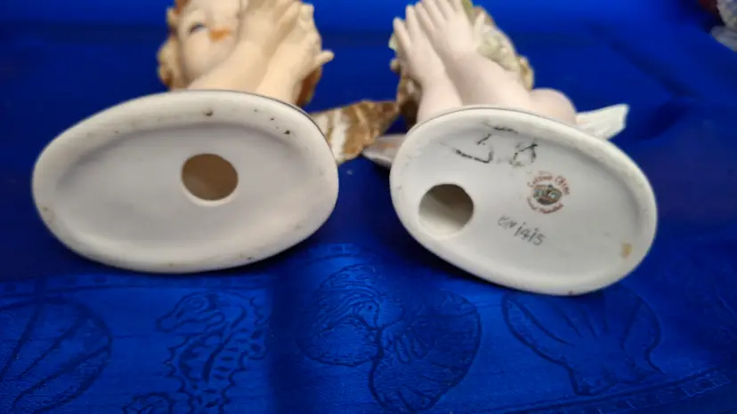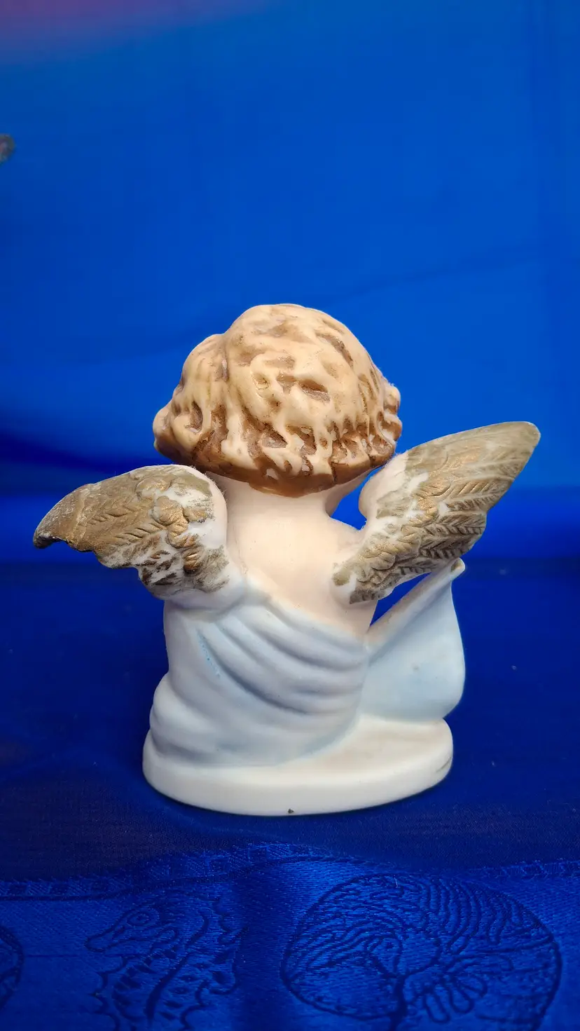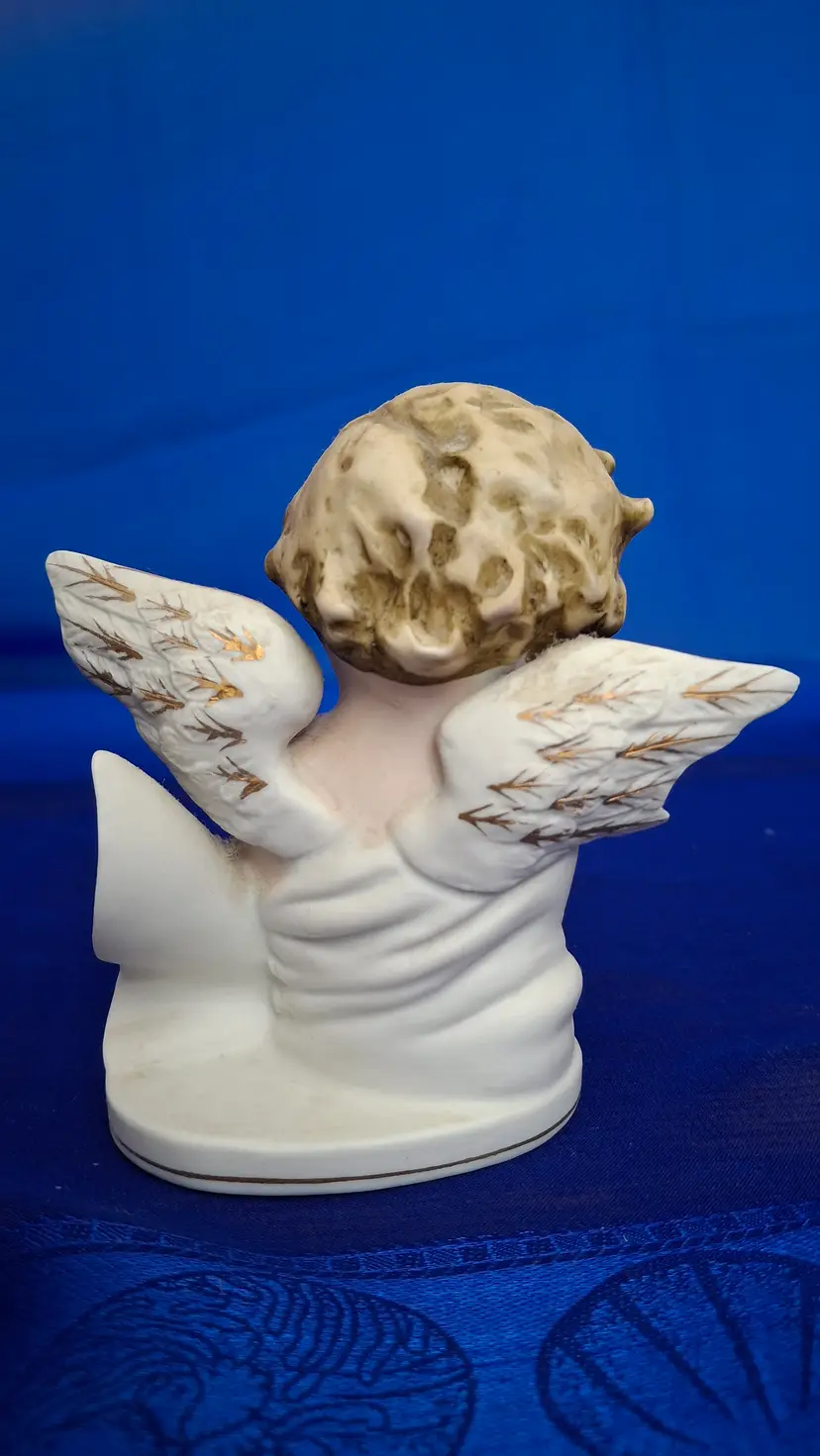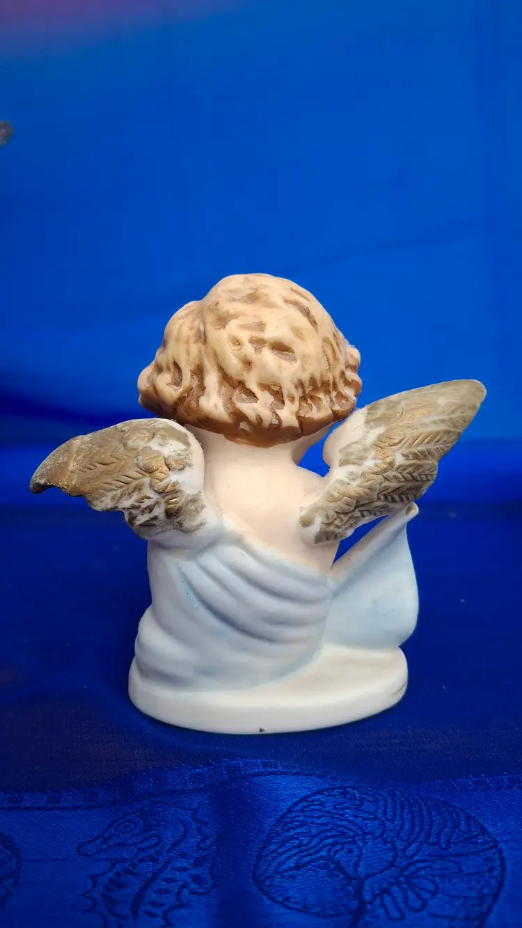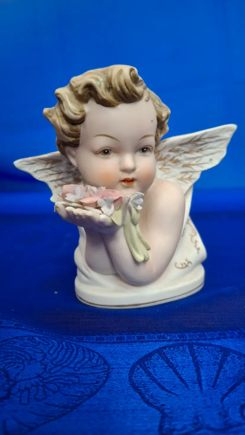 Vintage Cherub Busts | Lefton Angel Figurine & Companion | Porcelain Cherubs Lovely pair of vintage cherub bust figurines blowing flowers. One is marked Lefton, the companion piece is unmarked but closely matched in style and size. Finished in soft bisque porcelain with hand-painted details and subtle gilding on the wings. A charming display pair for shelves, vanities, or angel collections. Details: • Height: approx. 4.5 inches • Material: Bisque porcelain • Markings: One Lefton, one unmarked • Era: 1950s–1960s Lefton cherub in very good condition. The unmarked cherub shows possible rough molding or an old wingtip repair—priced accordingly.