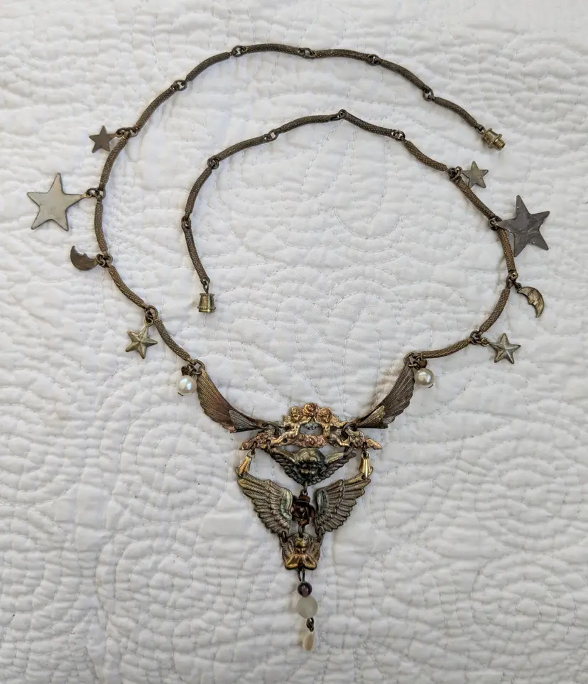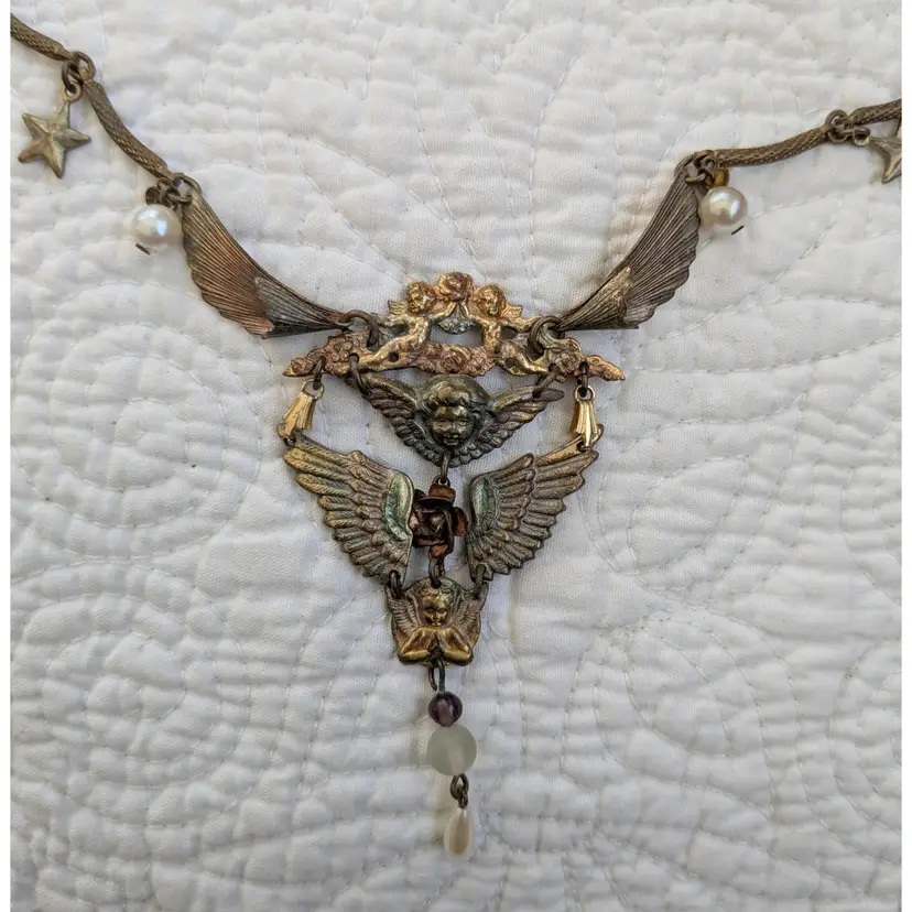 Overall necklace length is 20". The center cherub ornament is 3" long. Barrel clasp. In bronze, copper and gold tones. Unmarked