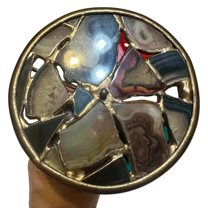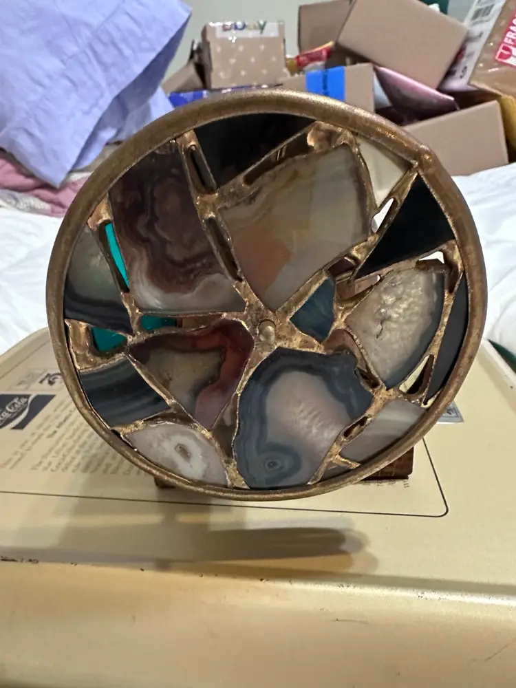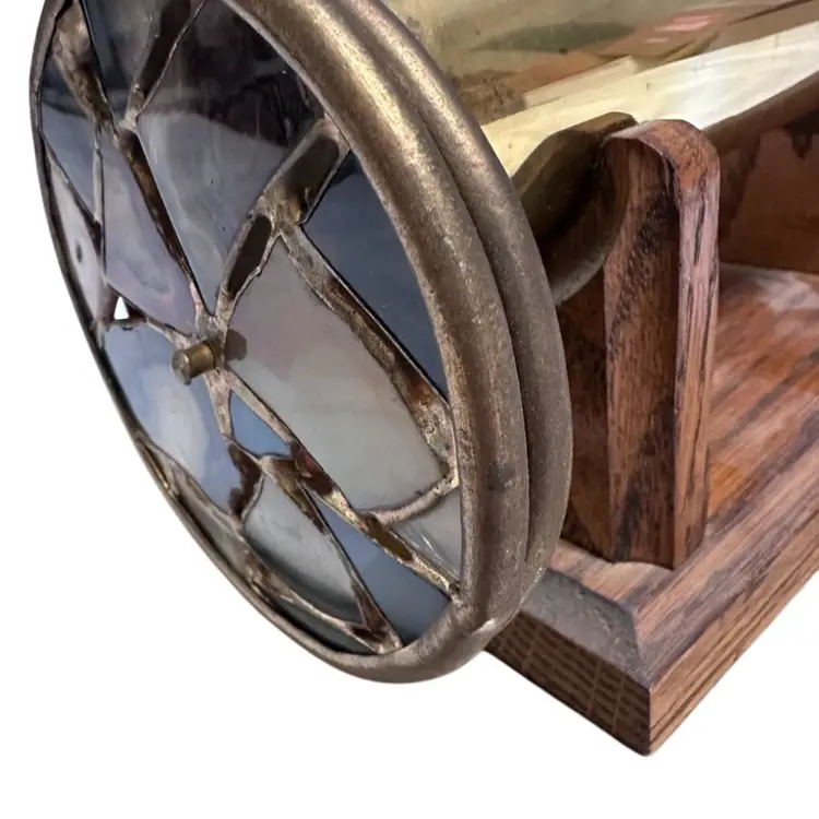 Vintage Chesnik-Signed Brass Kaleidoscope 1984 Two Dichroic Stained Glass Wheels + Stand 12 inches long and 6.5 inches tall on stand Signed J Chesnik 1984