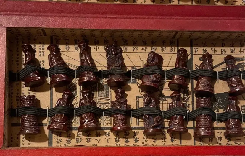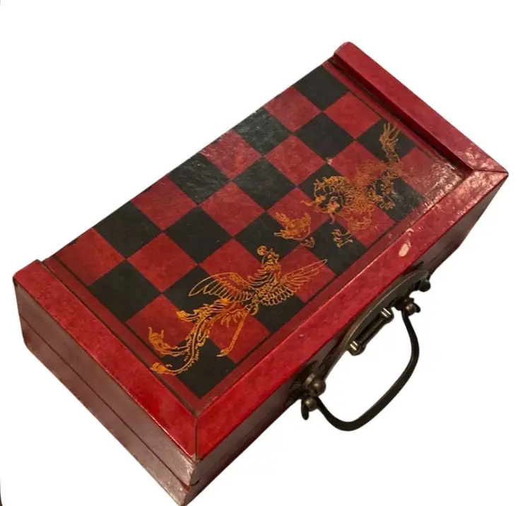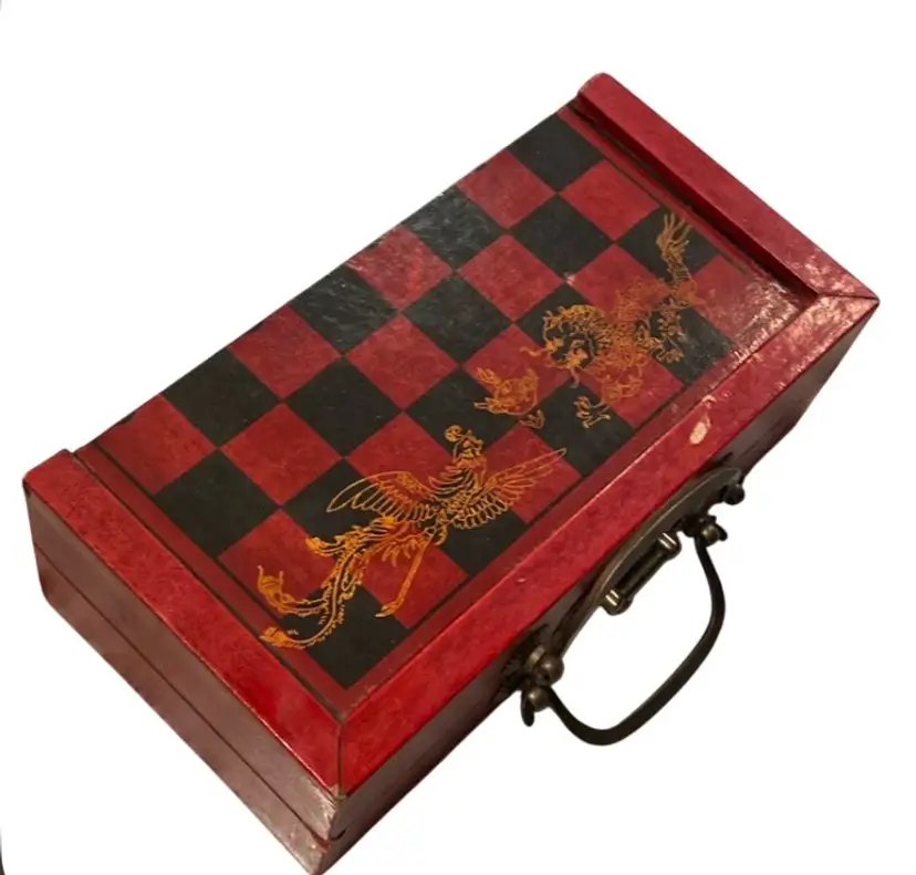 The chess box has wear as seen in pictures with some nicks, scratches, minor dents. When open it measures 8” x 8” and serves as game board! All chess pieces are intact beautifully designed and the shortest pieces are 1.25” tall. The case handle is very beautiful as well! Great collectors piece!
