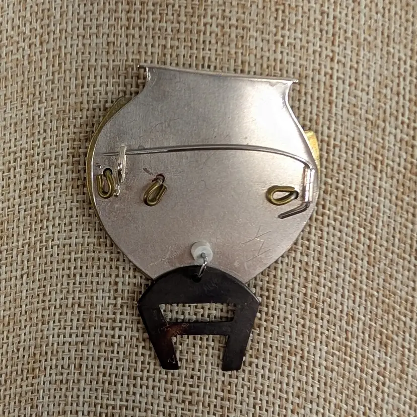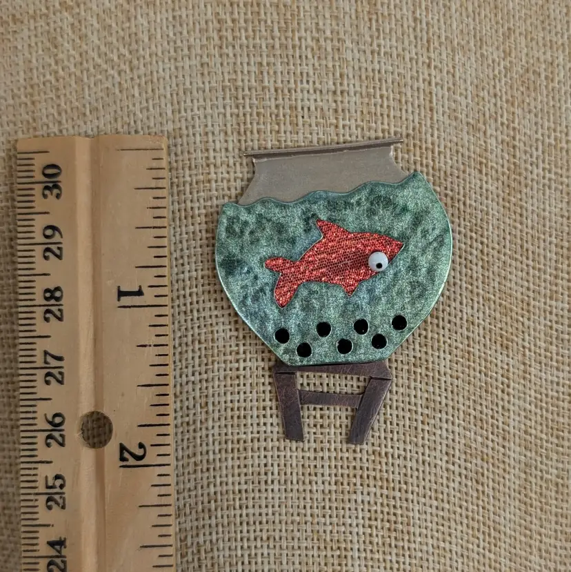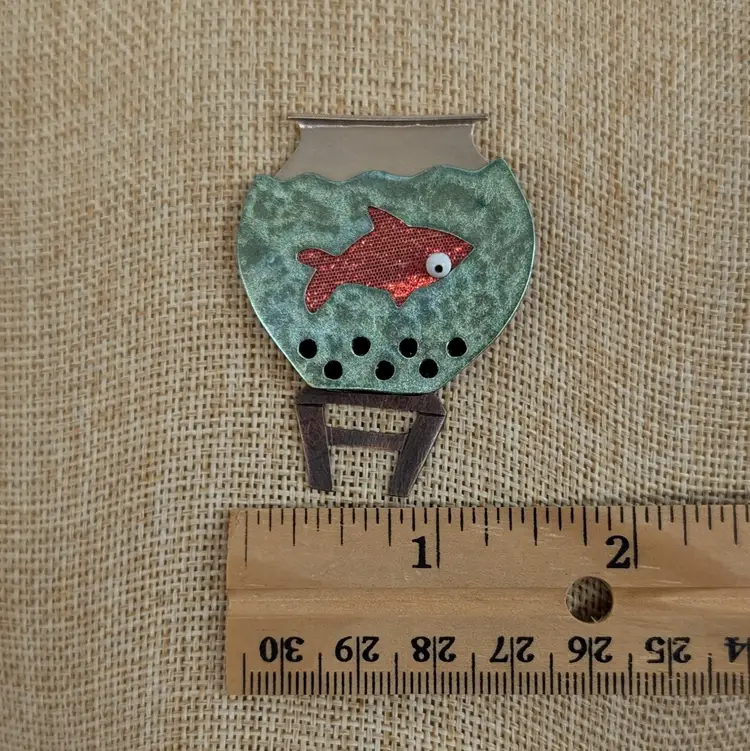 Artisan jewelry made by Lisa and Scott Cylinder of CHICKENSTATCH. Whimsical goldfish in a iridescent fish bowl where the eyeball and table articulate and move. Has a scratched chicken feet print on the back. In nice, used condition. Measurements ~ 1-1/2 x 1-7/8"