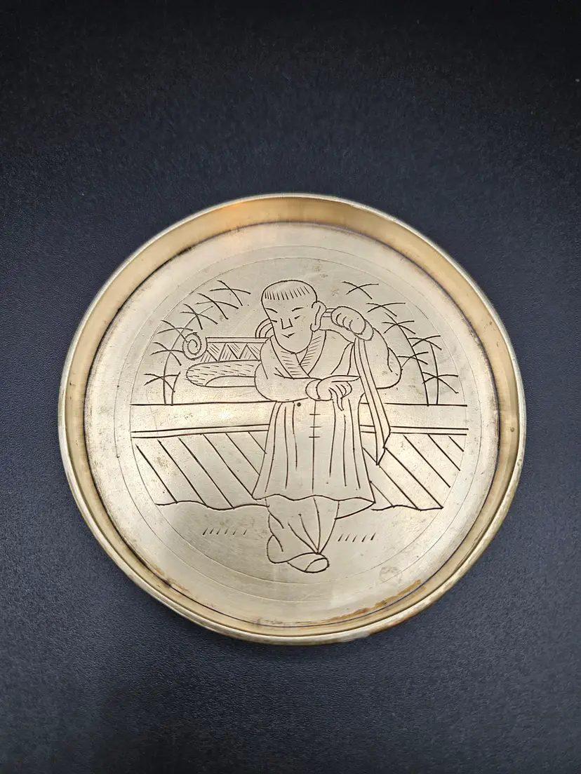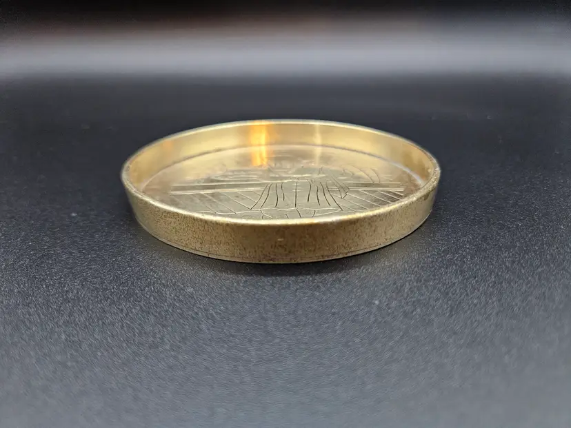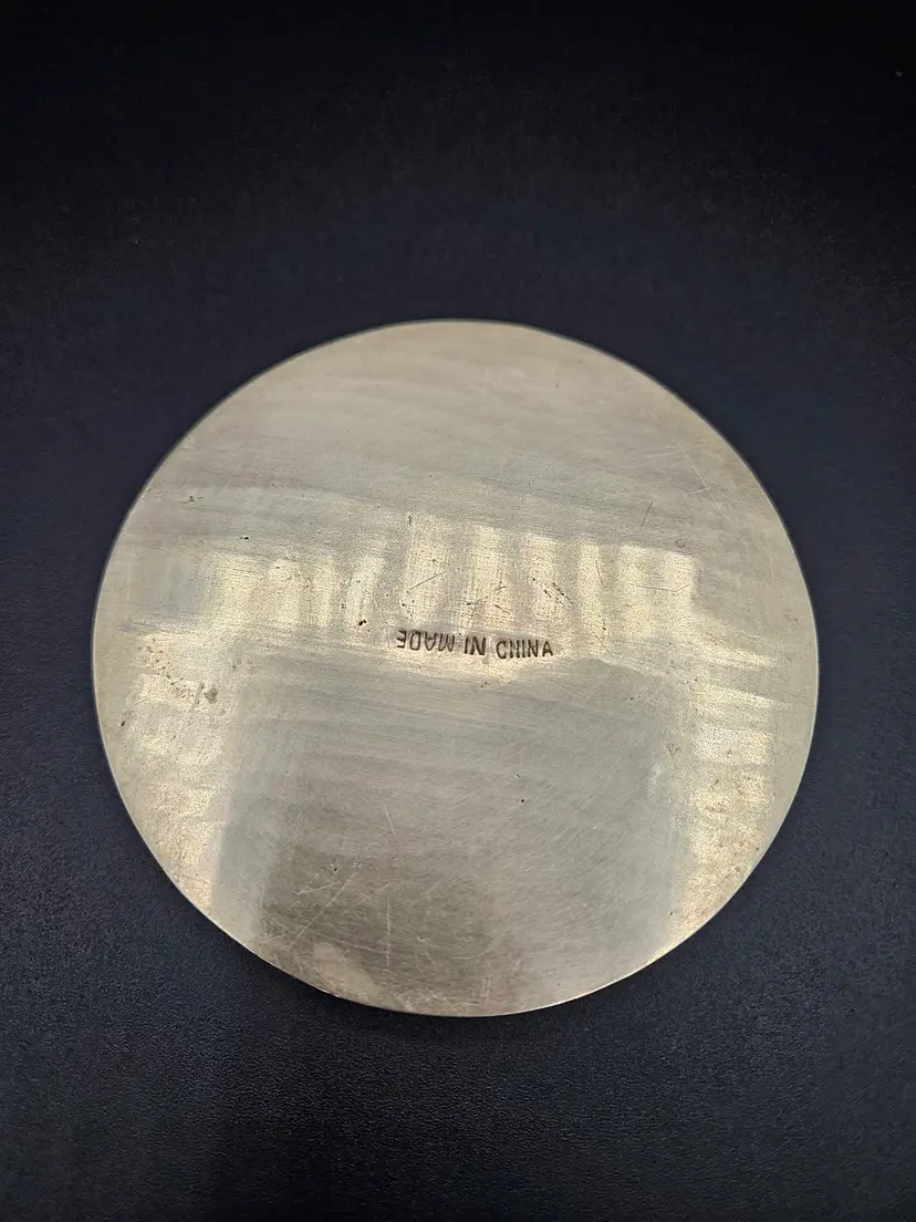 Measures roughly 3 3/4 inches wide. Some slight discoloration around the edge on the inside of the coaster. Made in China stamp is half upside down.