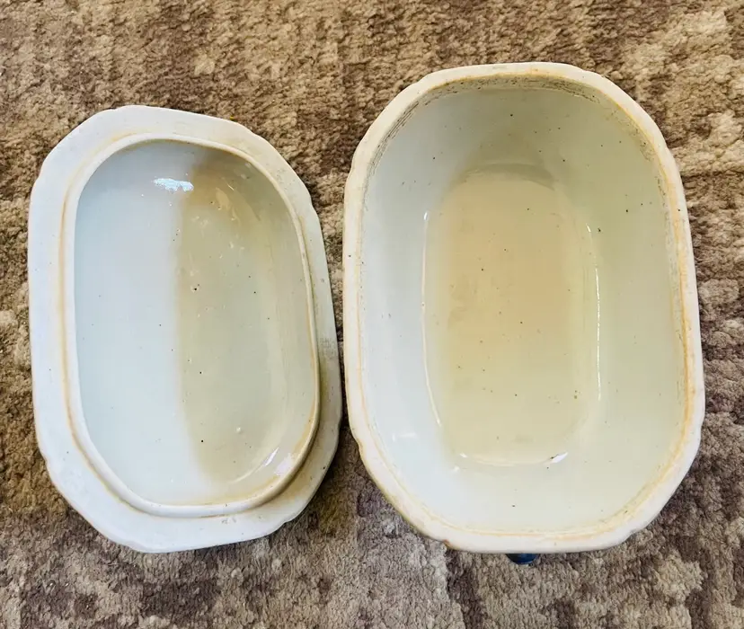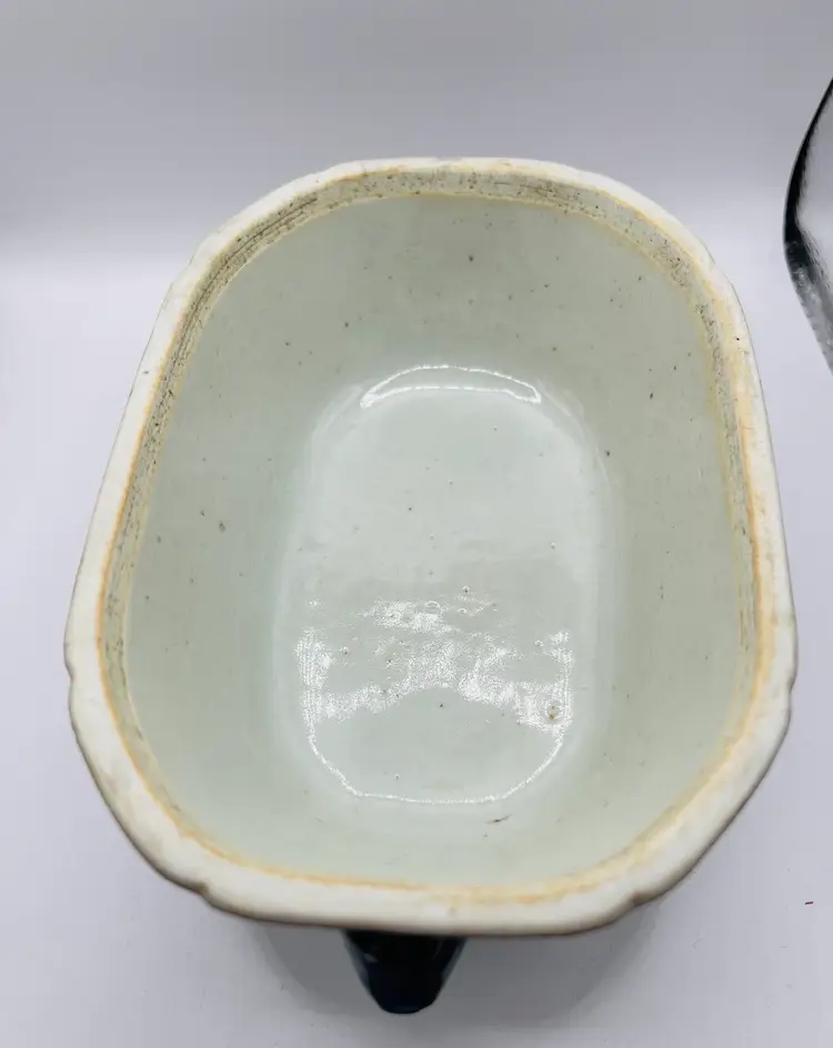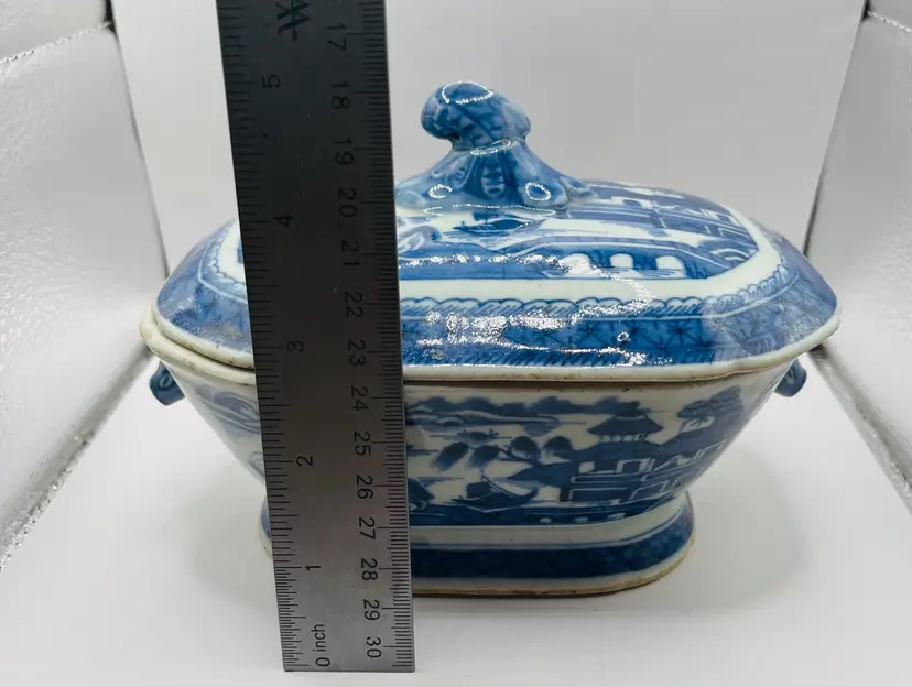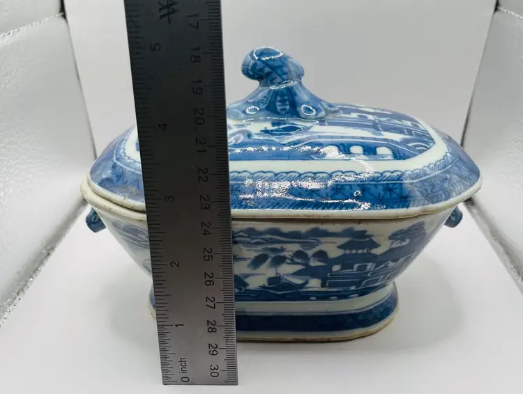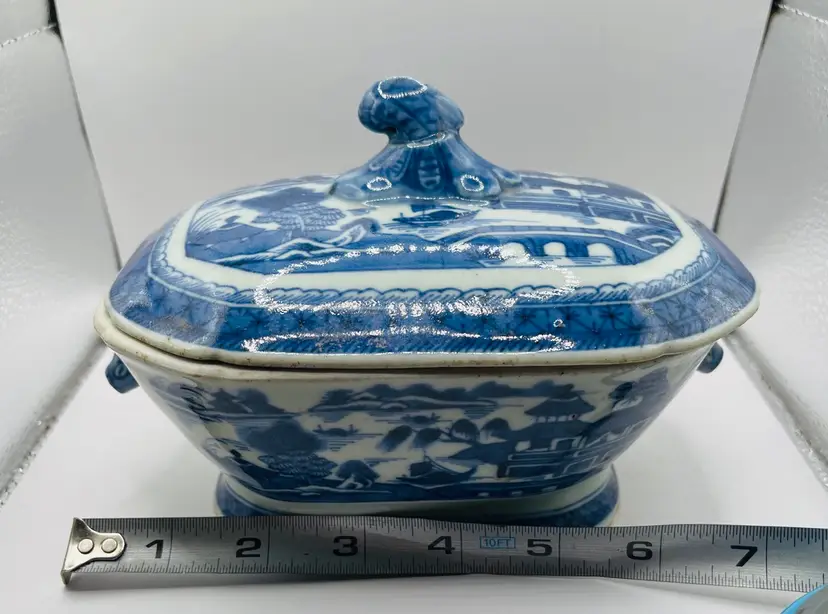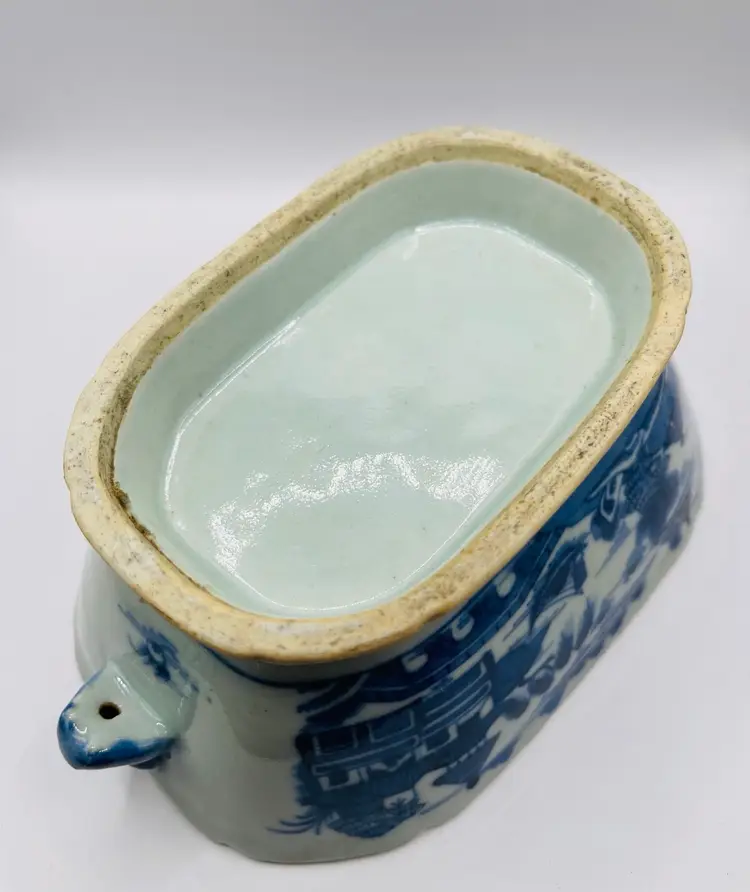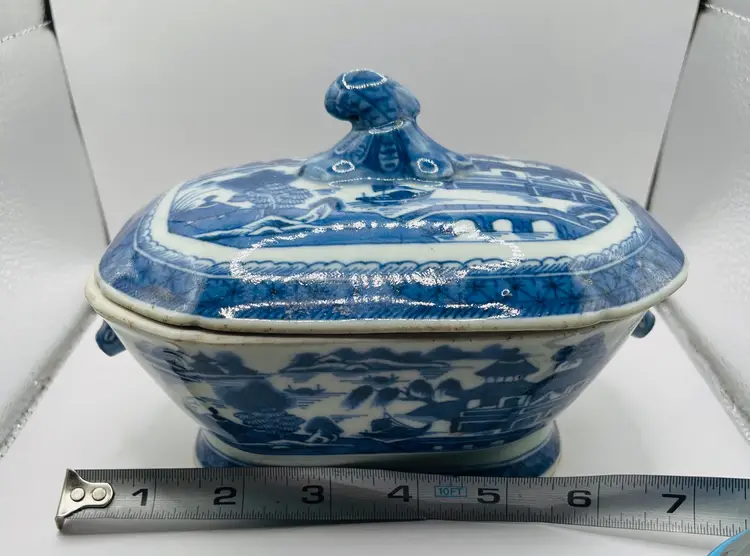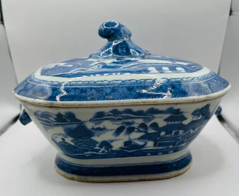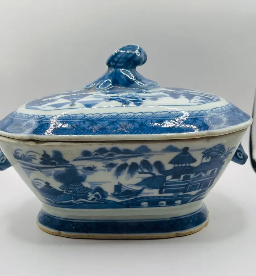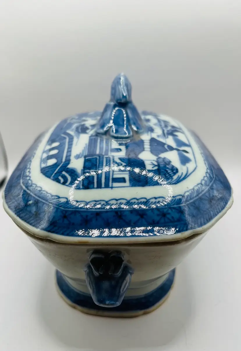 Vintage Chinese Canton Export Covered Tureens Canton blue and white sauce boat.