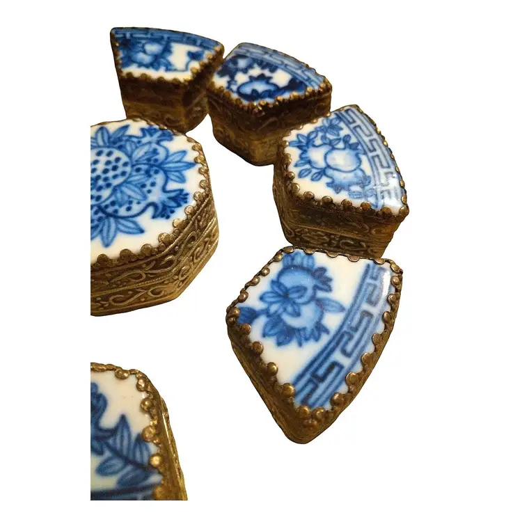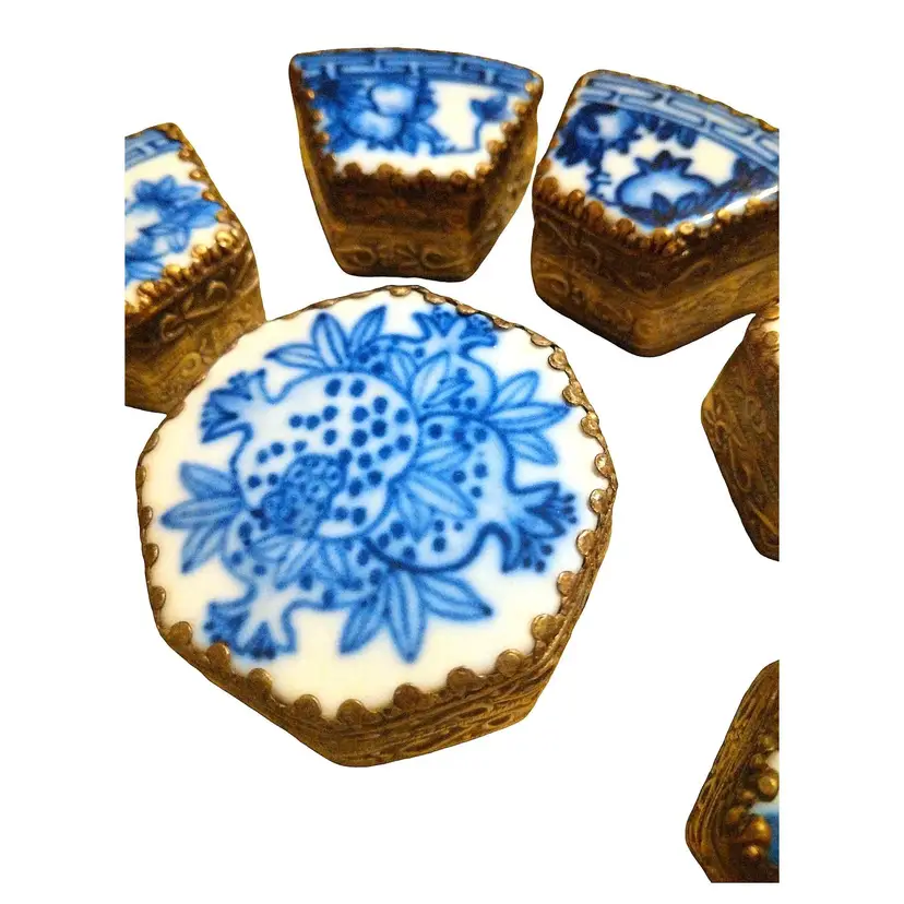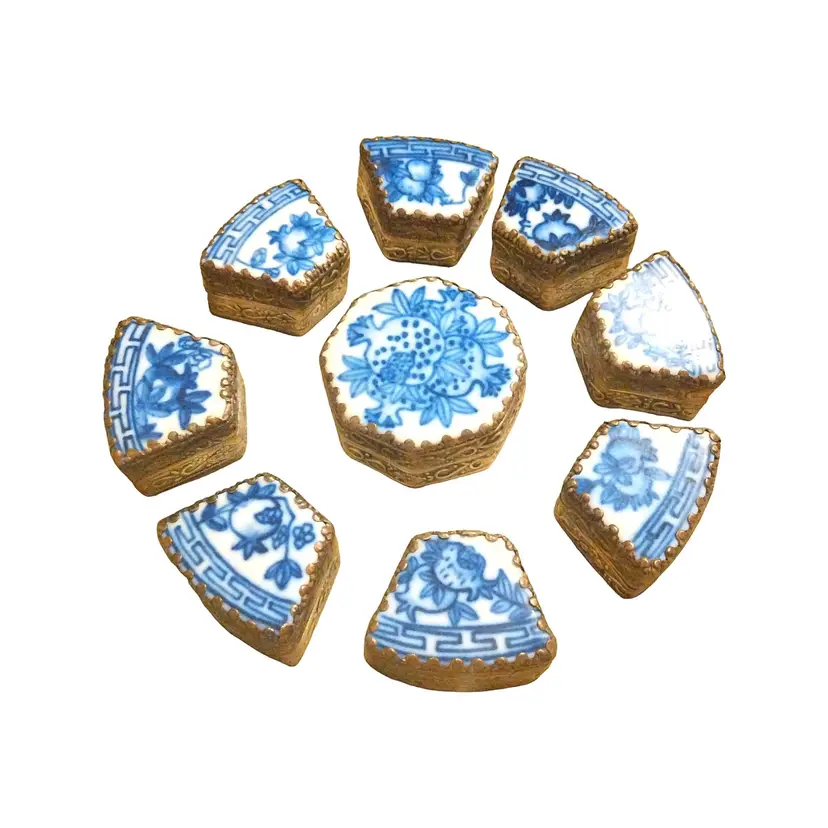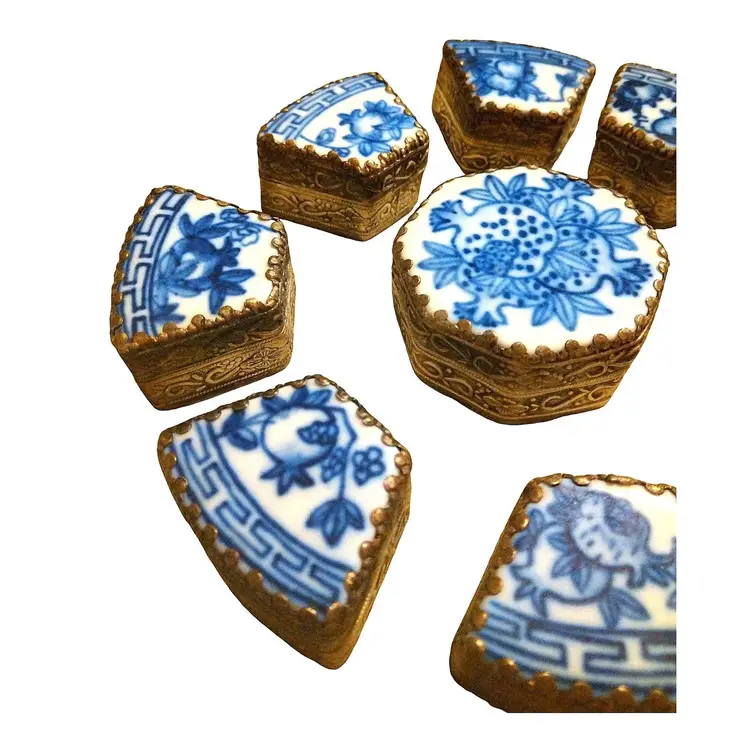 This Chard Box collection features 9 pieces in its original box and is blue and white with white brass finishes. It is 5" wide x 1.5" tall. In beautiful original condition.