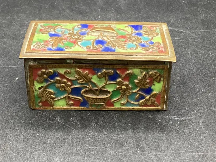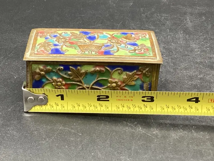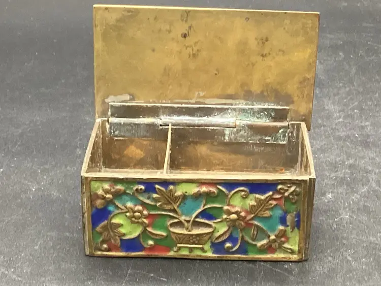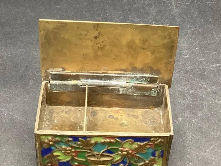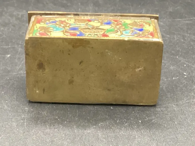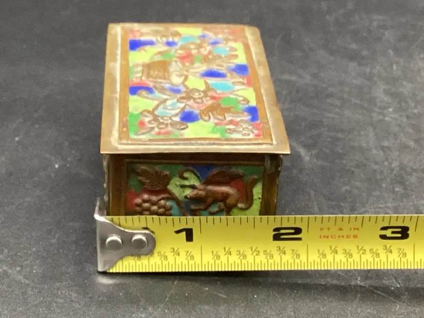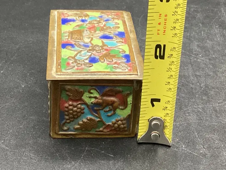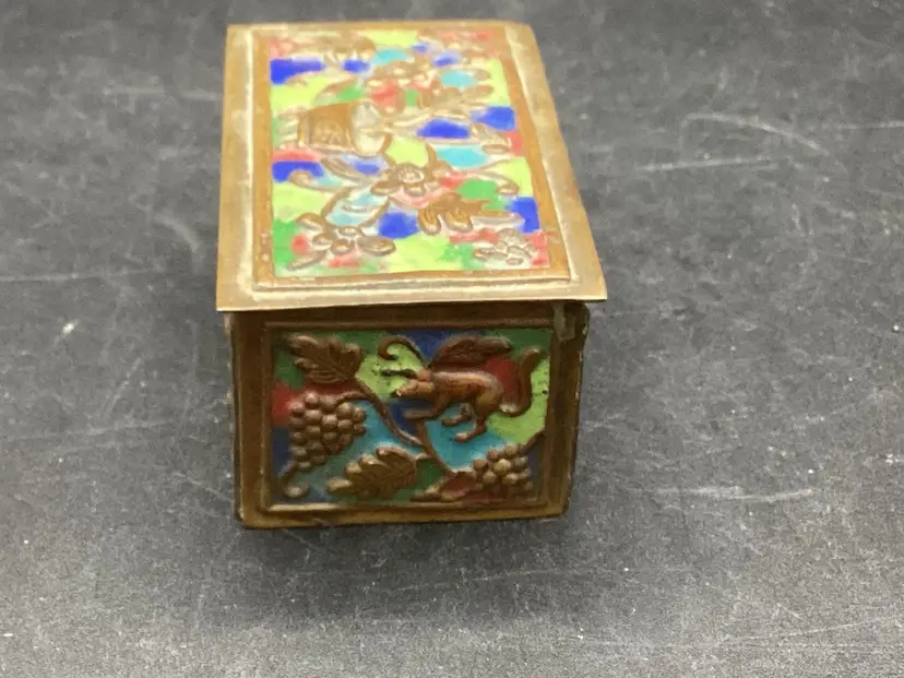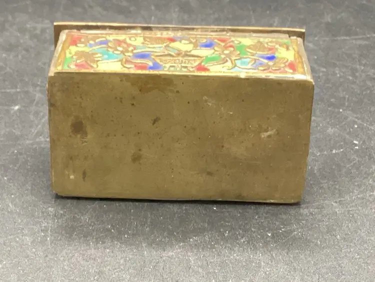 This is a small Chinese brass cloisonné box made to hold stamps. Very nice vintage condition. For a motive with small animals on each end. Stamped China on the bottom.
