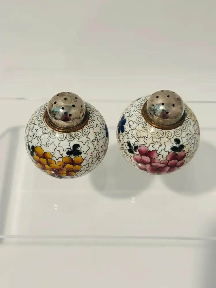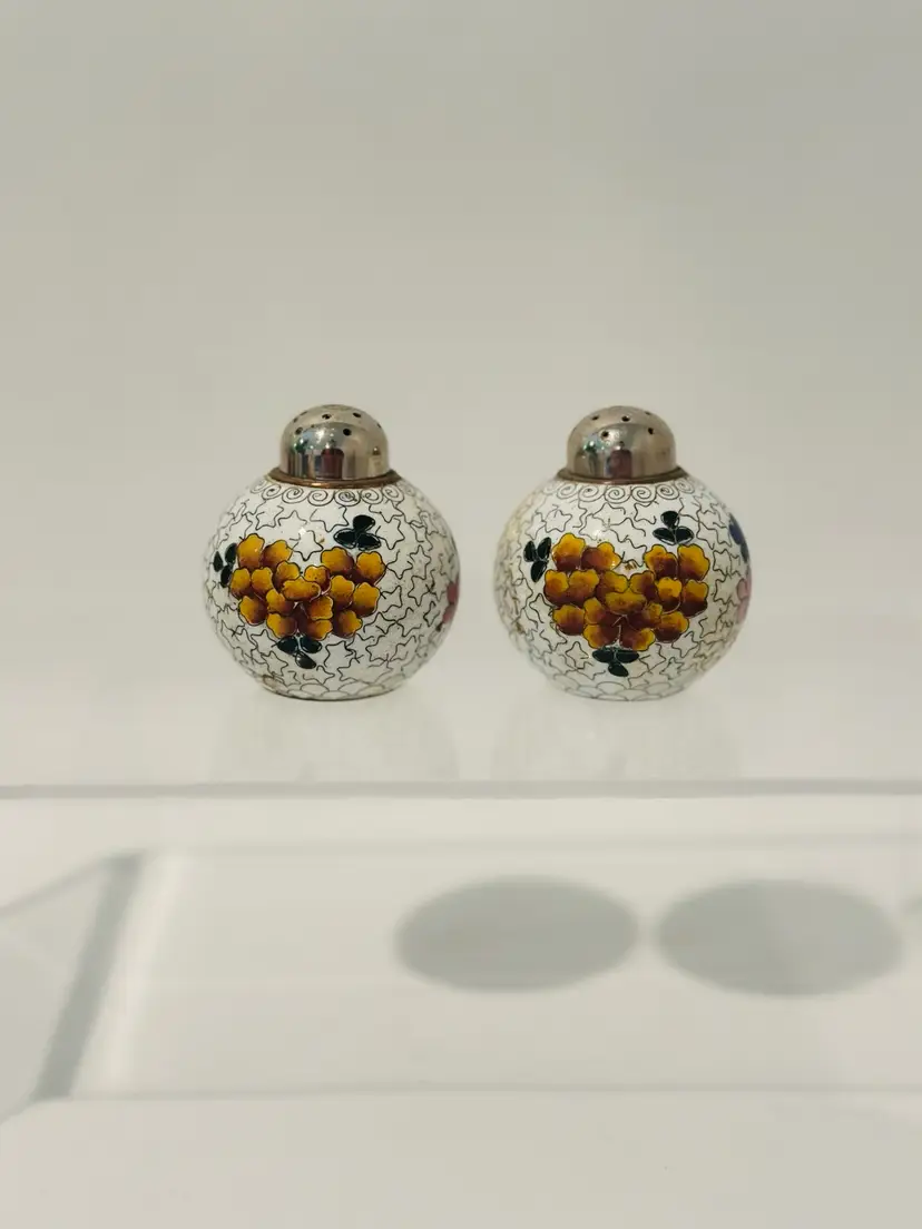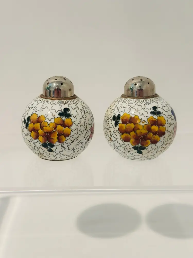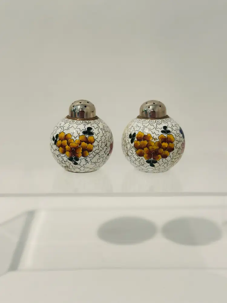Spice up your dining experience with this vintage Chinese cloisonné salt and pepper shaker set. With a beautiful purple and yellow floral enamel pattern, these round metal shakers will add a touch of antique style to any occasion.