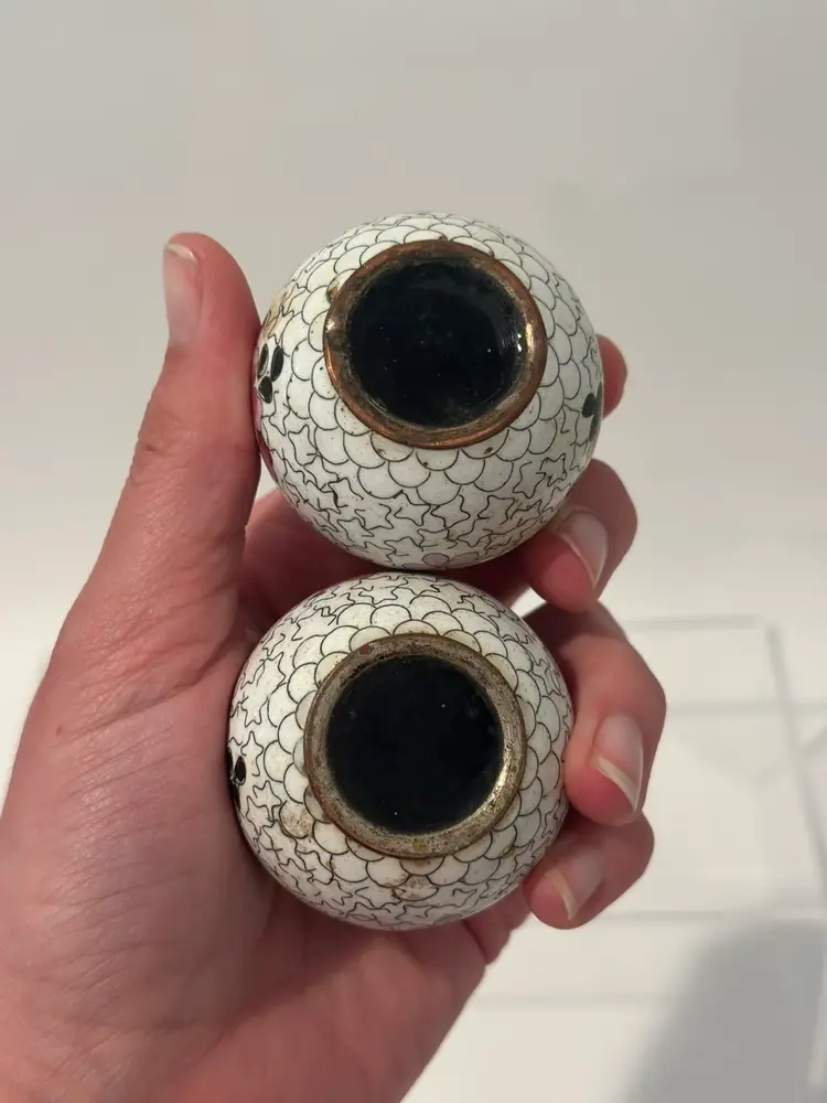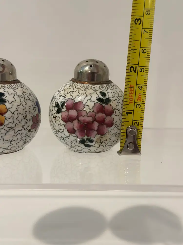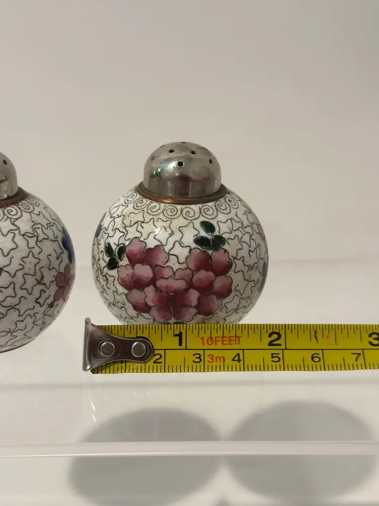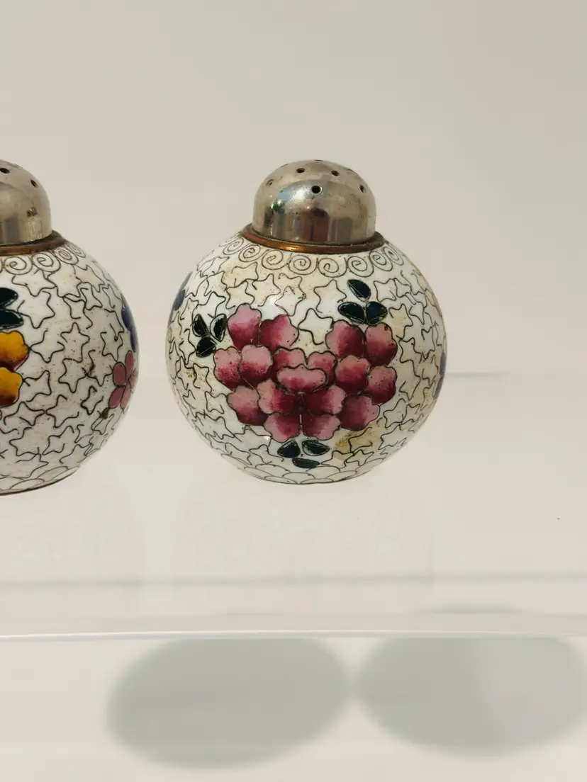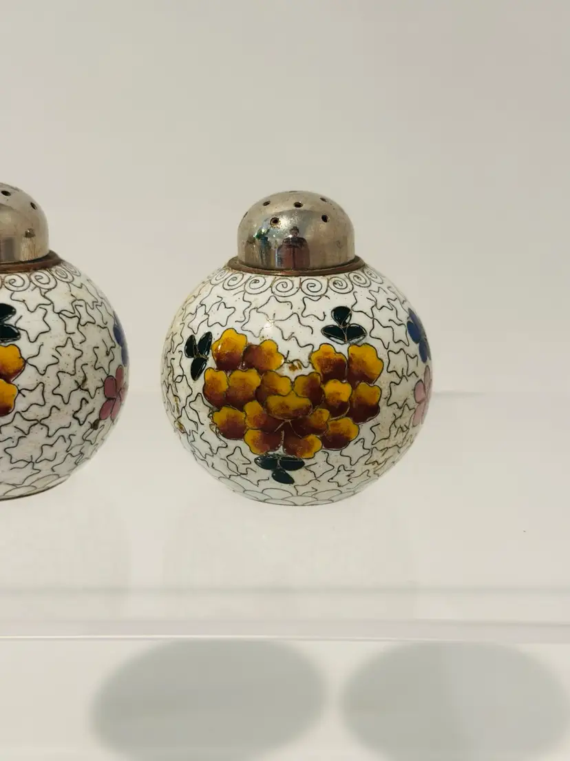 Spice up your dining experience with this vintage Chinese cloisonné salt and pepper shaker set. With a beautiful purple and yellow floral enamel pattern, these round metal shakers will add a touch of antique style to any occasion.