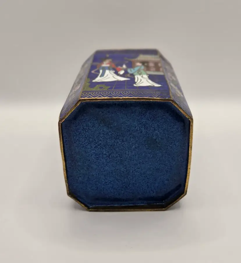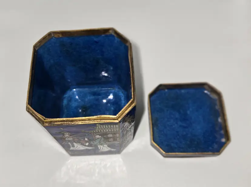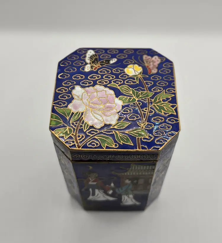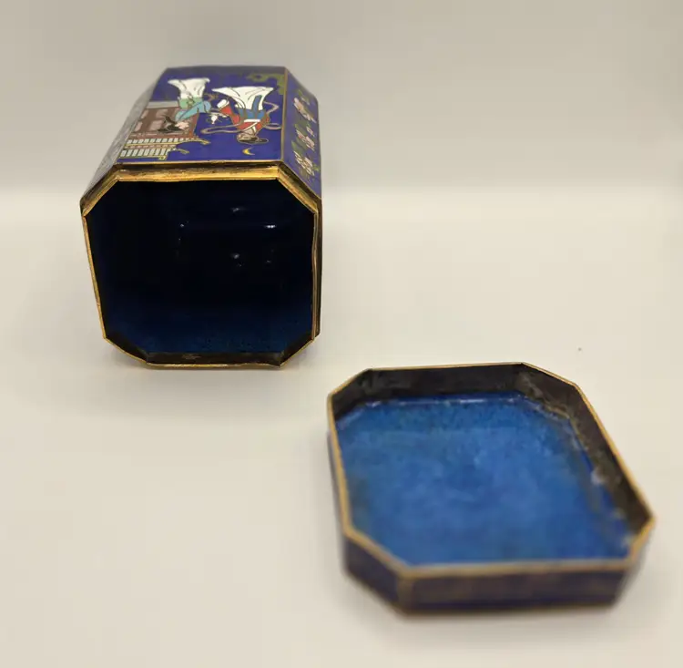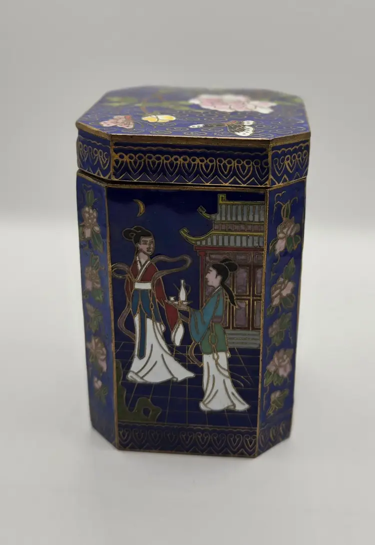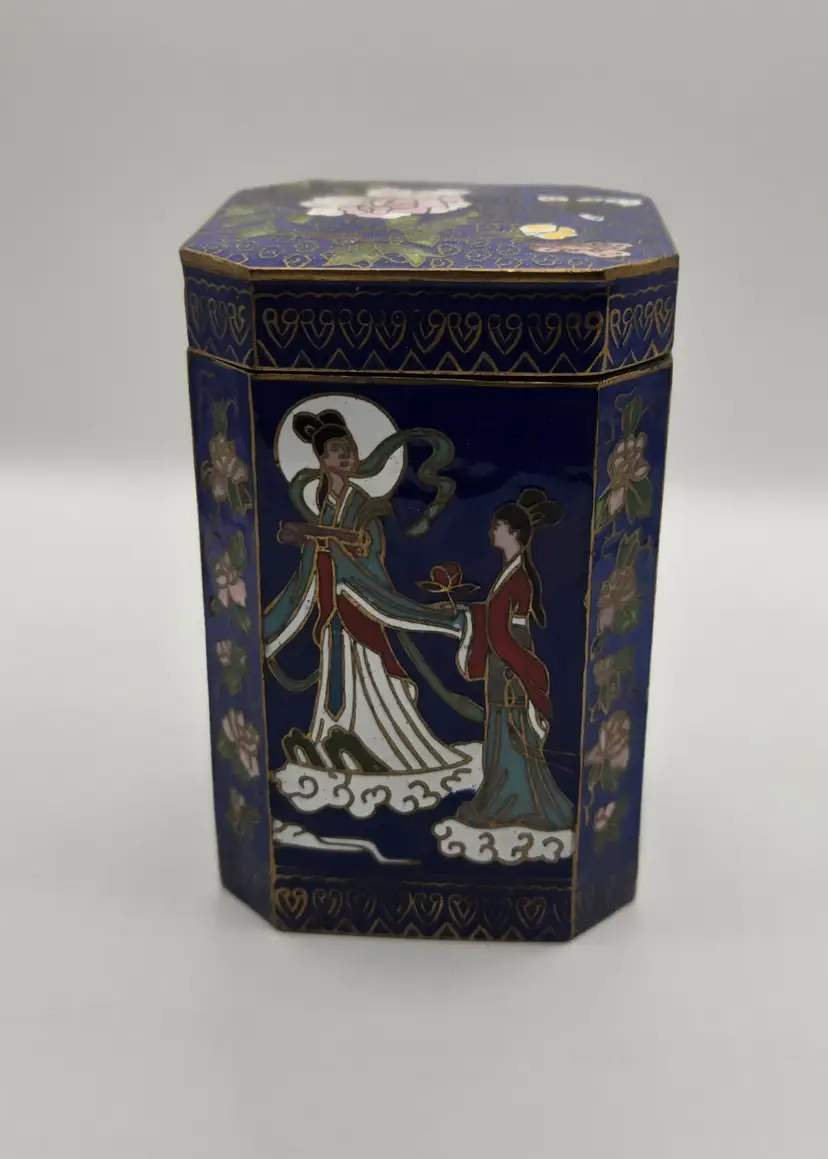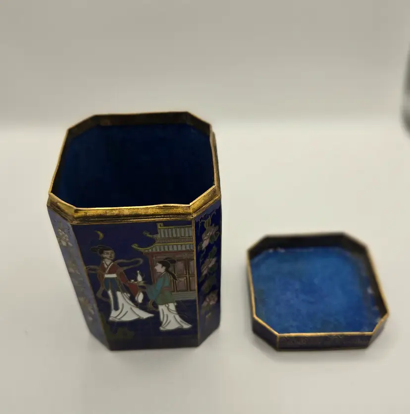 Vintage Cloisonne Tea Caddy, Enamel on brass 3.6" x 2.5" Cobalt Blue Enamel. Good Vintage condition with no enamel losses. Please check photos as they are part of the description. Item will be well wrapped before shipping. Items from my listings can be combined for shipping if safe to do so.