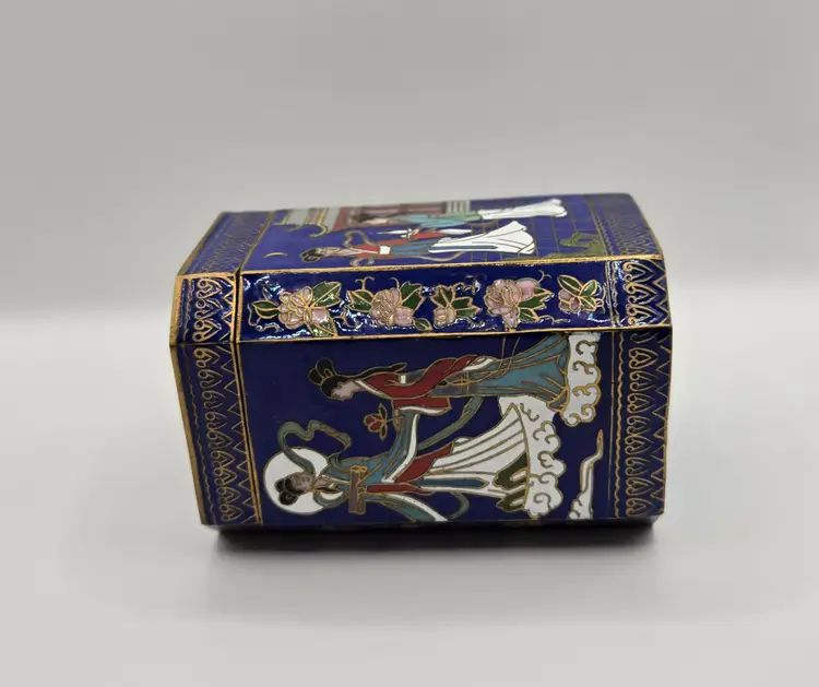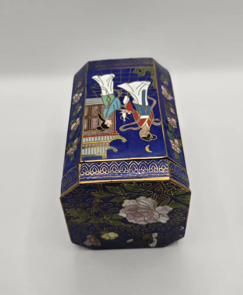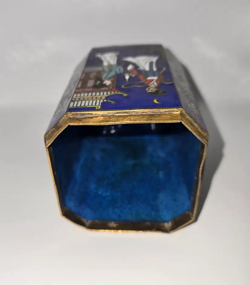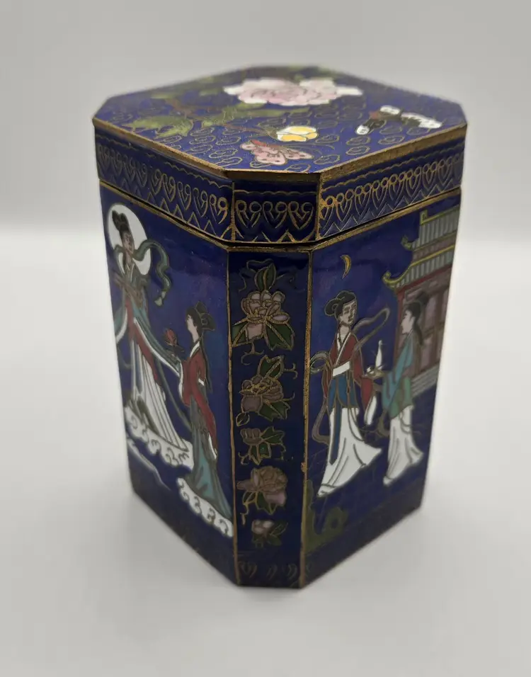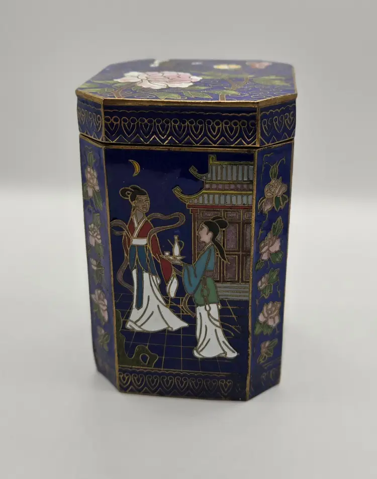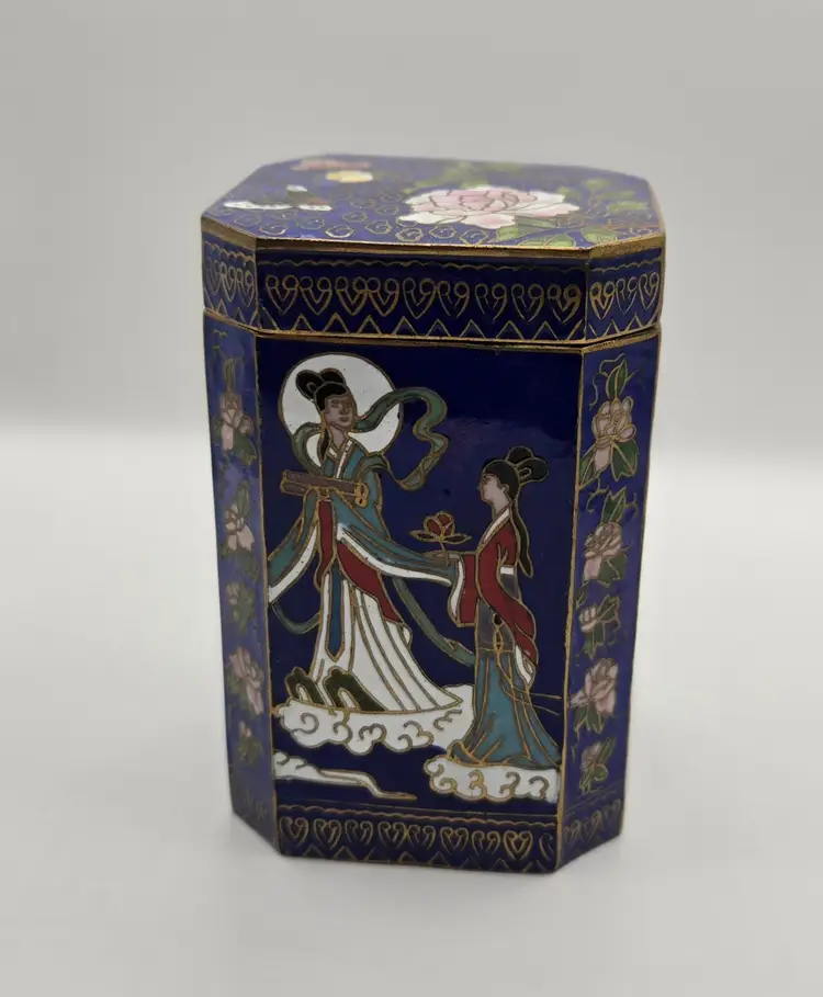 Vintage Cloisonne Tea Caddy, Enamel on brass 3.6" x 2.5" Cobalt Blue Enamel. Good Vintage condition with no enamel losses. Please check photos as they are part of the description. Item will be well wrapped before shipping. Items from my listings can be combined for shipping if safe to do so.