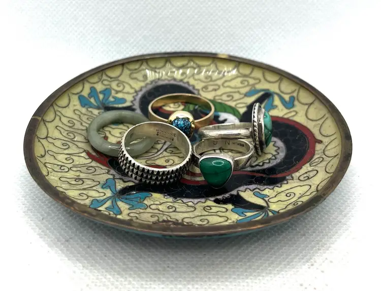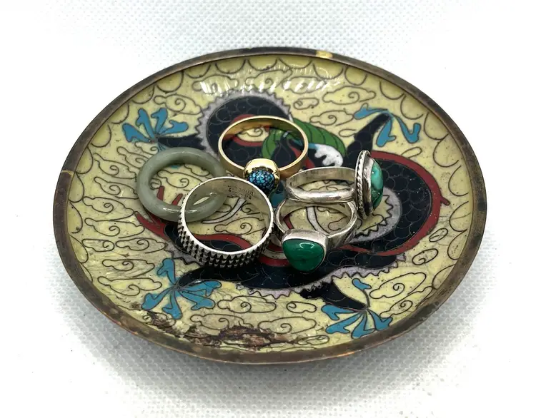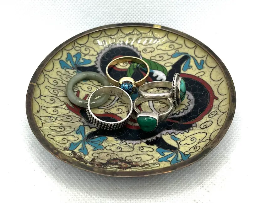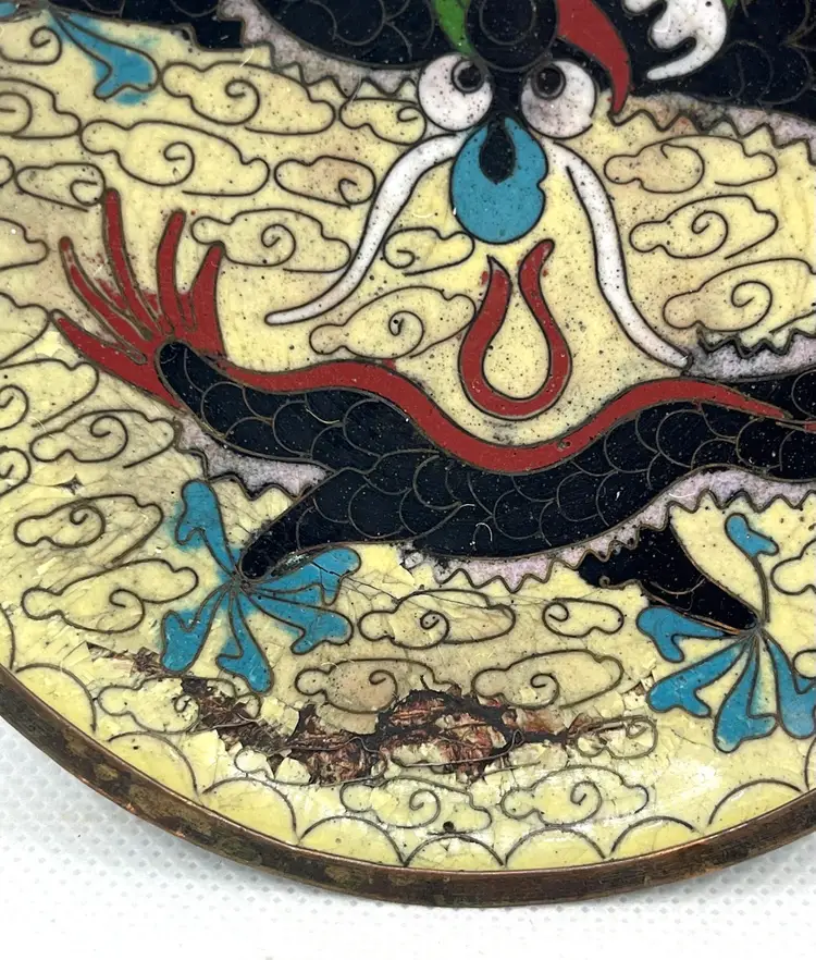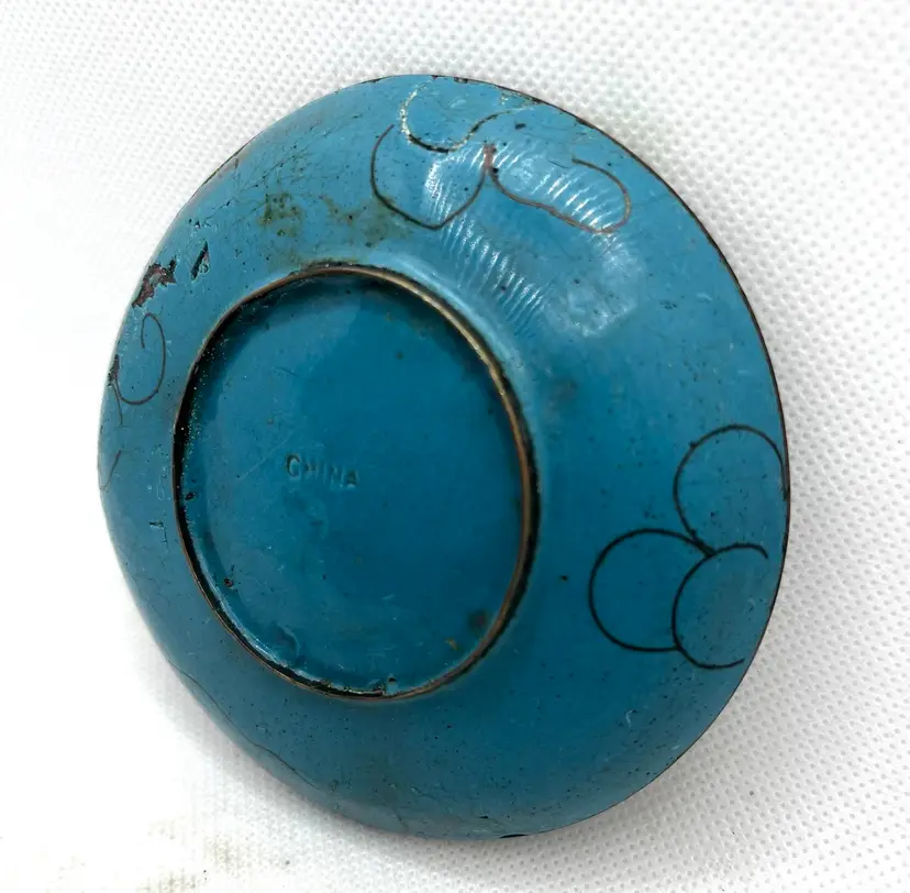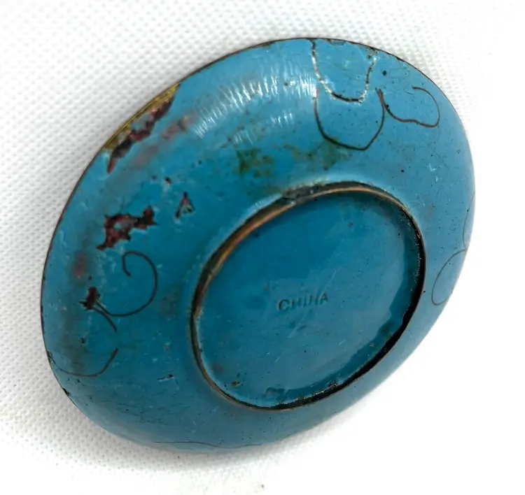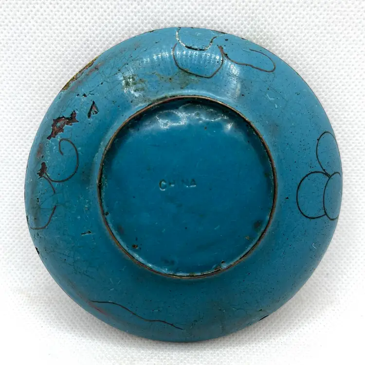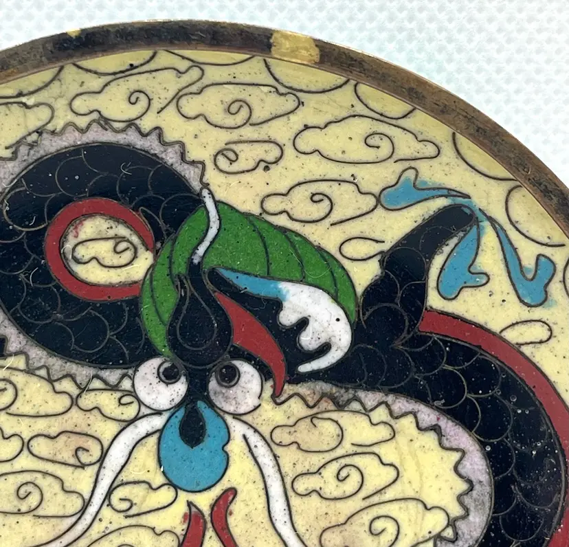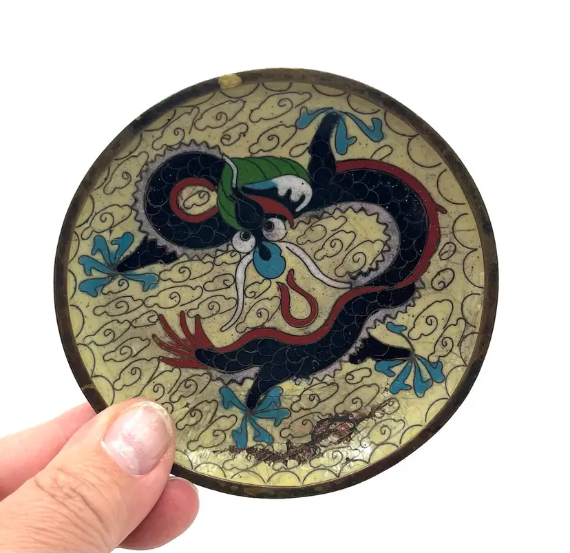 Vintage Chinese cloisonné trinket or pin dish featuring a dragon motif 3.75” The dish showcases a prominent dragon design, a common and auspicious motif in Chinese art and culture, often associated with power and good fortune. These small, round dishes are typically used as trinket dishes, pin dishes, or decorative items. Has aged surface wear and patina, see photos.