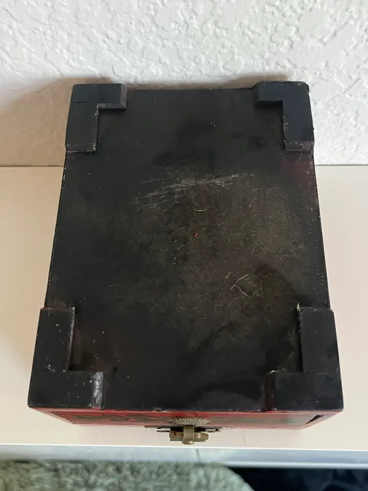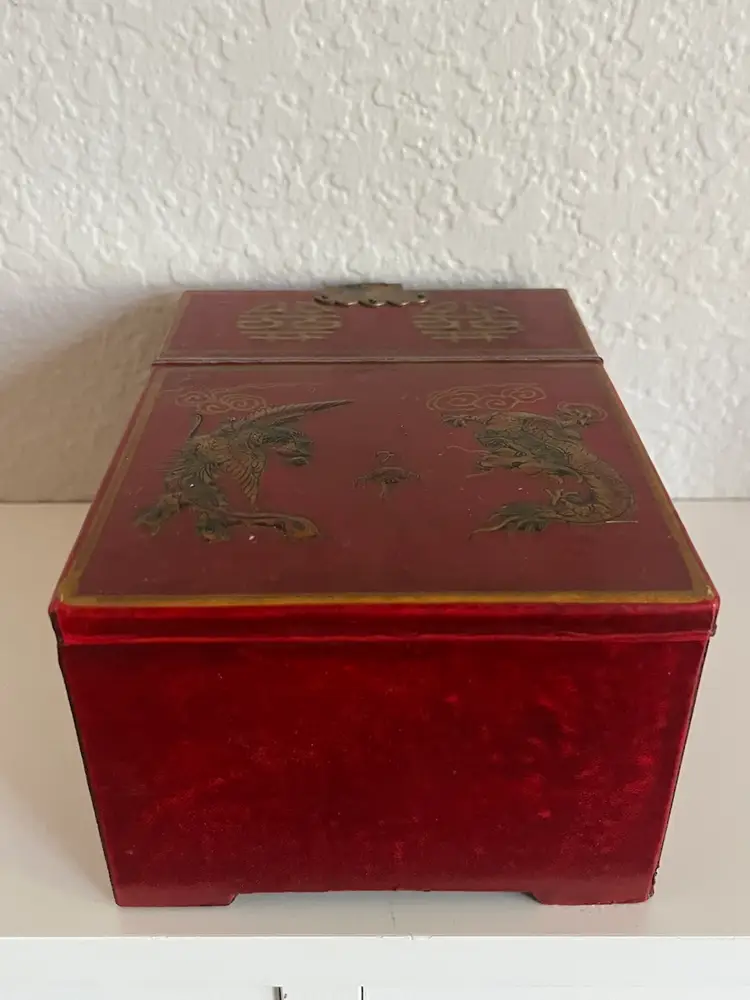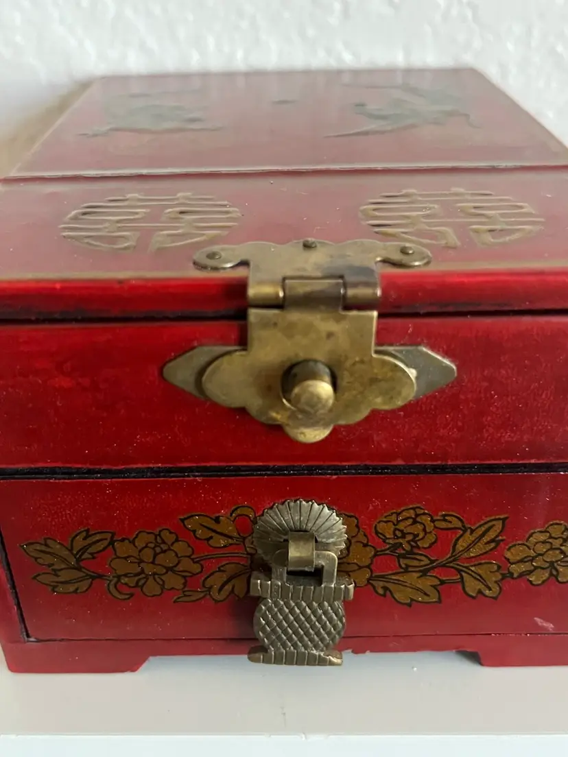 The is a beautiful vintage Chinese jewelry box, lmade of wood with a red lacquer finish and brass hardware. These boxes are often used for storing jewelry or as decorative accents.