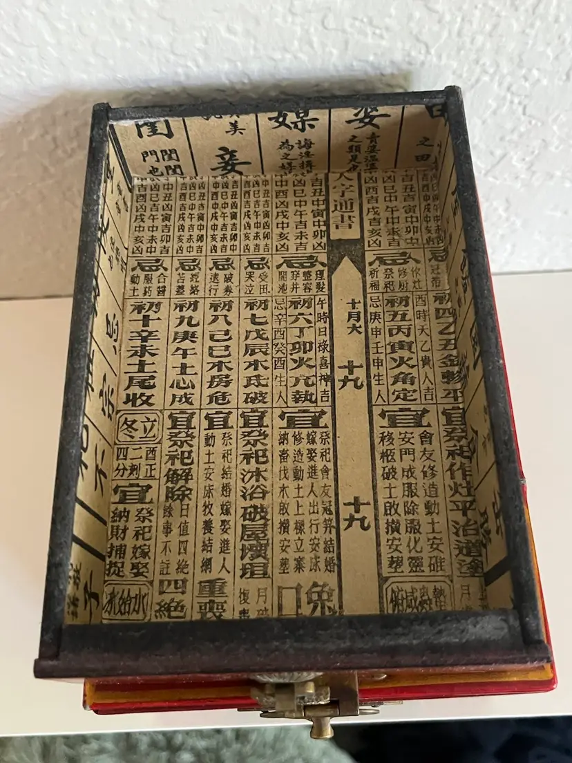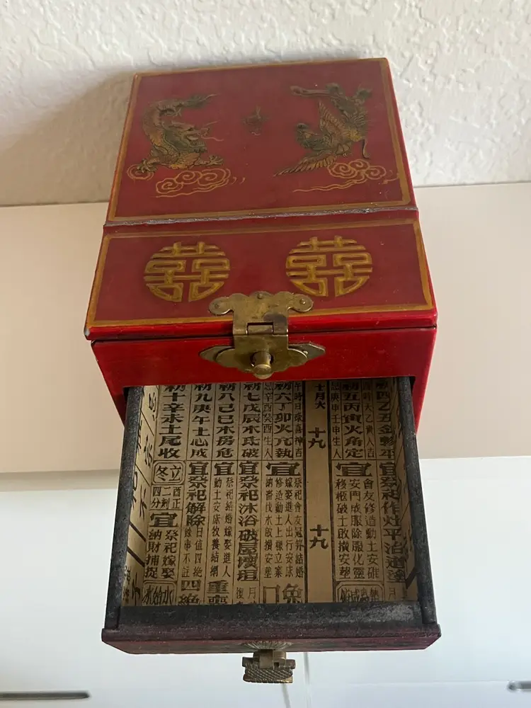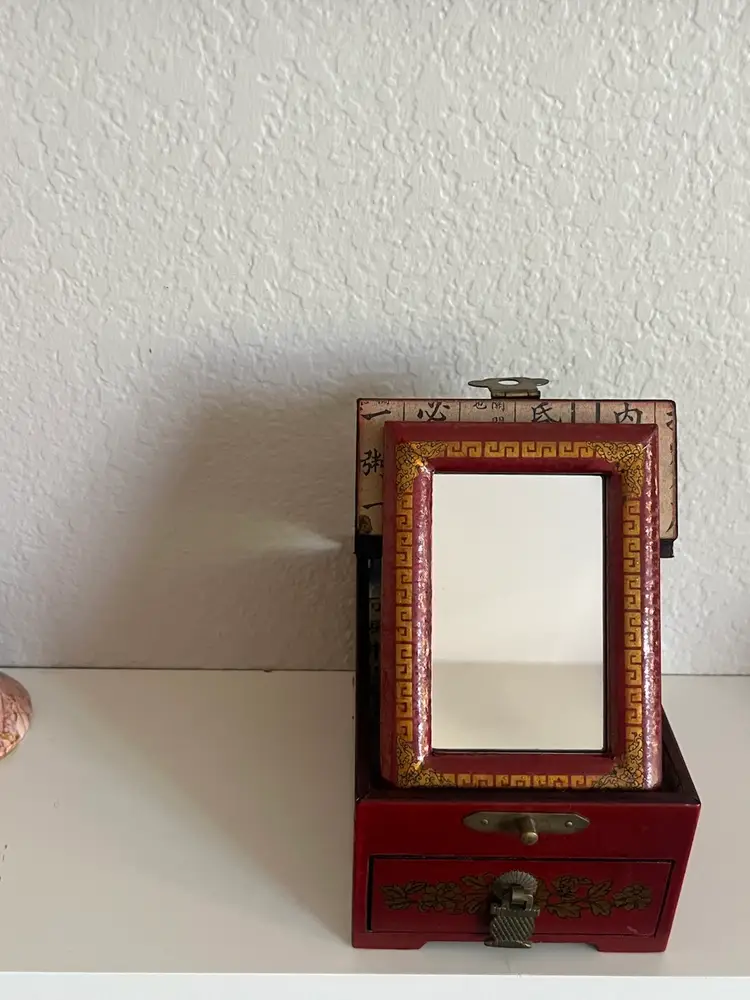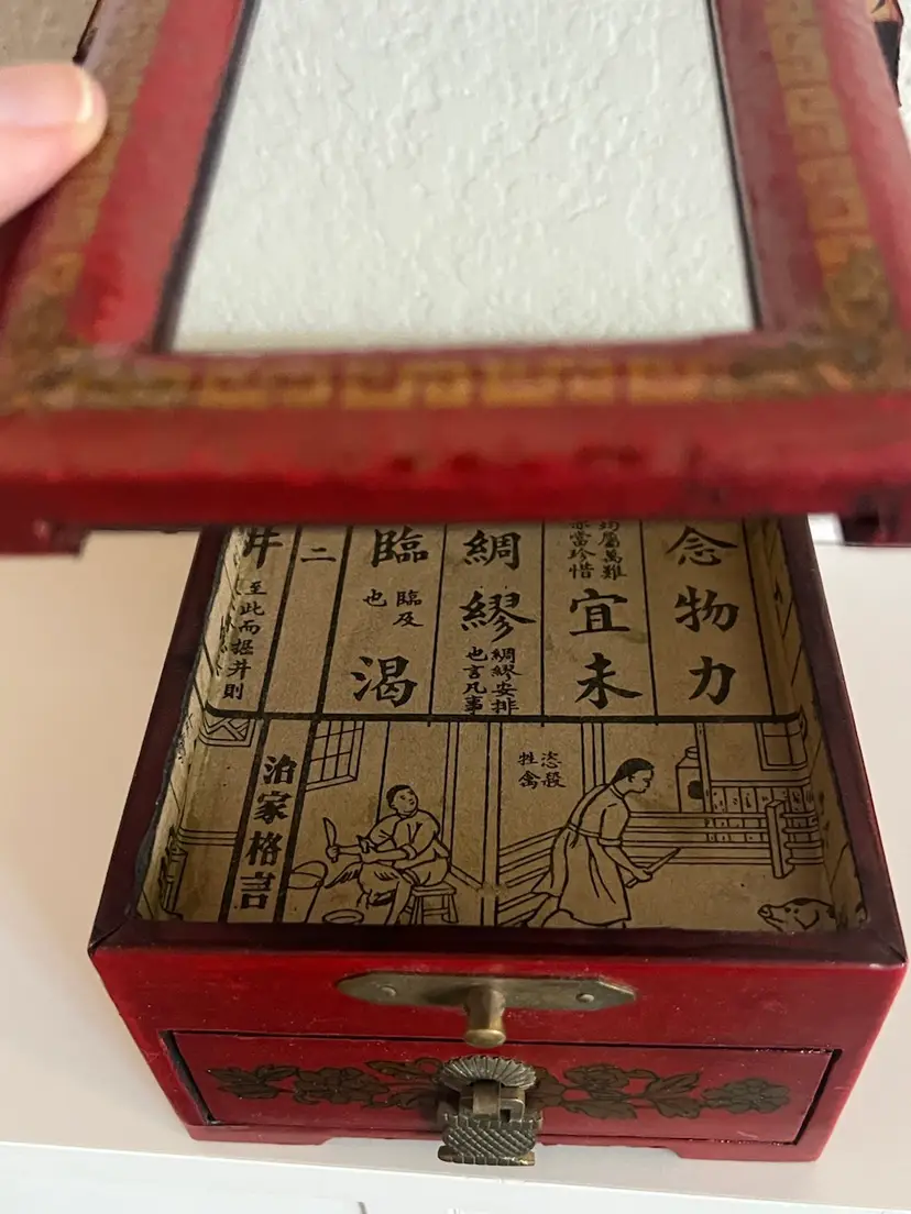 These boxes often feature intricate designs like dragons, phoenixes, or traditional Chinese characters. This one includes one drawer, a top storage space, and a built-in mirror.