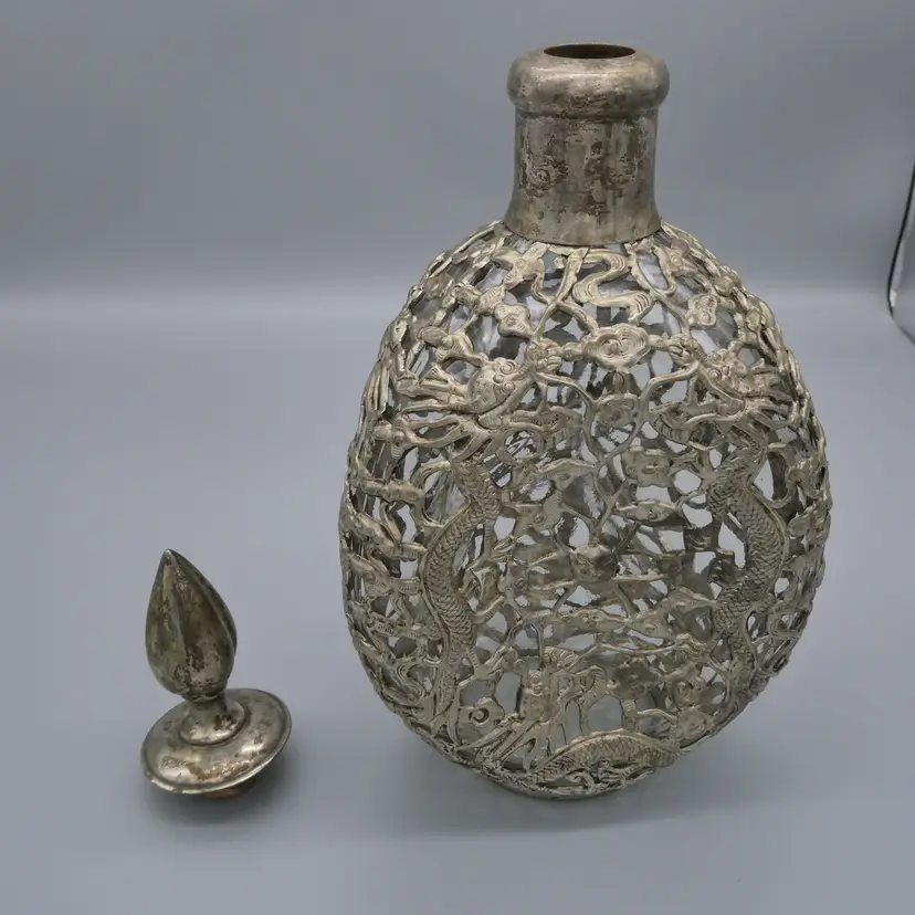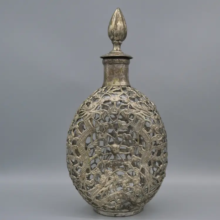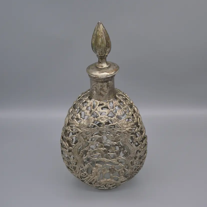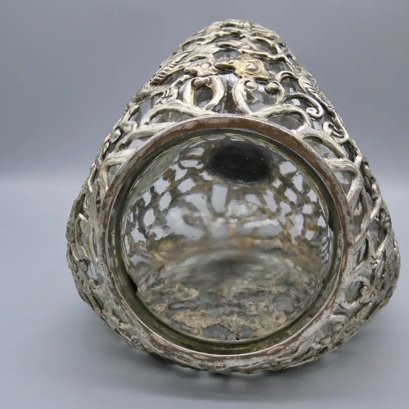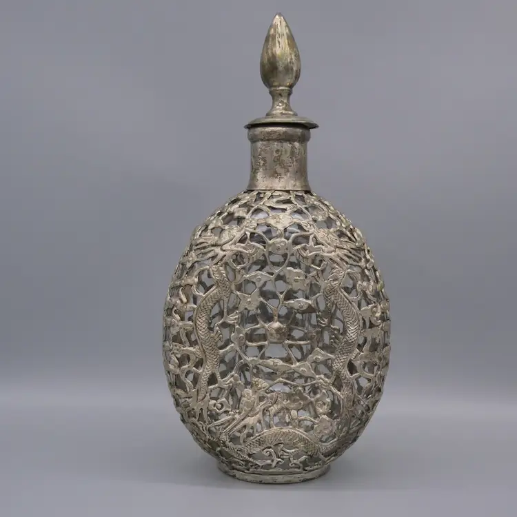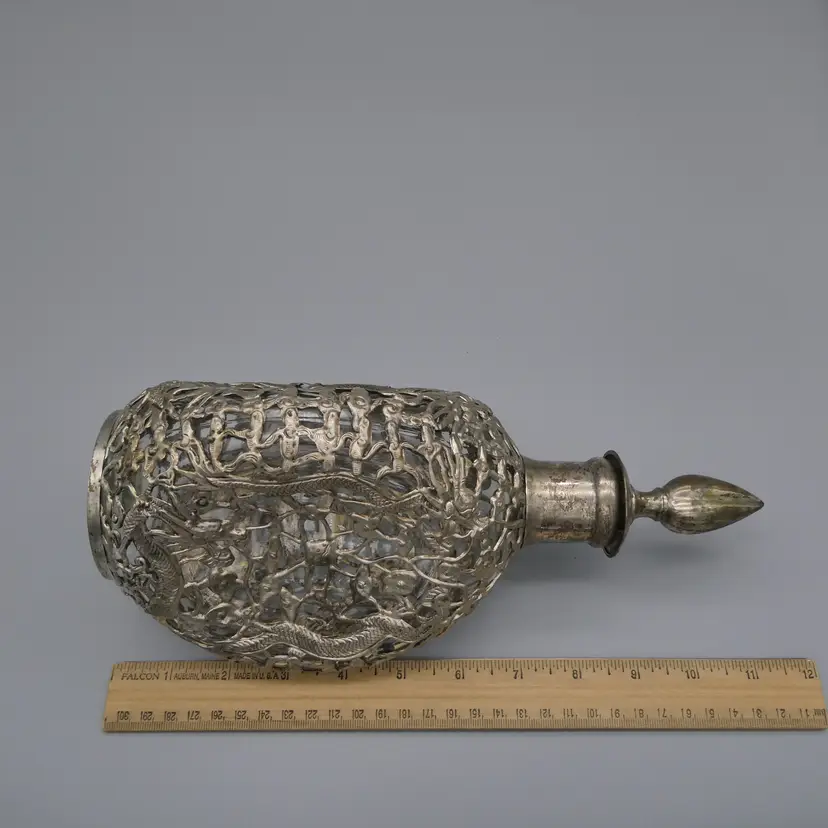 I picked this beauty out in the wild while in Sweden Design depicts Chinese dragons chasing flaming pearls (symbolizes wisdom and power) Pinched clear glass decanter is ornately caged in a silver on copper overlay Finial stopper with a cork About a 1 liter / 4 cup capacity Dates around the 1950s Unmarked Measures overall about 11" tall including stopper x 5" wide Measures about 8-3/8" tall without stopper Weighs about 1 pound 12 ounces