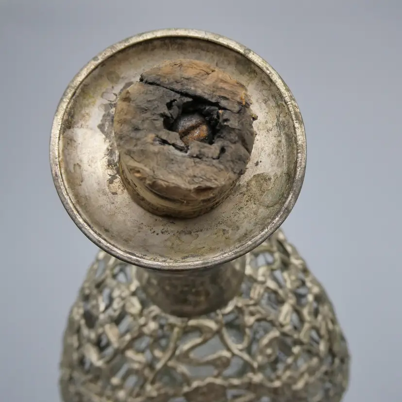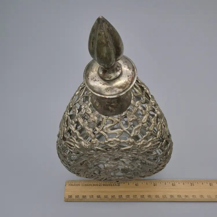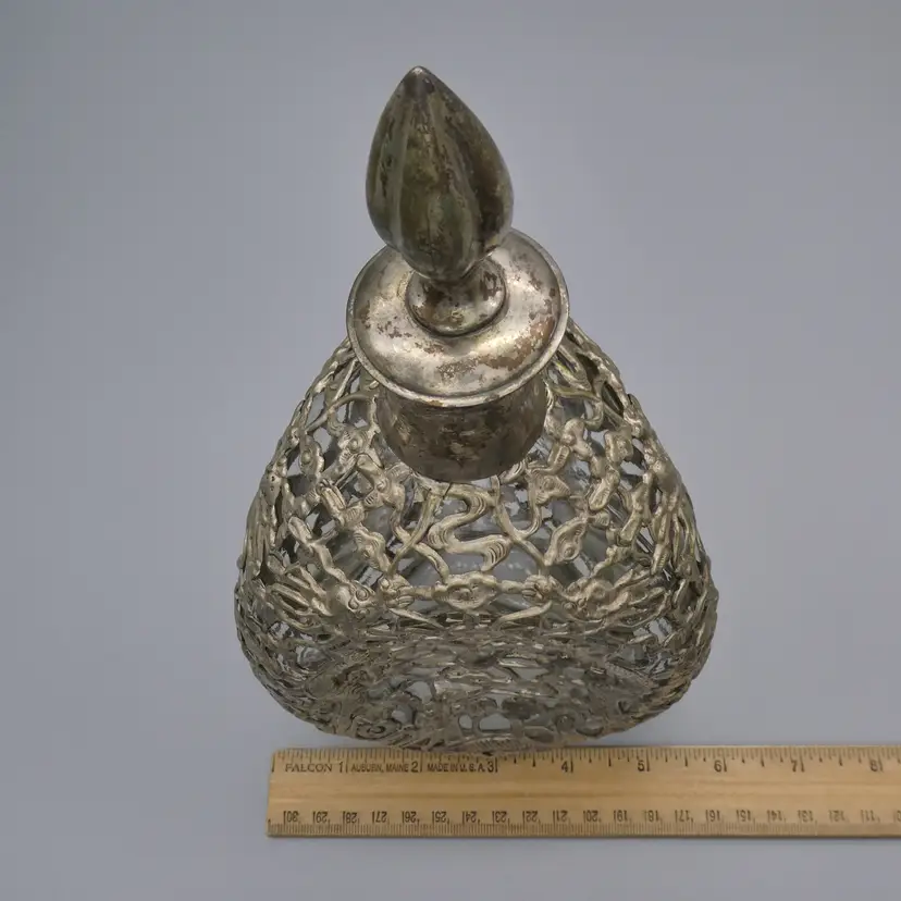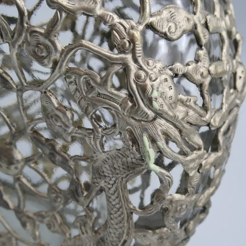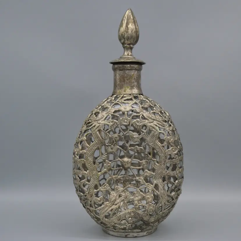 I picked this beauty out in the wild while in Sweden Design depicts Chinese dragons chasing flaming pearls (symbolizes wisdom and power) Pinched clear glass decanter is ornately caged in a silver on copper overlay Finial stopper with a cork About a 1 liter / 4 cup capacity Dates around the 1950s Unmarked Measures overall about 11" tall including stopper x 5" wide Measures about 8-3/8" tall without stopper Weighs about 1 pound 12 ounces