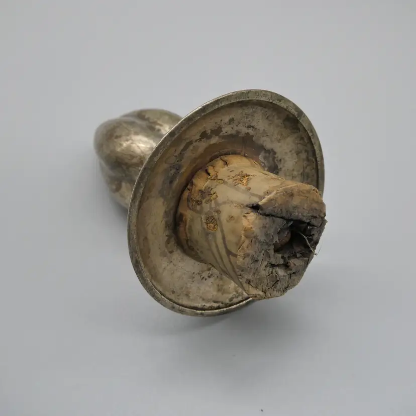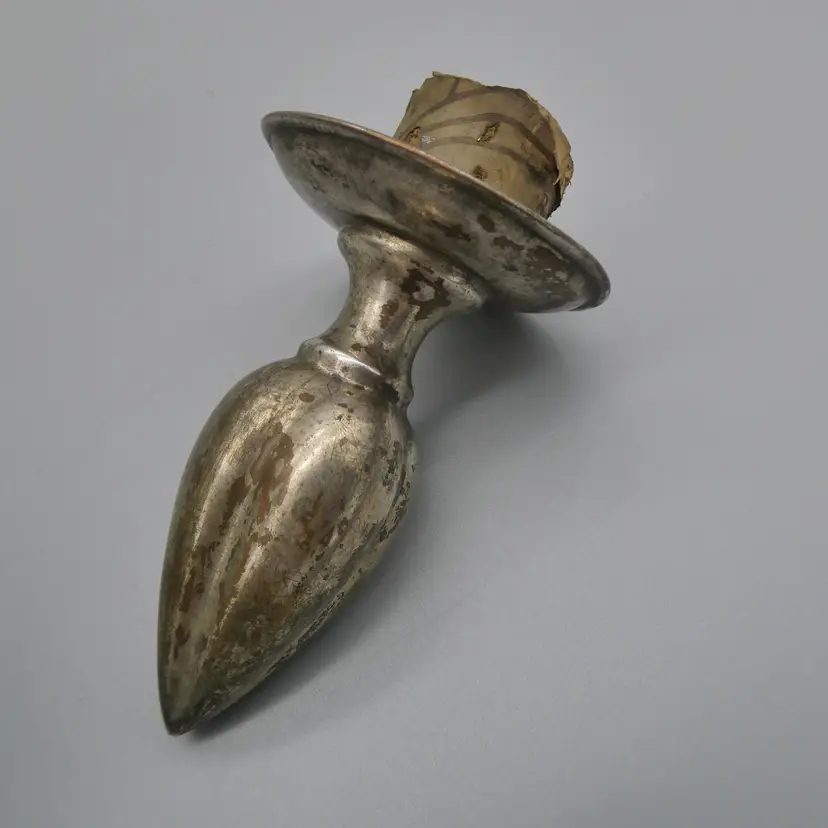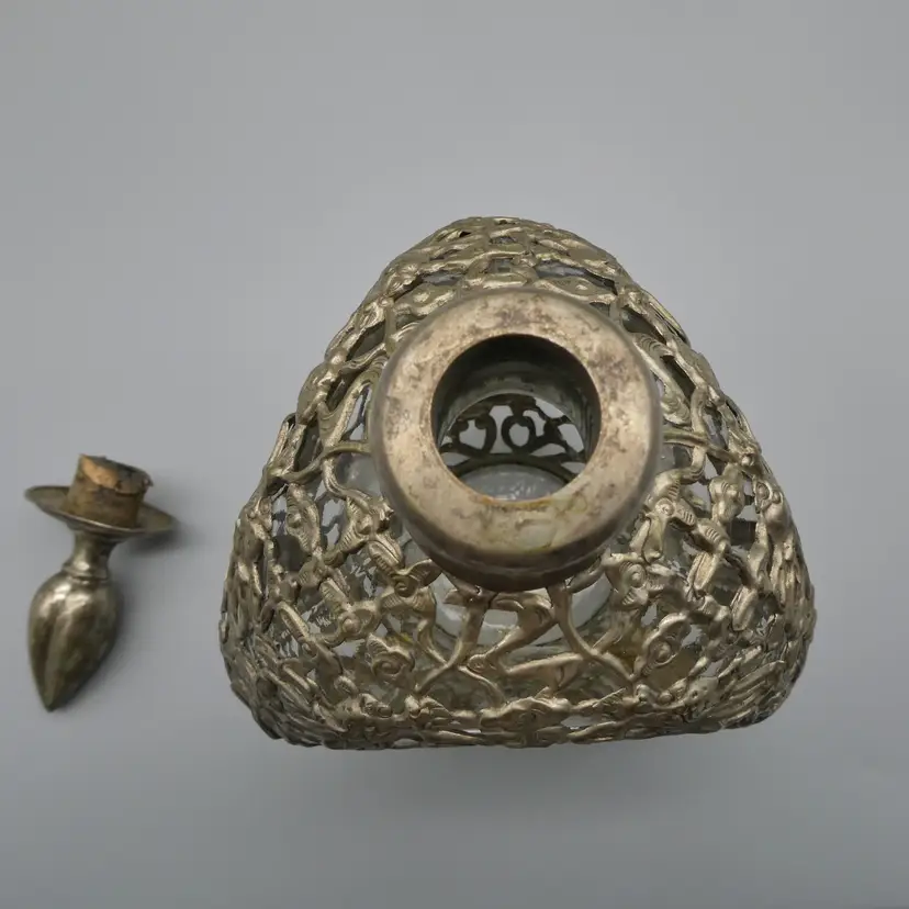 Overall, good vintage condition with definite signs of age/use/wear including the cork stopper degrading from time/use, the cork's screw is wobbly/rusty, and there are two small spots of stray paint present on the overlay (can probably be easily removed, but I don't want to damage the piece). Metal is in original, unpolished condition with patina/tarnish/discoloration, has silver loss and the rim of the stopper is a little wonky. No chips or cracks detected on the glass