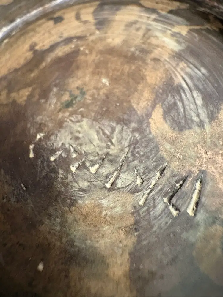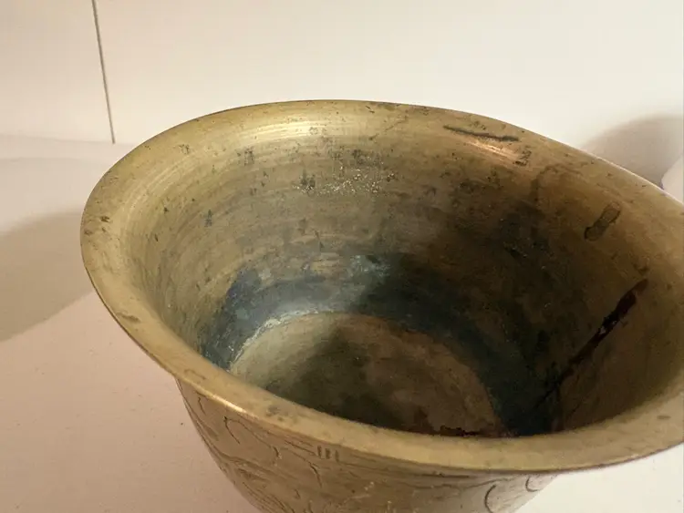 This is a vintage heavy brass bowl with a dragon design. It measures 3 1/2 “ tall and 5 1/2” diameter.