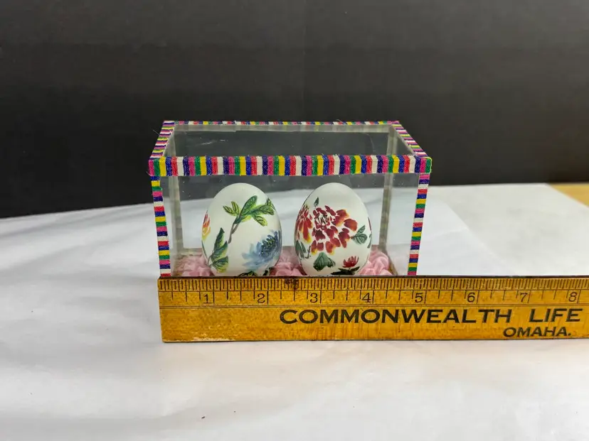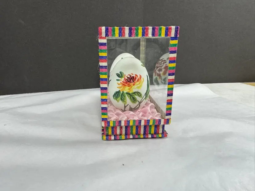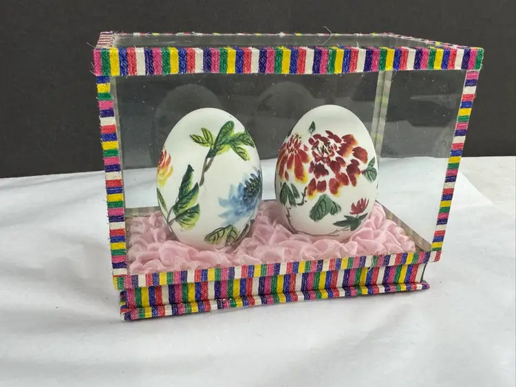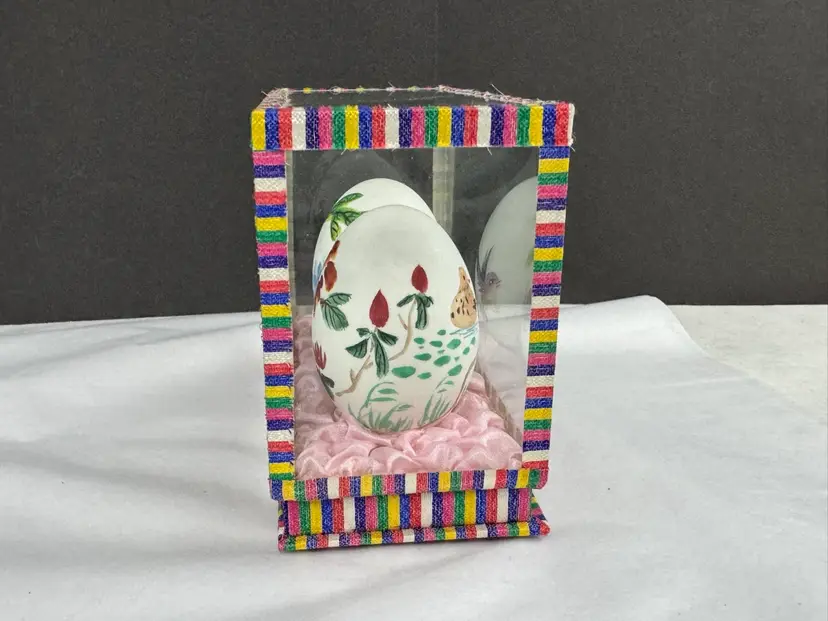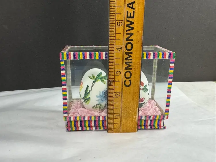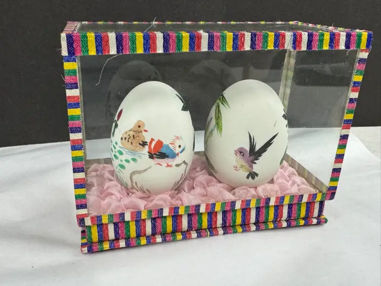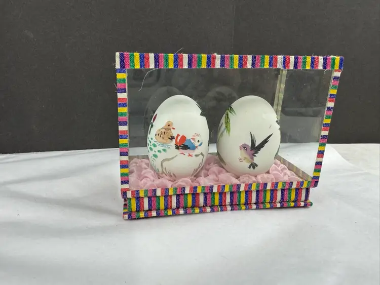 eggs are real, hollowed-out eggshells that have been painted with floral and bird designs & display case is made of glass and wood, rainbow fabric lining & pink Fabric inside.