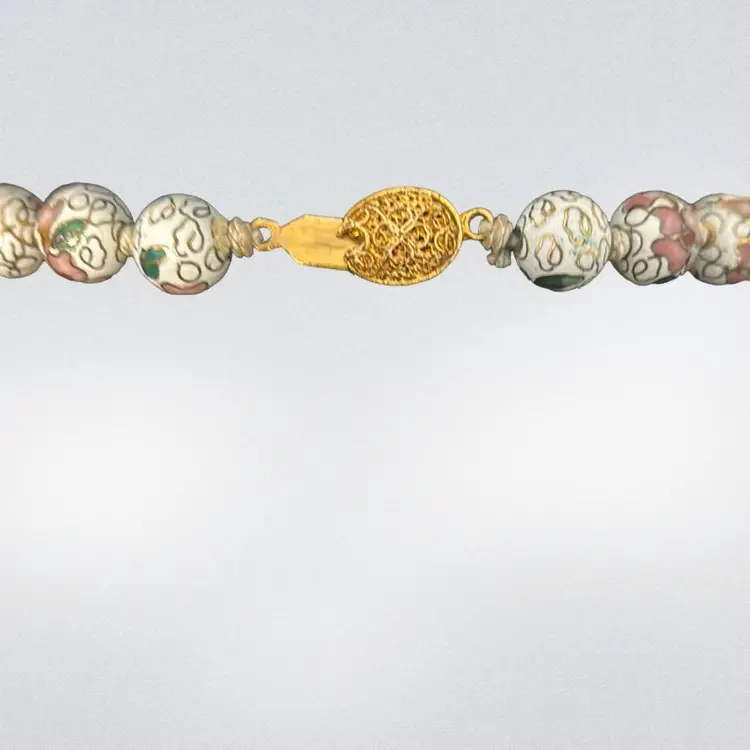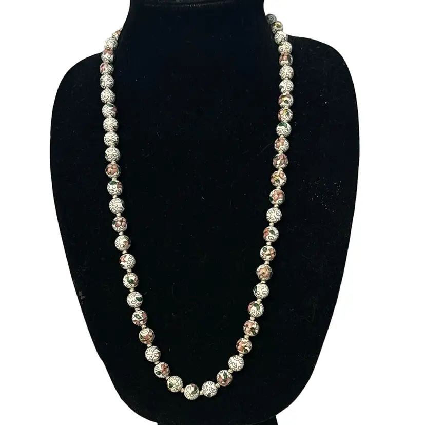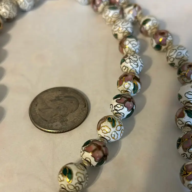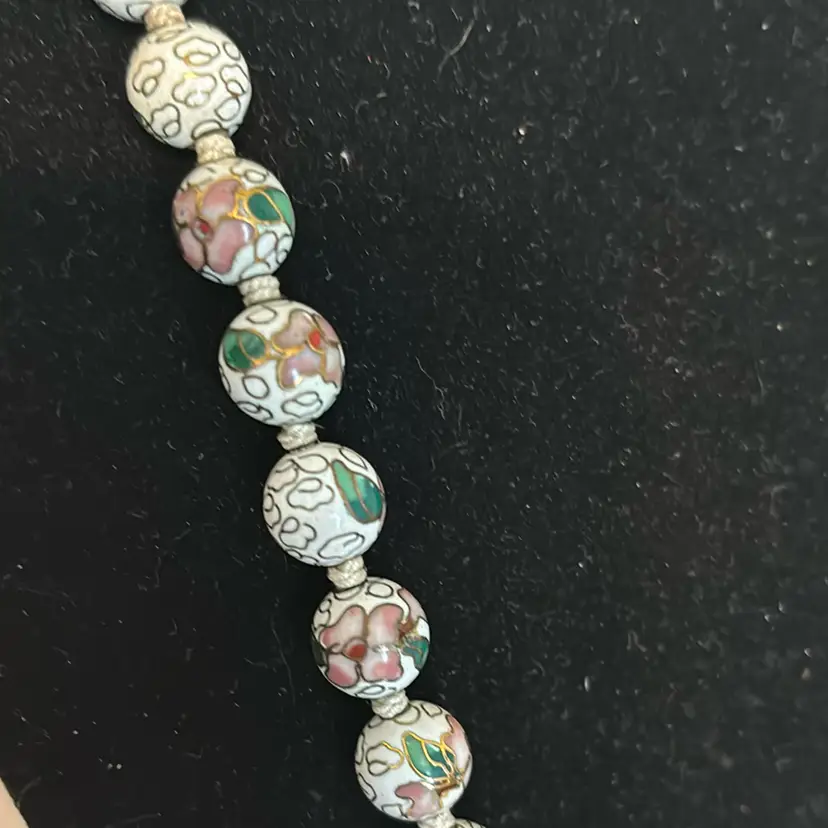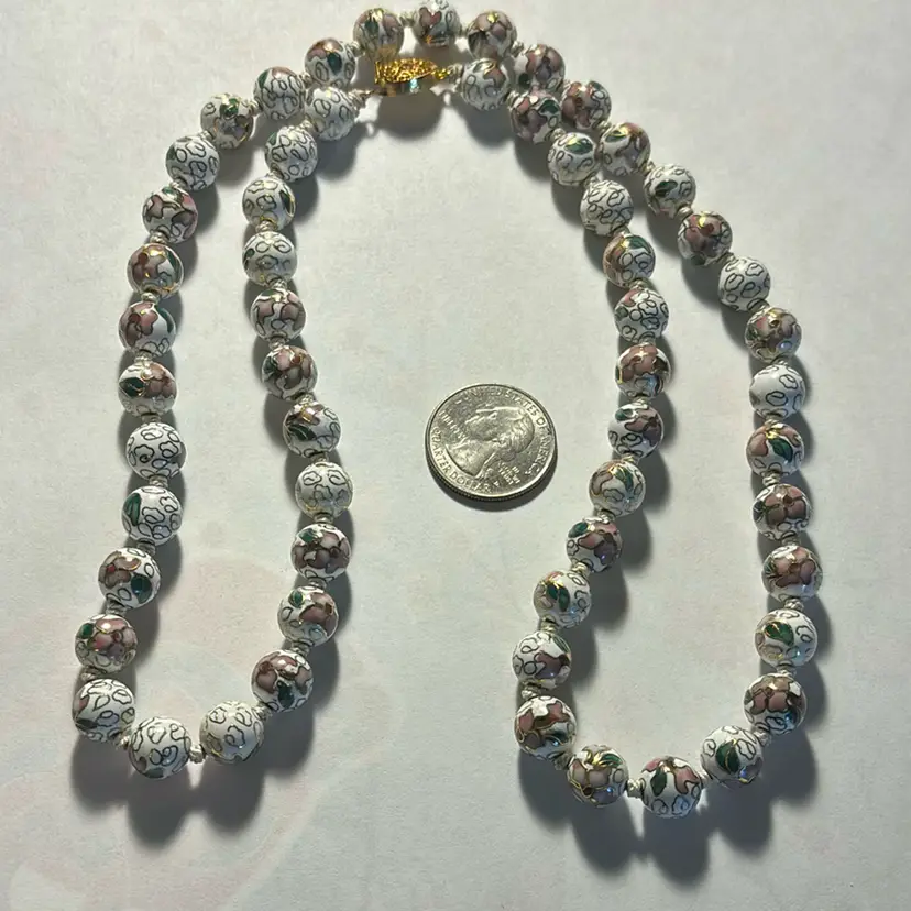This is a very beautiful, old and unique CHINESE GREEN CLOISONNE ENAMEL c. 1920 necklace . The necklace has a marvelous cloisonne beads (9 mm) hand painted with green, gold, pink tiny flowers, knotted It measures 29” long. The necklace is in perfect condition. Sold for over $100 on other platforms!