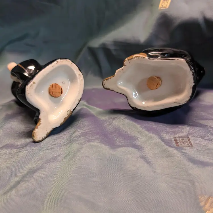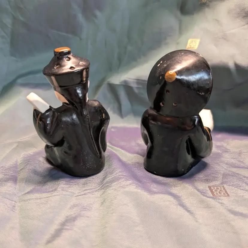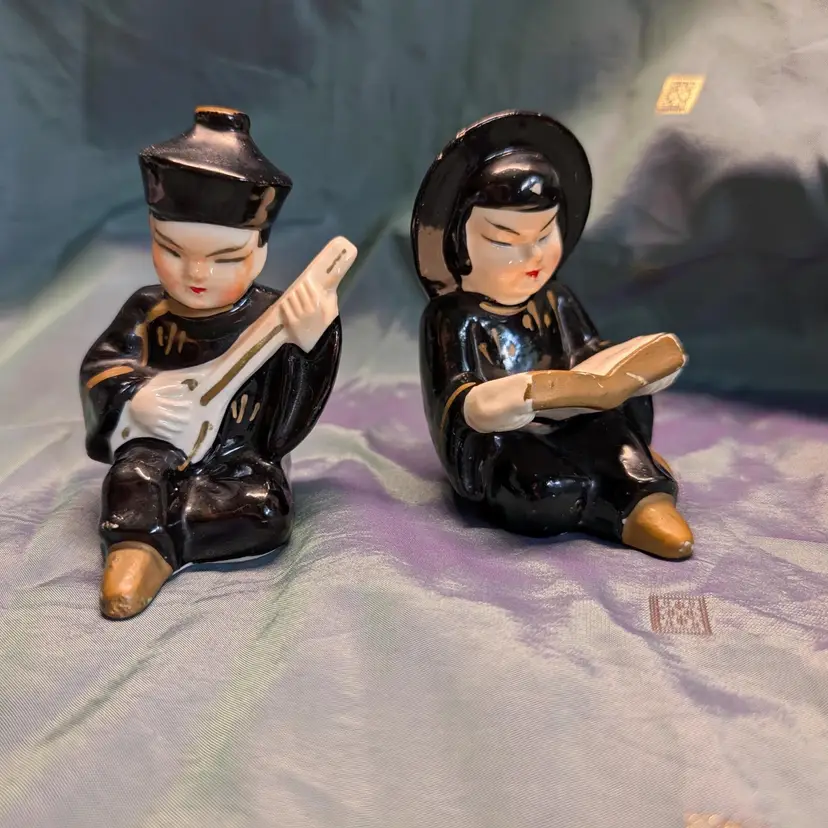 Vintage Chinese or Japanese Couple Salt and Pepper Shakers complete with cork stoppers are sure to spice up your kitchen or collection of shakers. One holding a lute and the other a book, these handpainted figures probably date to the 1950s and measure about 2.5in diameter and 3.25in tall with minimal paint loss due to age. Please see pictures as they are part of the description.