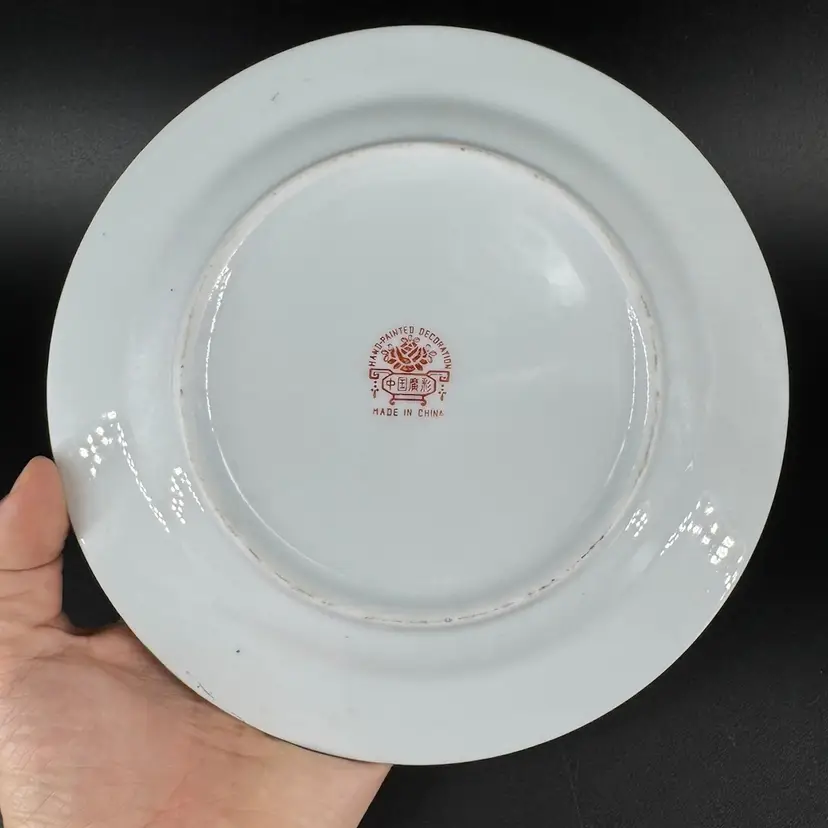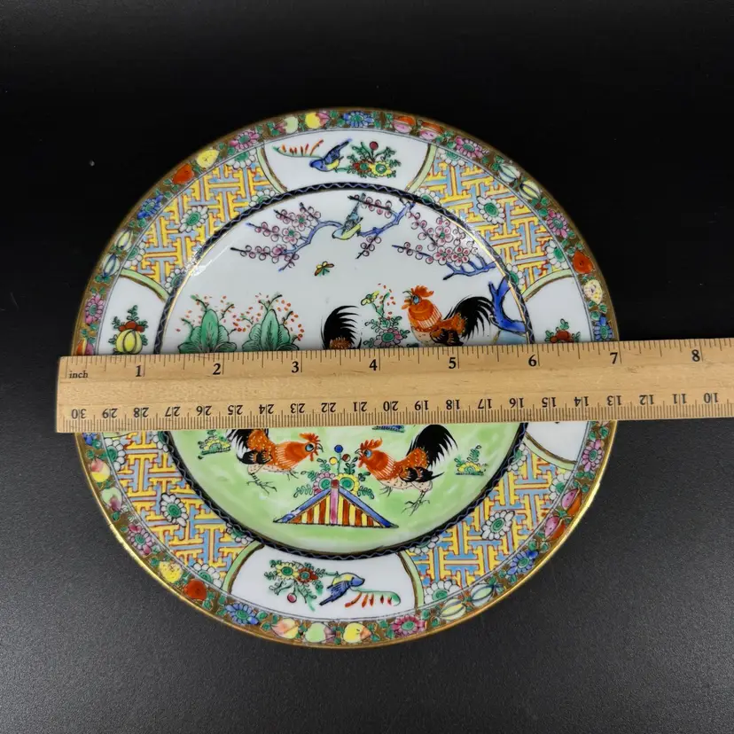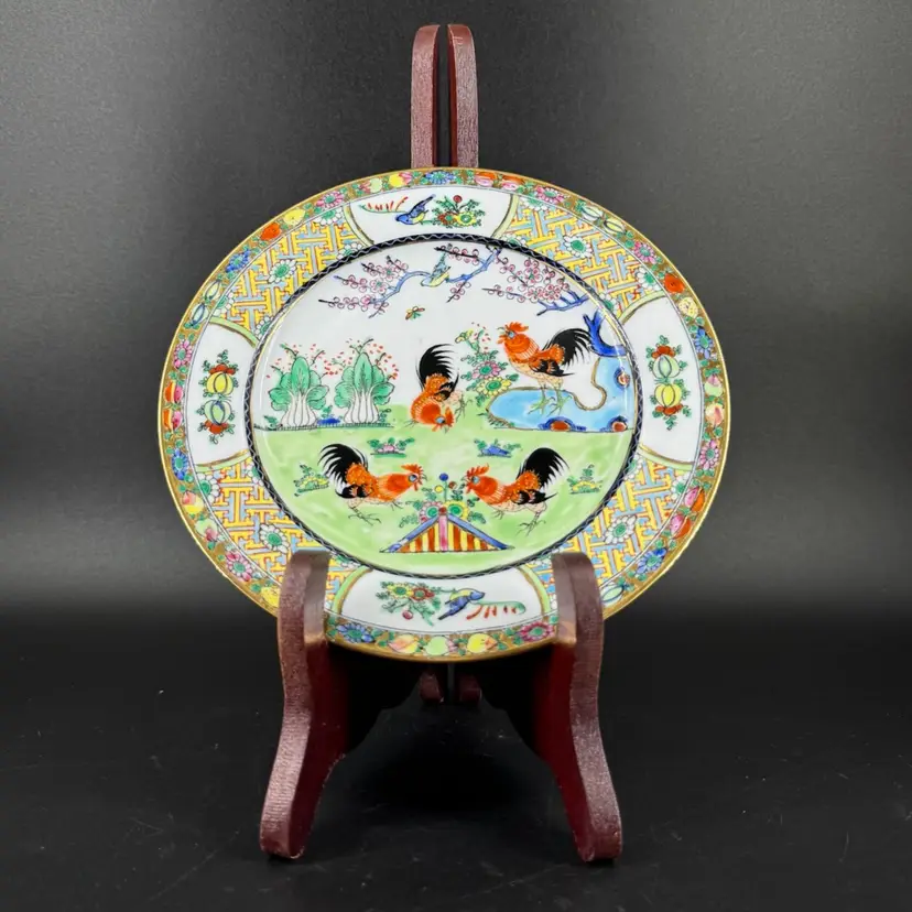 This is a quantity listing. This vintage Chinese porcelain famille Verte rooster plates are approximately 7”. There are no chips or cracks on any of them. They are marked on the bottom “Made in China”. Stand is not included with plate.