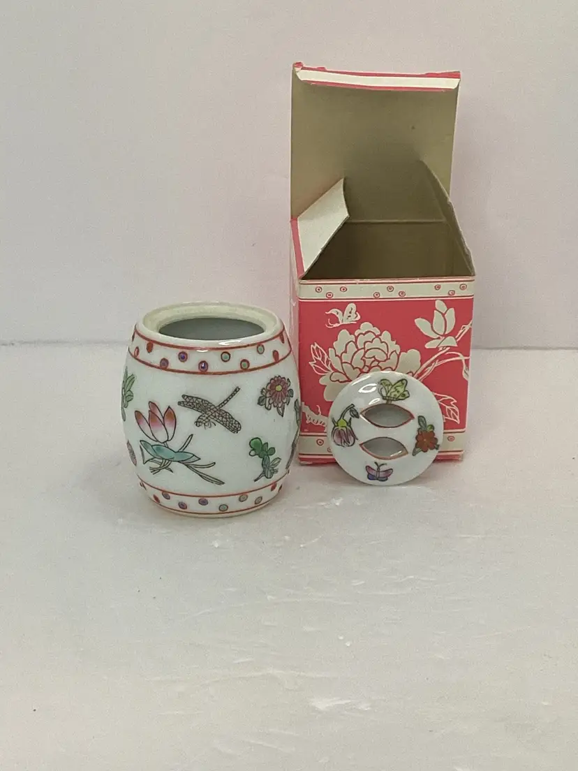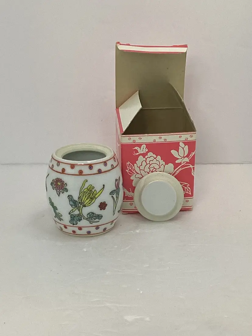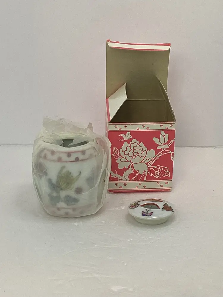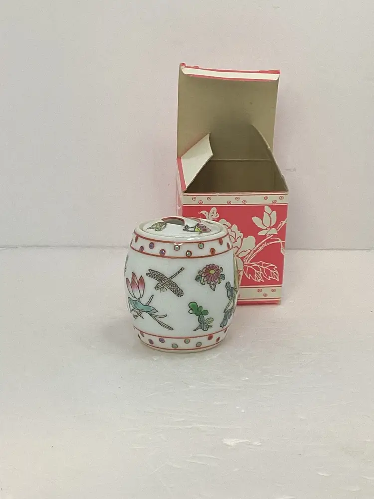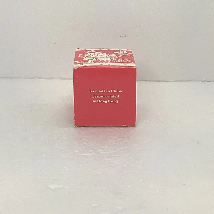 This jar has no cracks, chips, or repairs. It comes with lid and original box with original tissue paper as pictured. The box has the usual wear that comes with age. It measures 2.5” tall and 2.5” in diameter.