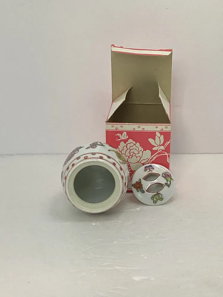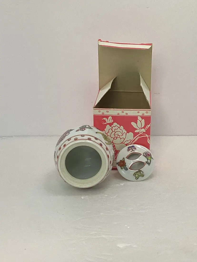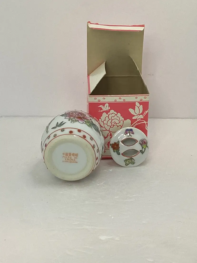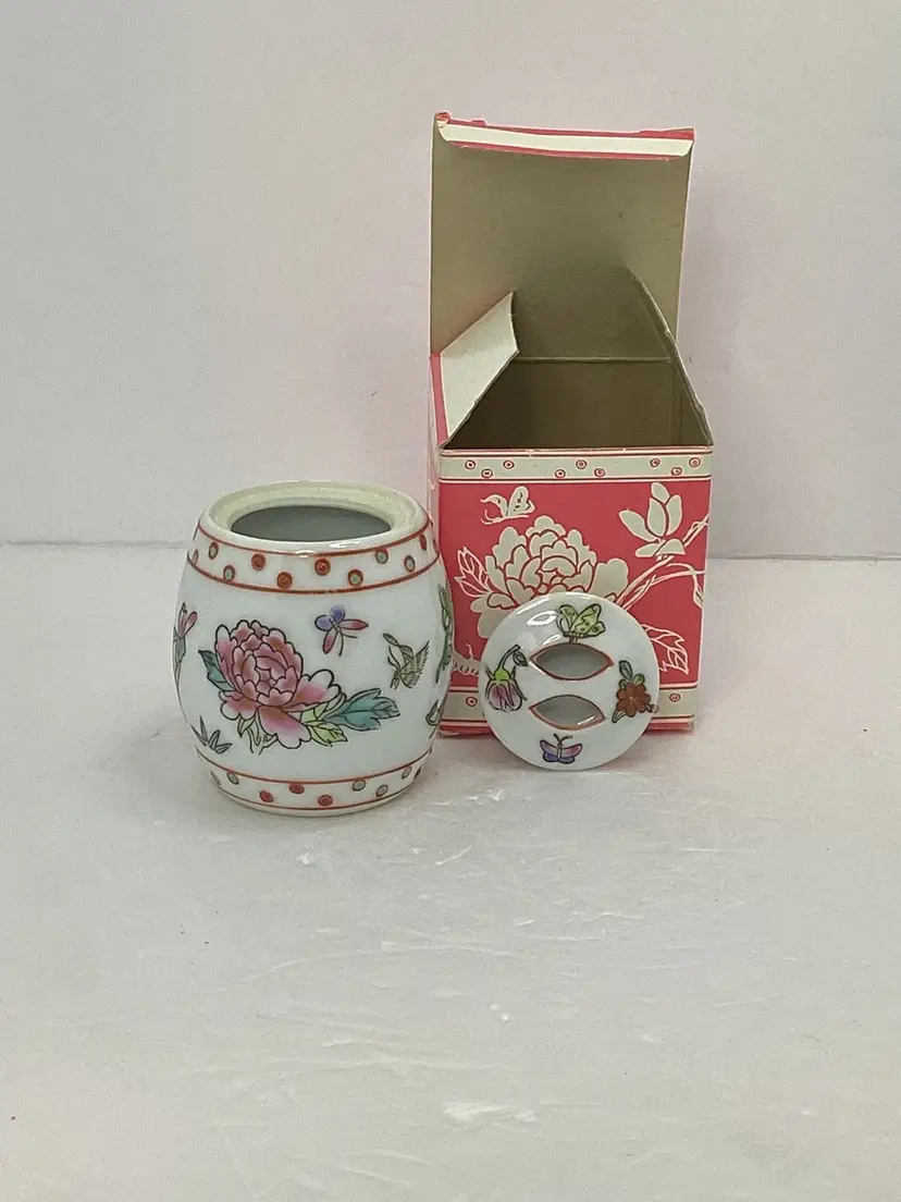 This jar has no cracks, chips, or repairs. It comes with lid and original box with original tissue paper as pictured. The box has the usual wear that comes with age. It measures 2.5” tall and 2.5” in diameter.
