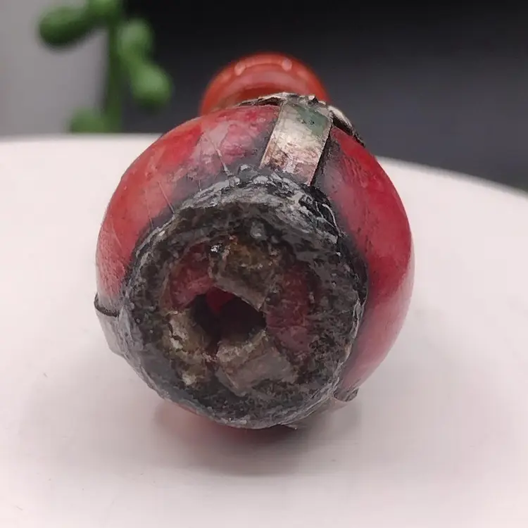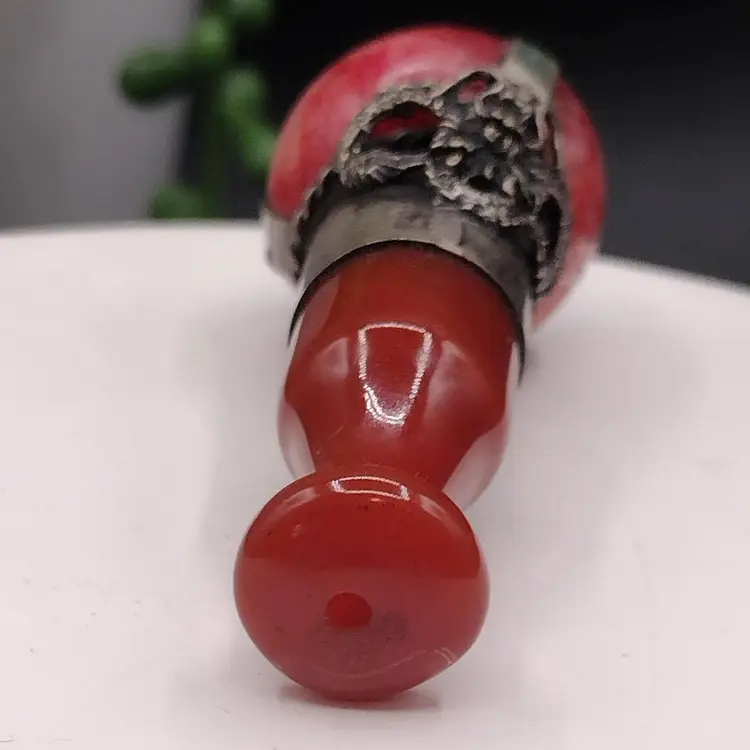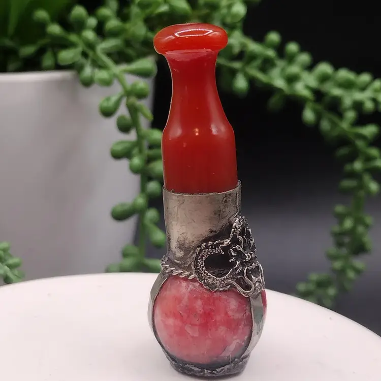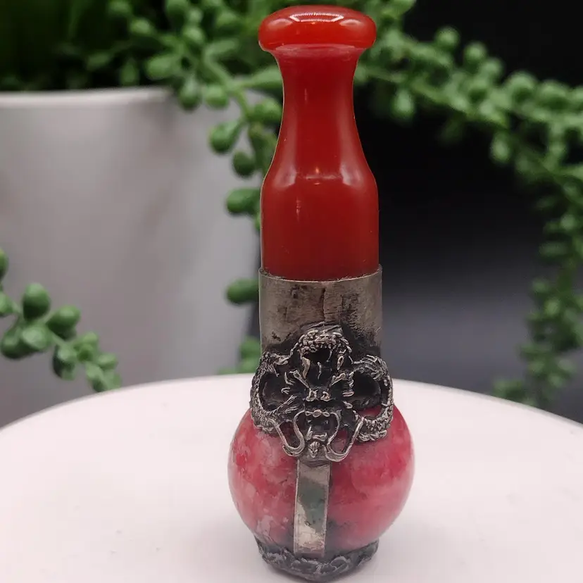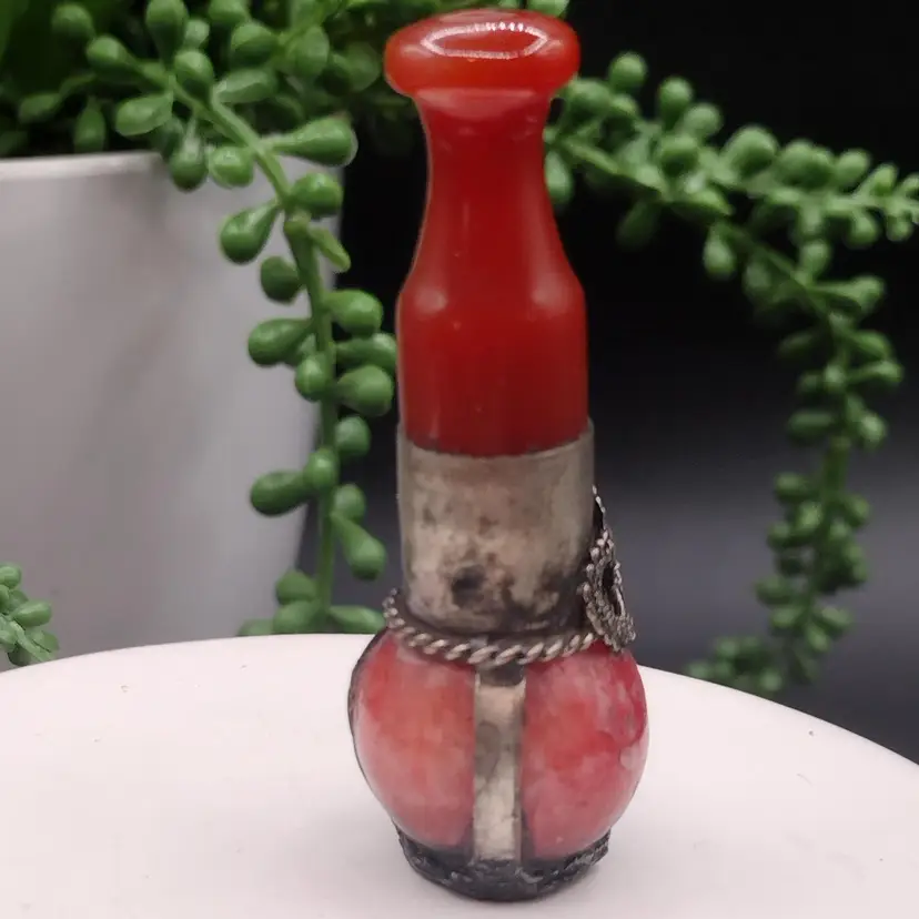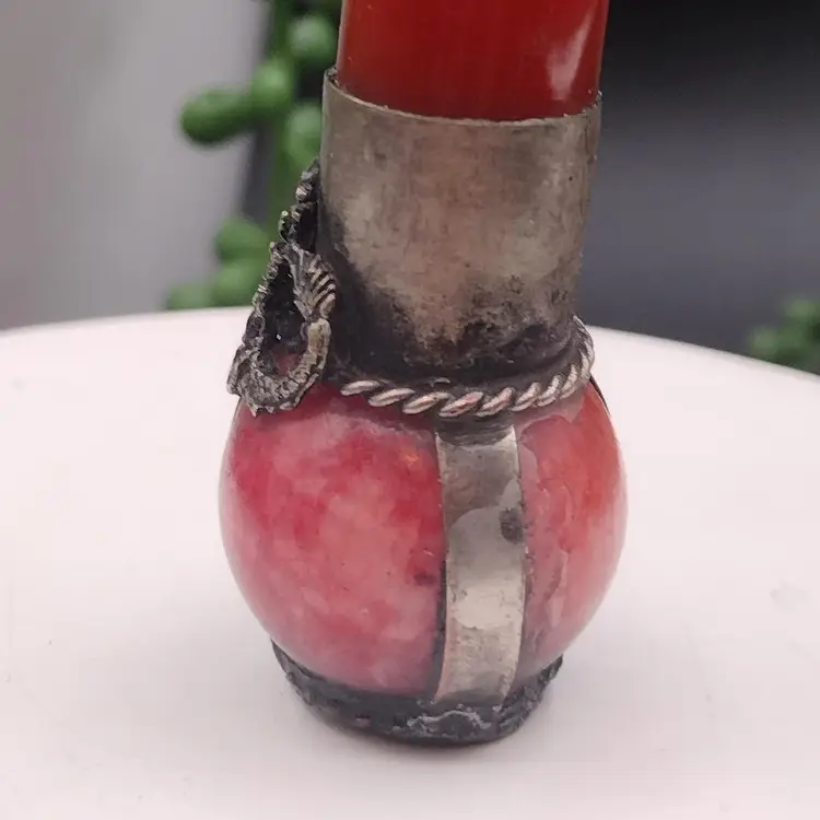 This vintage Chinese pipe mouthpiece features a vibrant red stone, likely jasper, set in Tibetan silver. The red stone is complemented by the red color of the pipe, creating a striking and eye-catching piece. The combination of Chinese design elements with Tibetan silver adds a unique cultural flair to this necklace pendant, making it a standout accessory for those who appreciate vintage and antique jewelry.